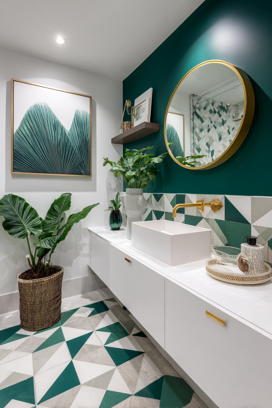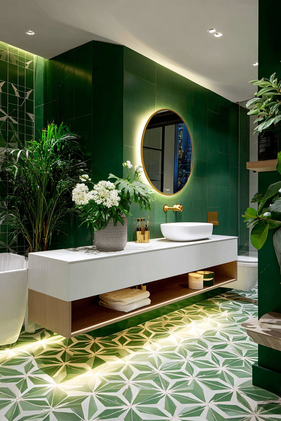 Bold geometric patterned cement tiles in varying shades of green and white create an immediately striking foundation for this modern bathroom design. These patterned floor tiles establish the room’s contemporary aesthetic from the ground up, their complex geometric designs adding visual interest and sophistication that elevates the entire space. The varying shades of green within the tile pattern create depth and prevent monotony while maintaining color cohesion throughout the room.