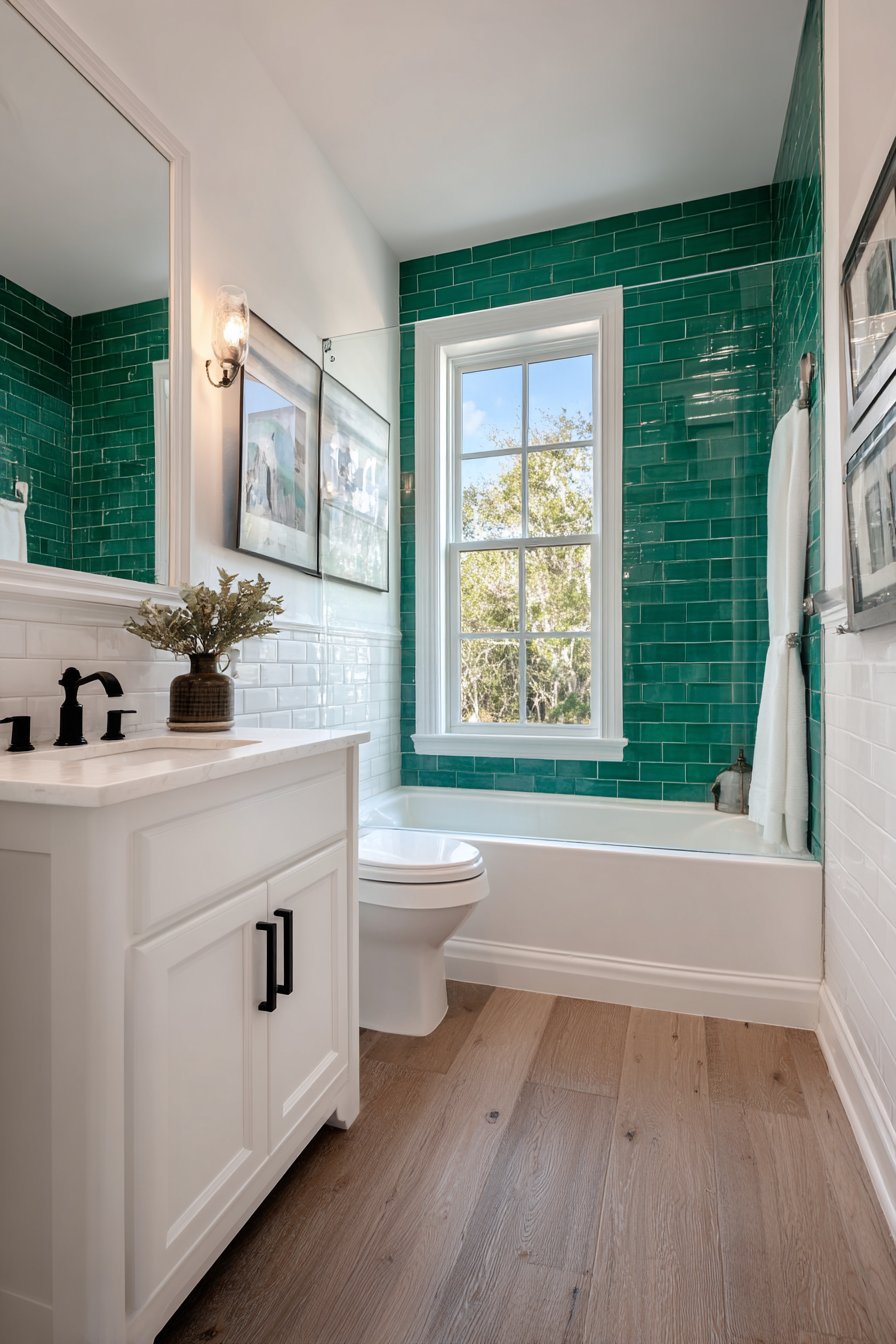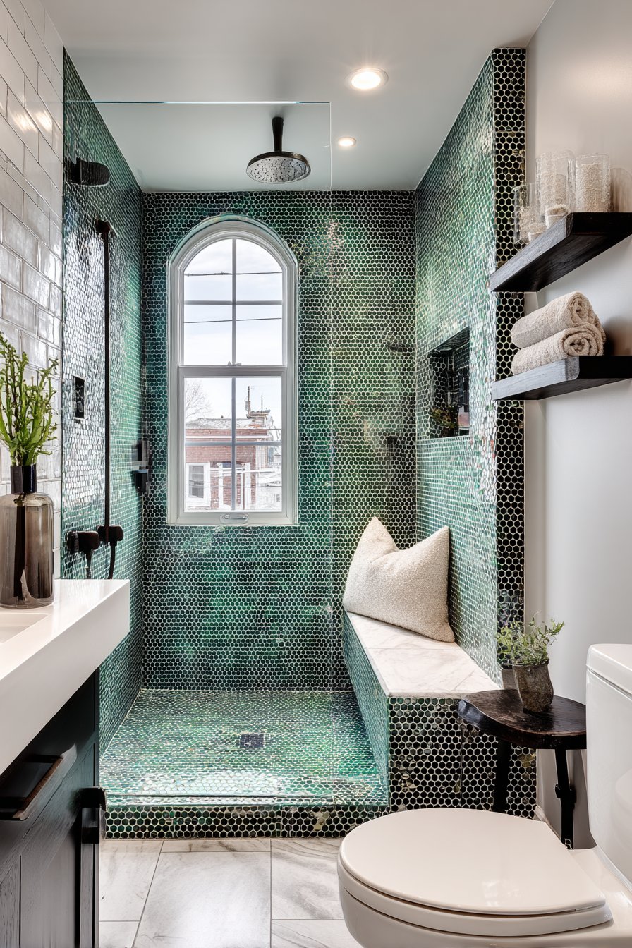 Jewel-toned emerald green penny tiles create a stunning focal wall in the shower surround, demonstrating how bold color application in a defined area can create dramatic impact without overwhelming a small bathroom. The small circular format of penny tiles creates a distinctive texture and pattern that’s both retro-inspired and thoroughly contemporary. The emerald color choice—a rich, saturated green with blue undertones—brings depth and luxury that makes the shower area feel like a special retreat within the larger bathroom.