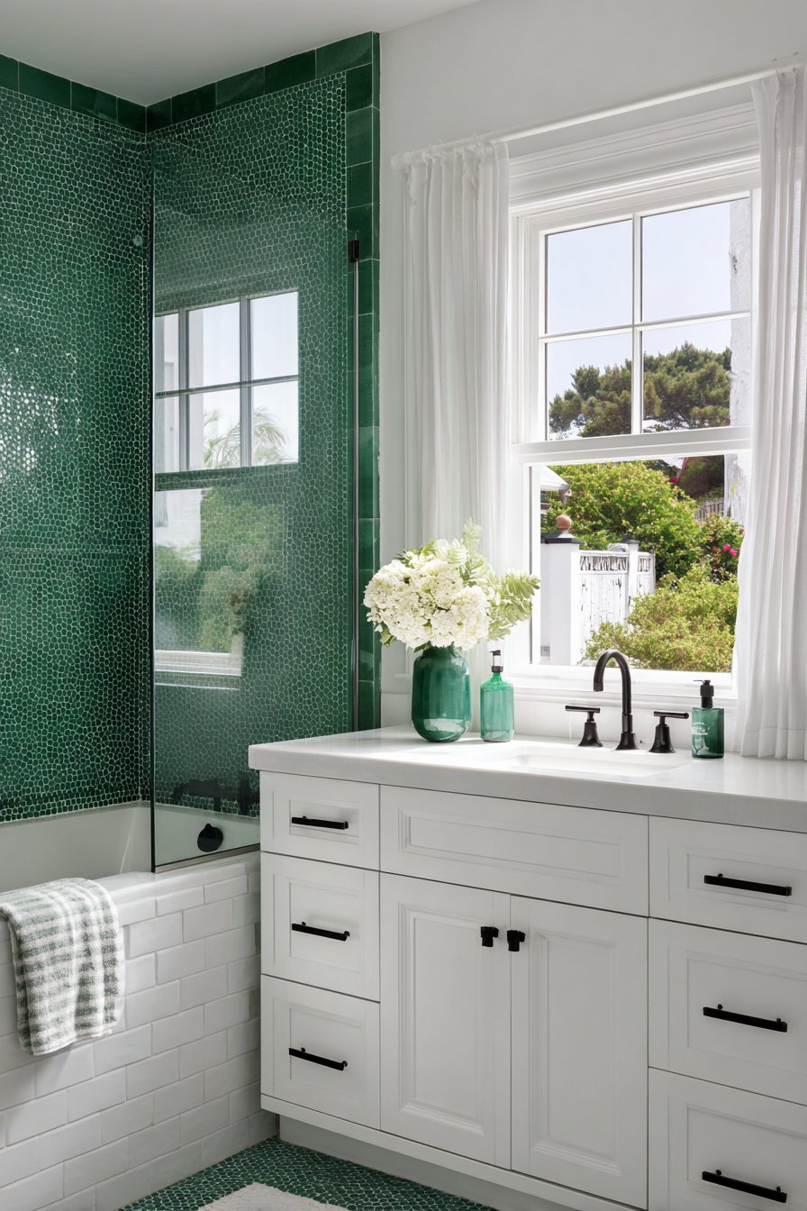 White subway tiles cover the remaining walls, maintaining brightness and preventing the intense emerald from dominating the entire space. This strategic color blocking approach allows you to use bold colors you love without committing to them throughout the entire room. The white tiles also echo the rounded shape of the penny tiles through their rectangular format, creating subtle geometric conversation between the different tiled areas.