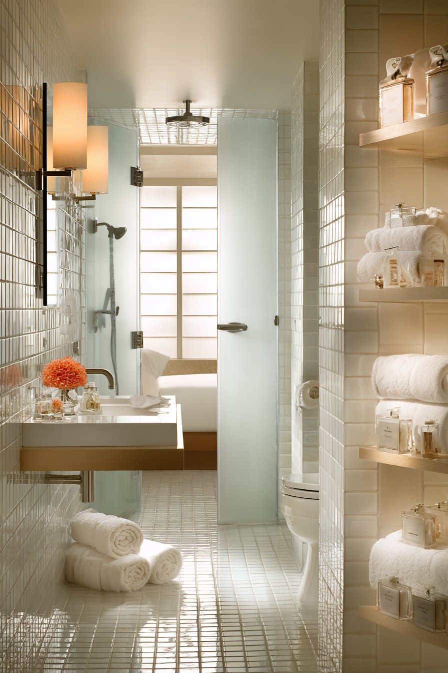 Lighting plays a crucial role in this design’s success, with natural light streaming through a frosted window providing privacy without sacrificing brightness, while recessed lighting offers ambient illumination that can be adjusted for different times of day. The strategic use of vertical space through wall-mounted fixtures and tall storage solutions maximizes functionality without crowding the floor plan. Every element works in harmony to create what guests consistently describe as their favorite room in the house—a private sanctuary that feels both luxurious and intuitive.