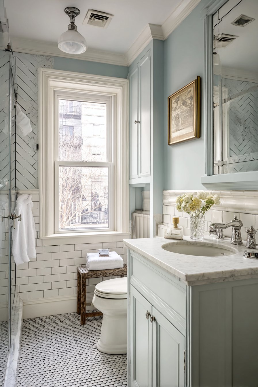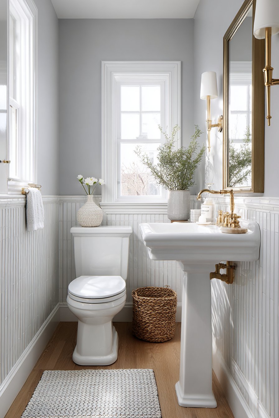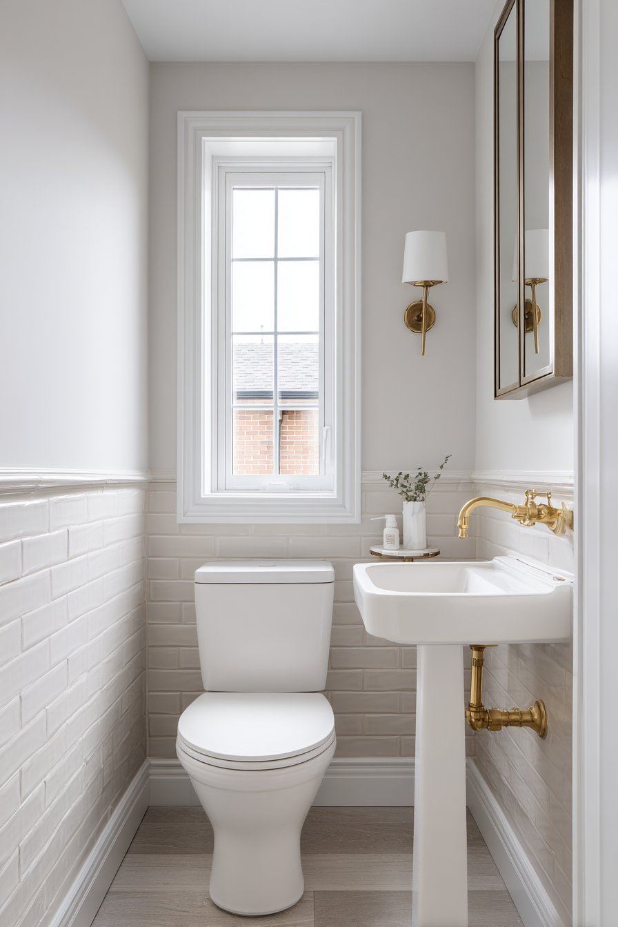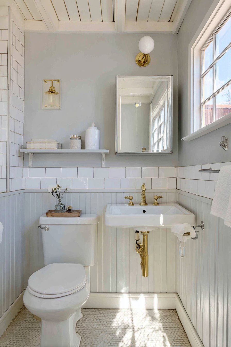 Vintage-inspired brass fixtures inject personality and warmth into the neutral backdrop, proving that even the smallest spaces deserve considered hardware selections that contribute to a cohesive design story. The medicine cabinet with mirrored door serves double duty, reflecting light to brighten the space while providing concealed storage that keeps toiletries organized and countertops clear. Natural daylight from a small window becomes amplified through the reflective surfaces, creating an airy atmosphere that defies the room’s modest dimensions.