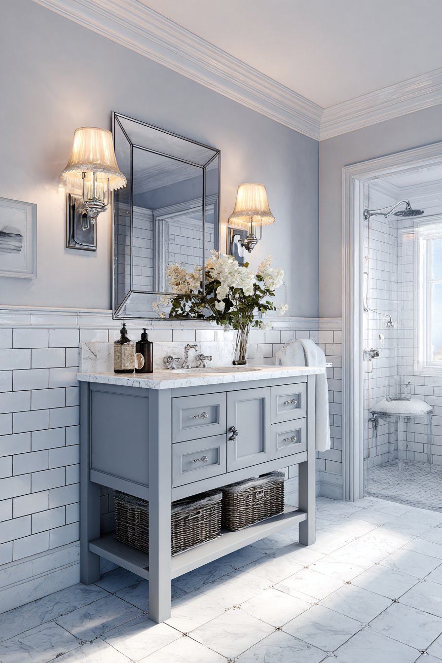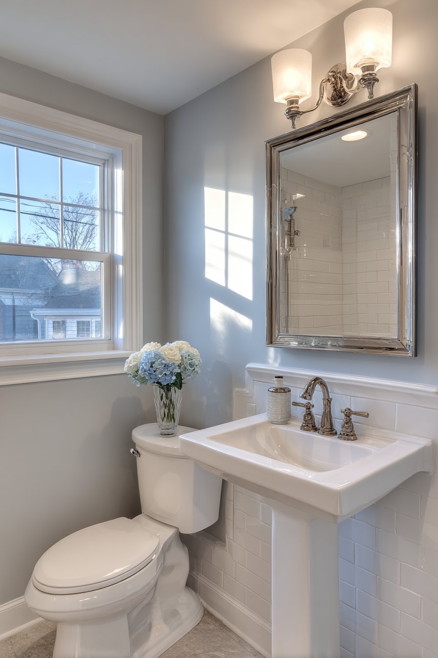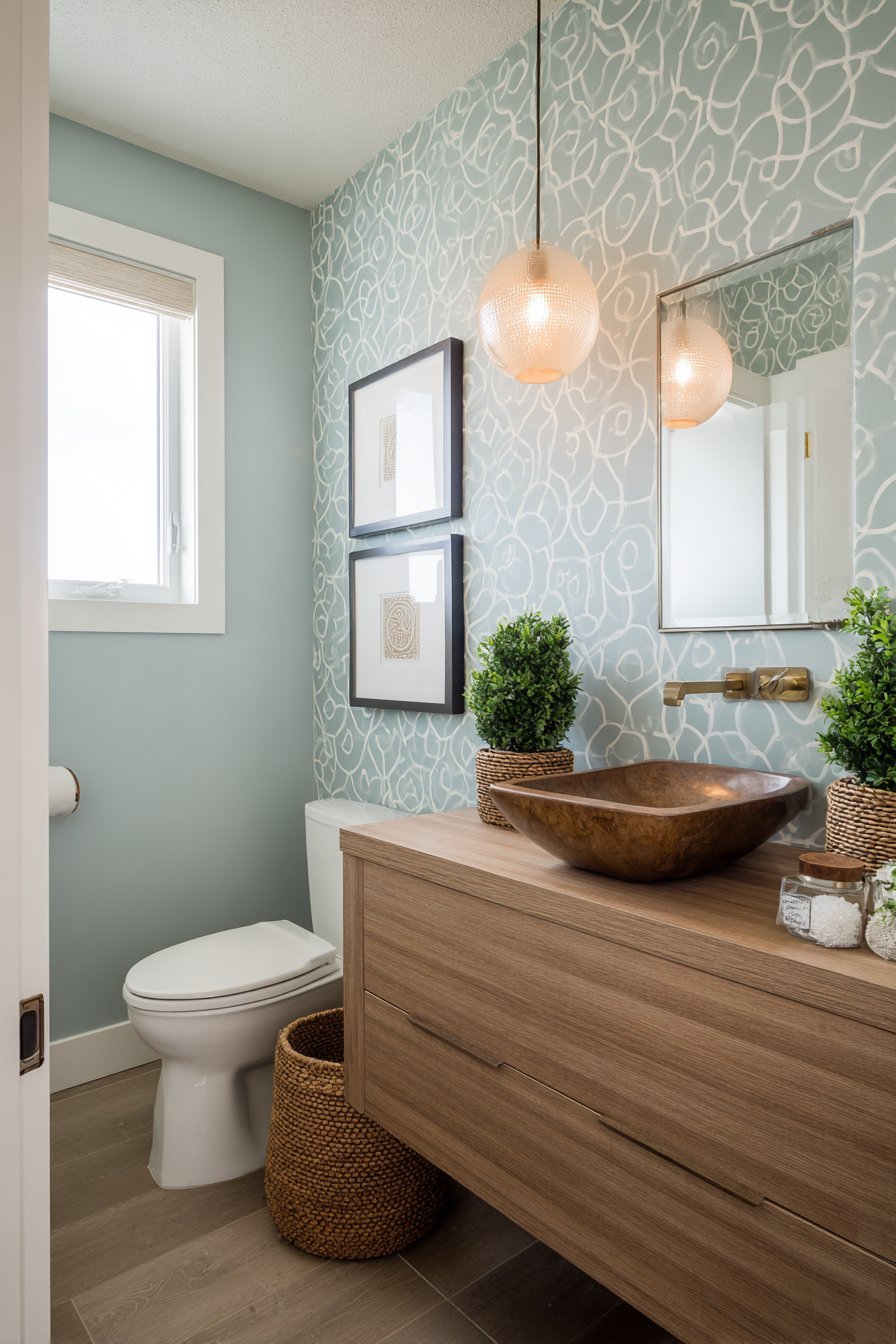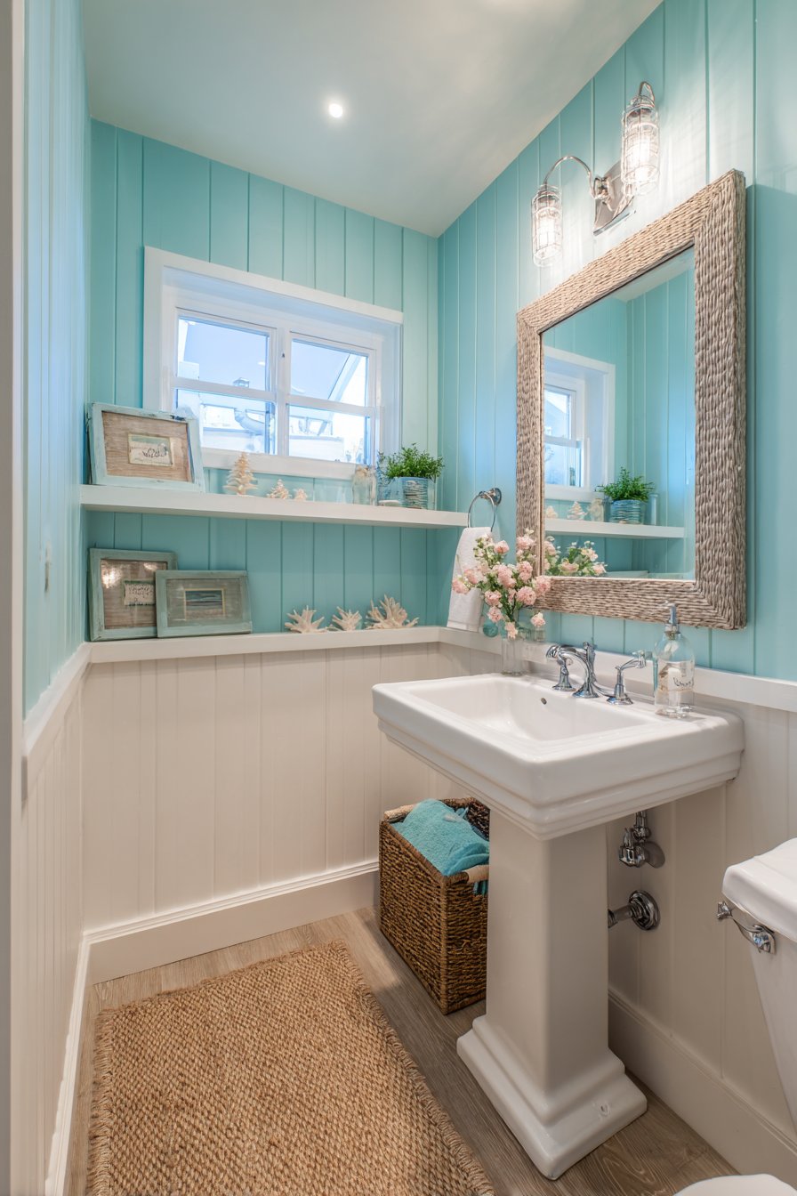 A natural jute rug introduces additional organic texture underfoot while its neutral tone grounds the blue walls and prevents the color from feeling too sweet or juvenile. Soft natural lighting from a window combined with a brushed nickel wall sconce creates layered illumination that transitions beautifully from day to evening. The overall effect is a powder room that feels like a breath of fresh sea air—relaxing, unpretentious, and universally appealing to guests who may or may not share the homeowner’s love of coastal living.