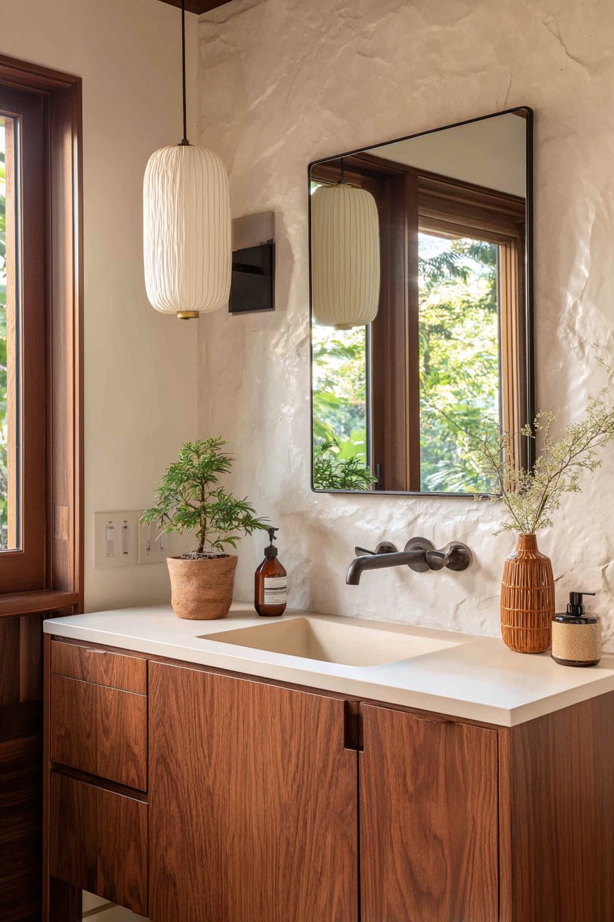 - Frame mirrors in natural wood to warm the space and create continuity