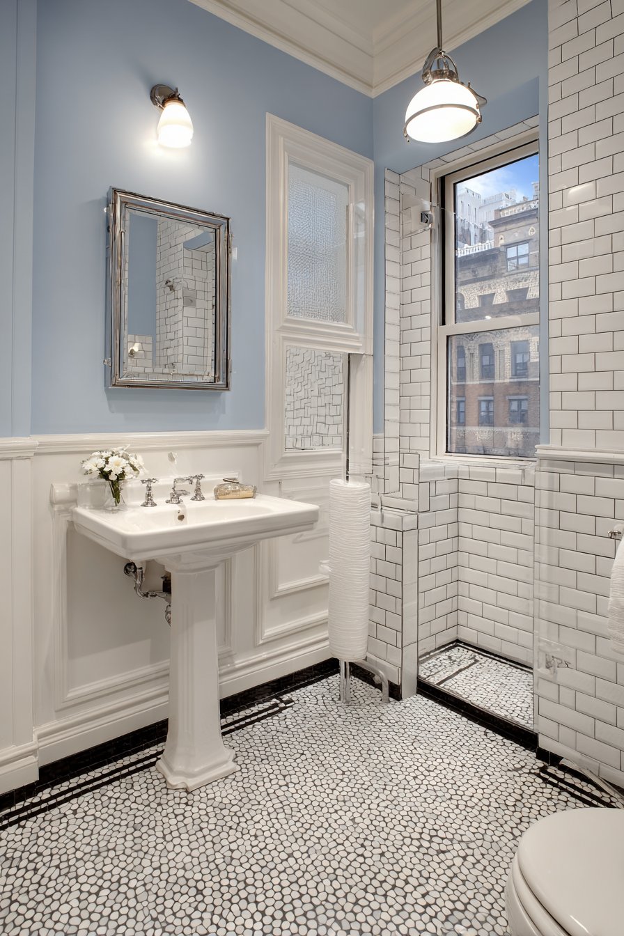 The compact pedestal sink continues the space-saving theme without sacrificing style, its classic silhouette adding architectural interest while keeping sightlines open. Light gray walls paired with white subway tile wainscoting create dimension through subtle contrast, with the horizontal tile orientation making narrow walls appear wider. This clever use of visual tricks transforms what could feel like a cramped corridor into a thoughtfully designed boutique bathroom that guests appreciate for its efficiency and charm.