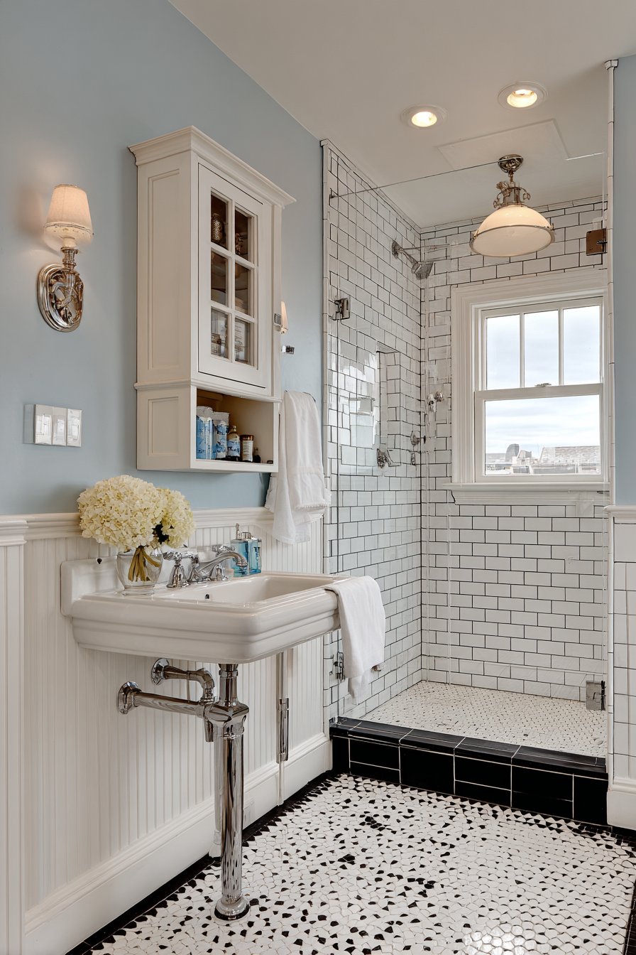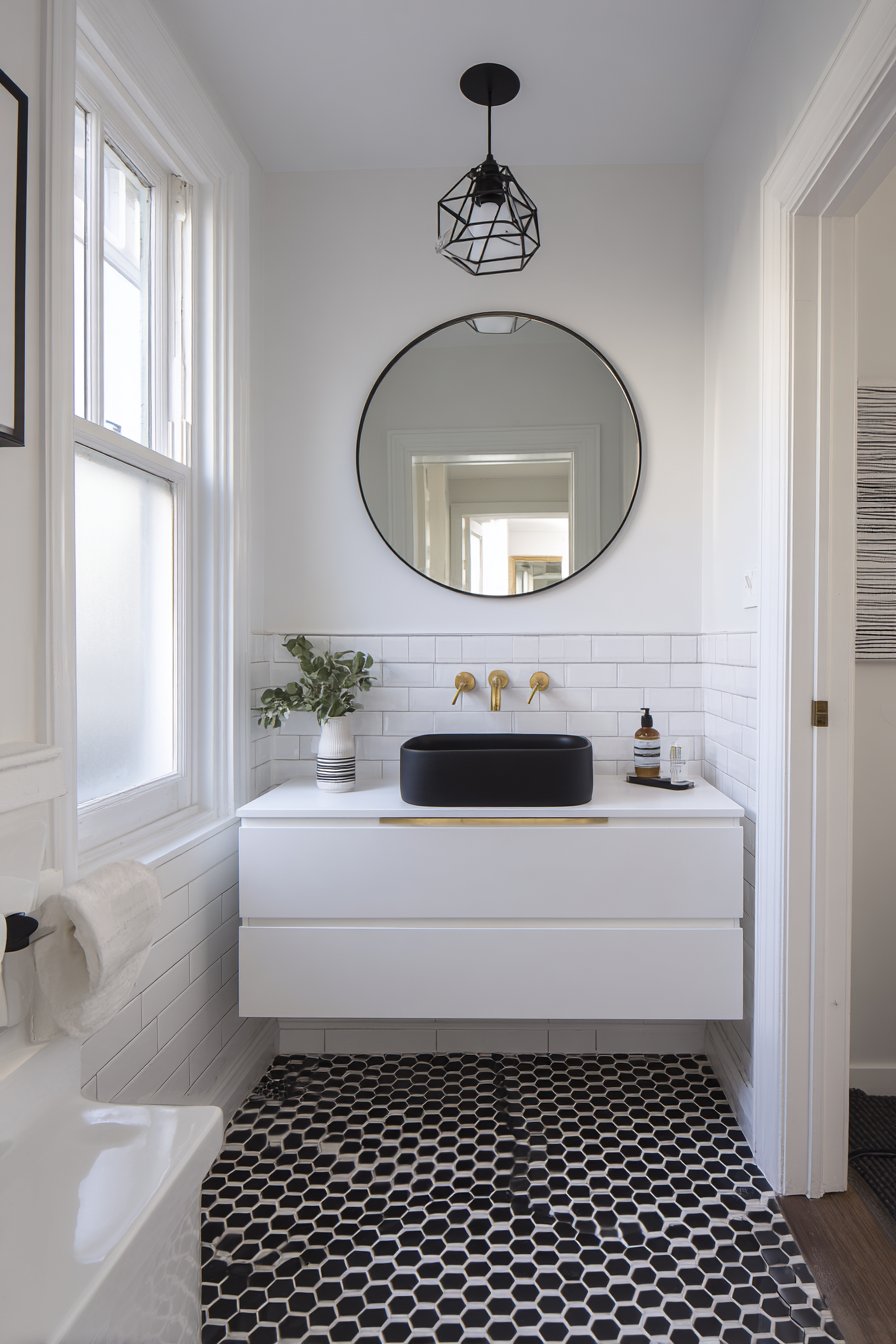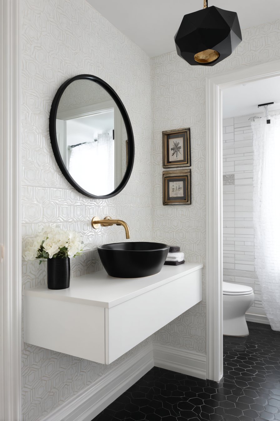 Bold pattern makes its entrance in this cozy half-bath where black and white geometric cement tiles create immediate visual impact underfoot. These striking floors become the room’s personality, allowing walls and fixtures to remain simple and classic, demonstrating the designer’s understanding of when to make a statement and when to exercise restraint. The pattern adds energy and interest to what might otherwise be a forgettable small powder room, proving that even the tiniest spaces deserve memorable design moments.