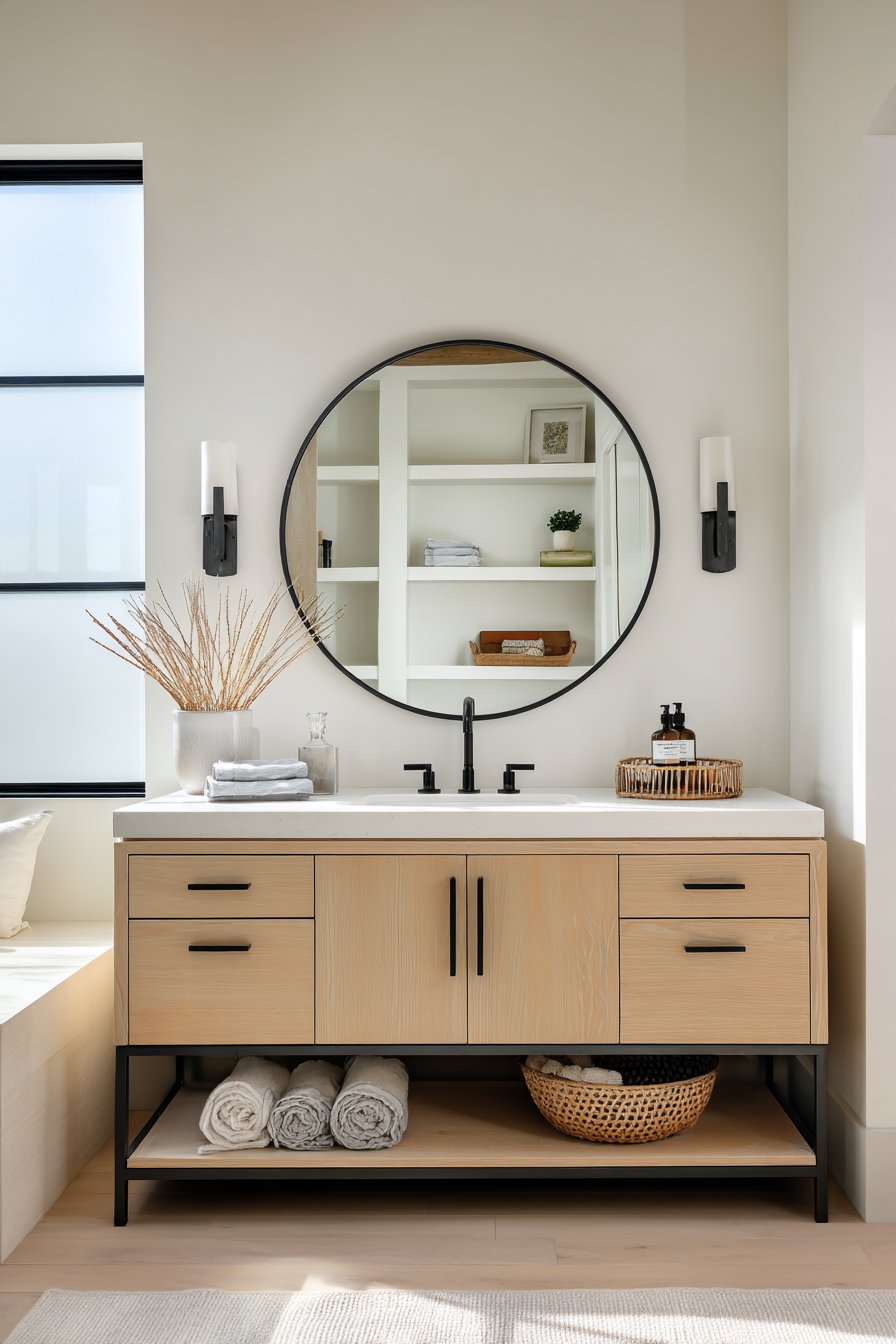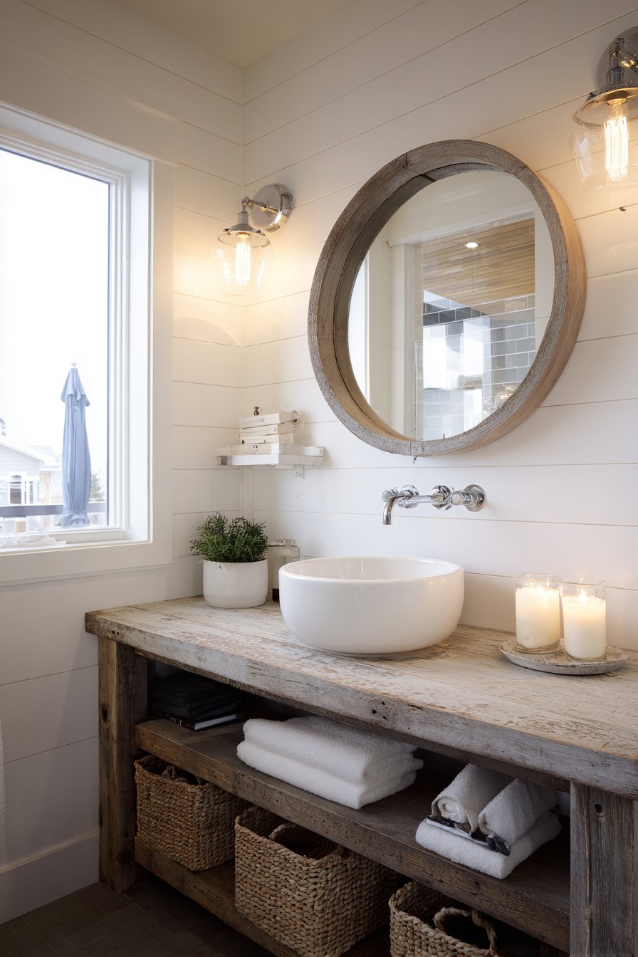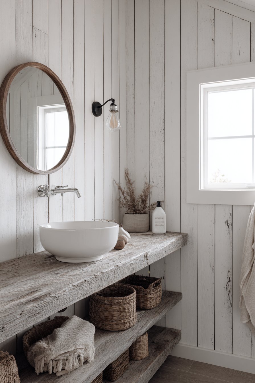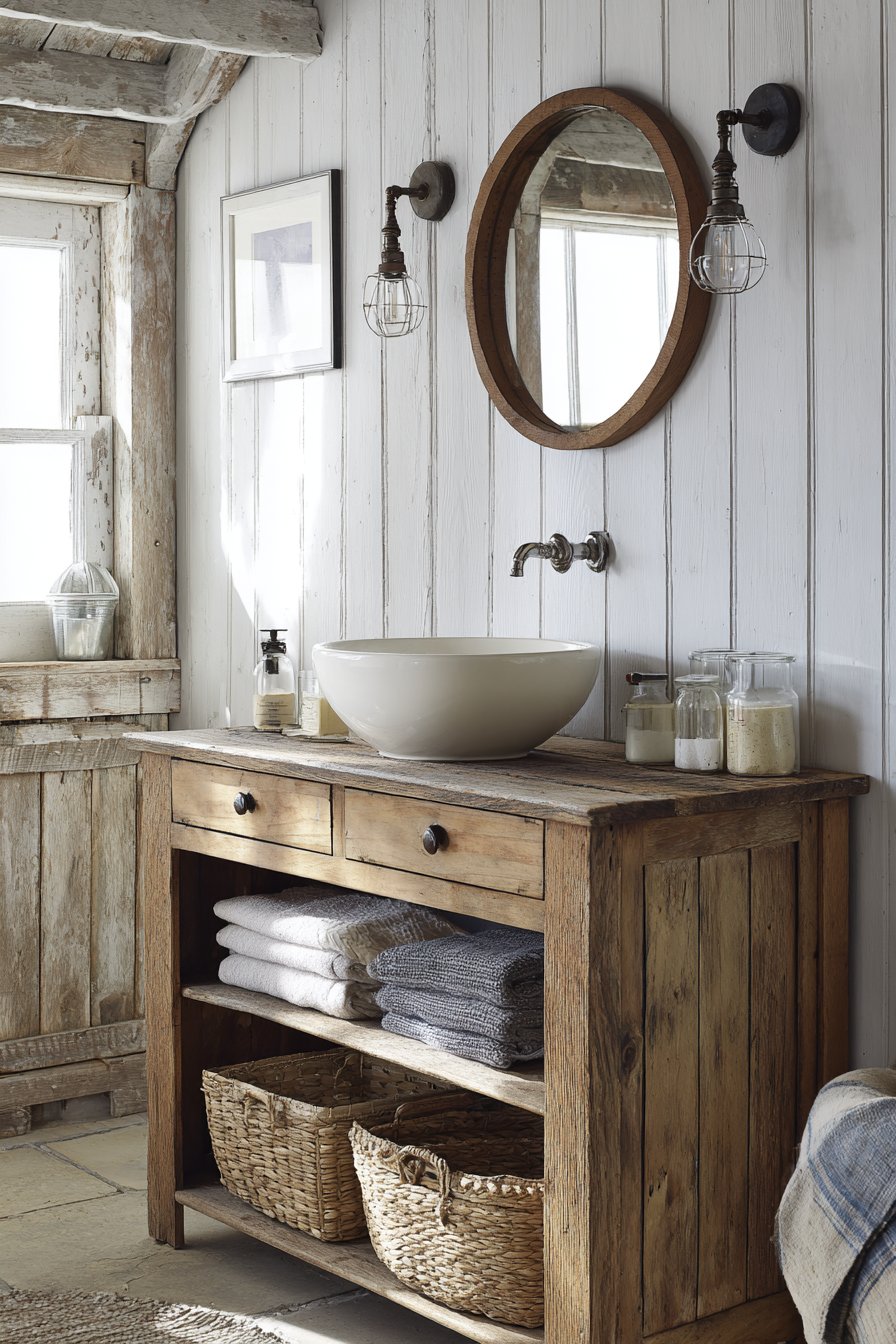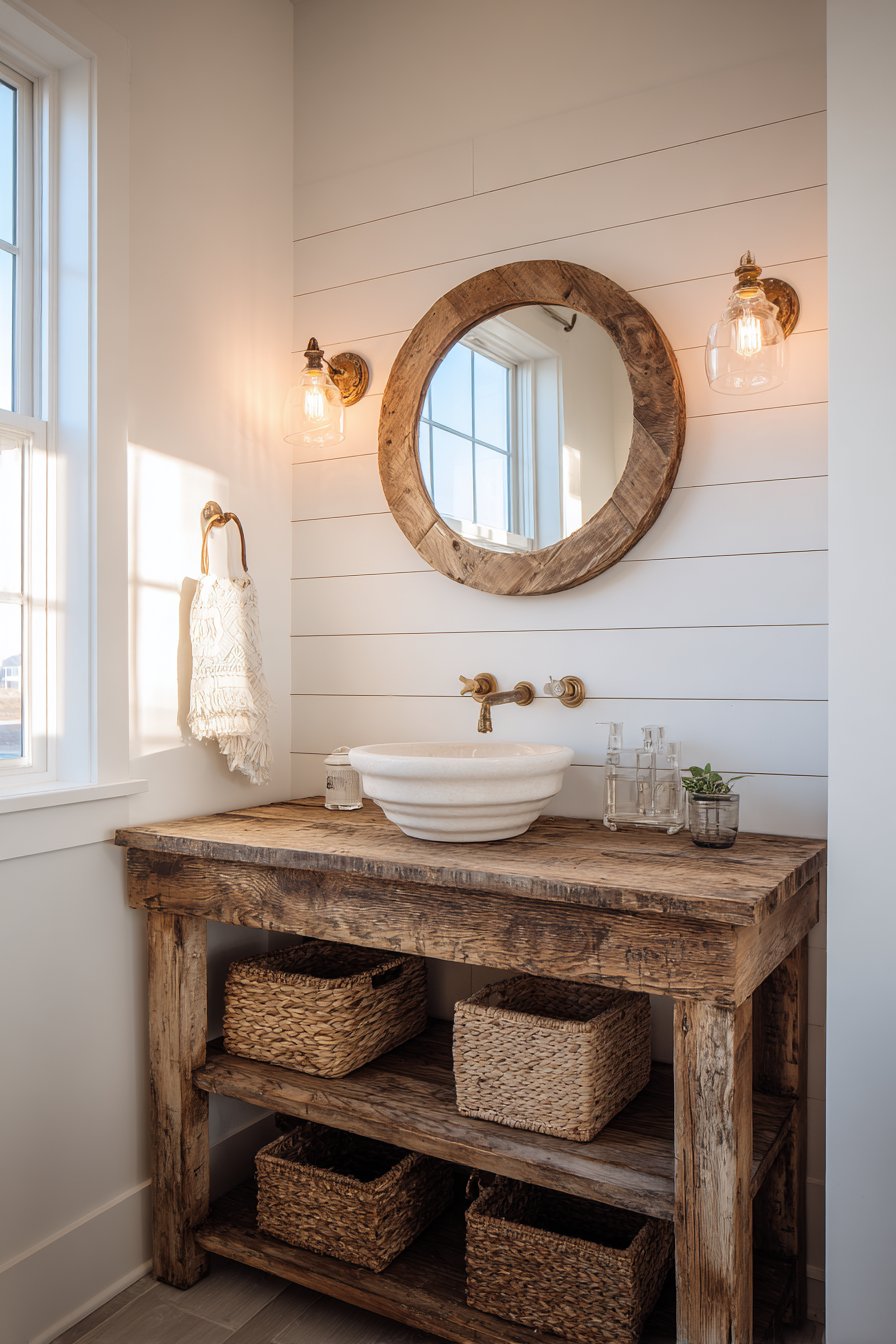 Edison bulb wall sconces flanking a round wooden mirror create symmetrical lighting that’s both practical and atmospheric, their exposed filaments adding industrial edge to the rustic foundation. The mirror’s natural wood frame echoes the vanity below, creating visual continuity that ties the composition together. Open shelving beneath the vanity displays woven baskets that conceal toiletries and cleaning supplies while contributing additional organic texture to the material palette.