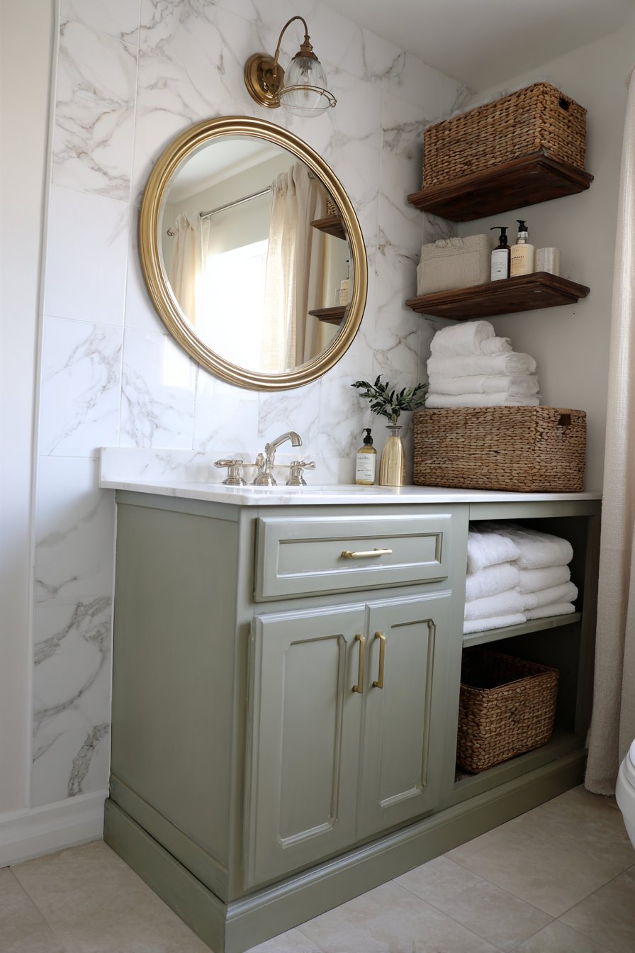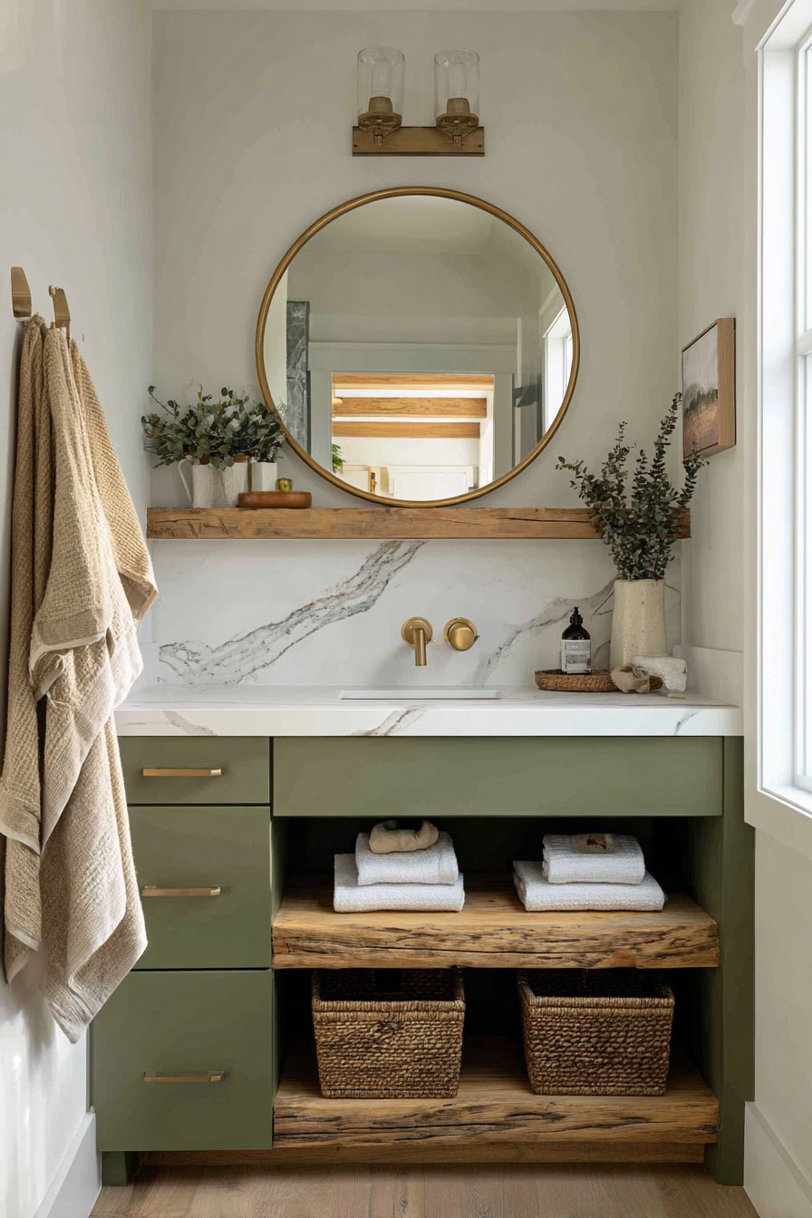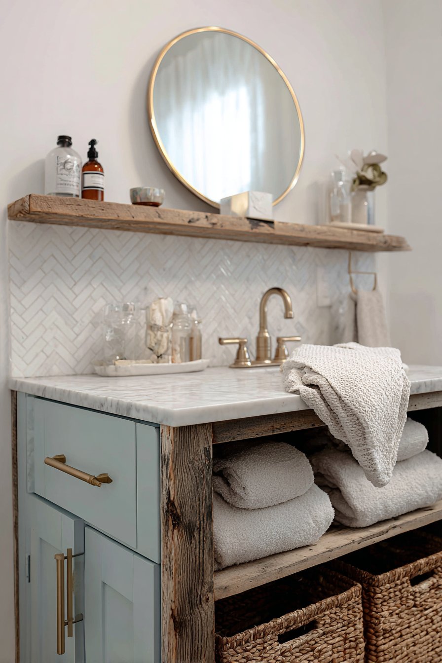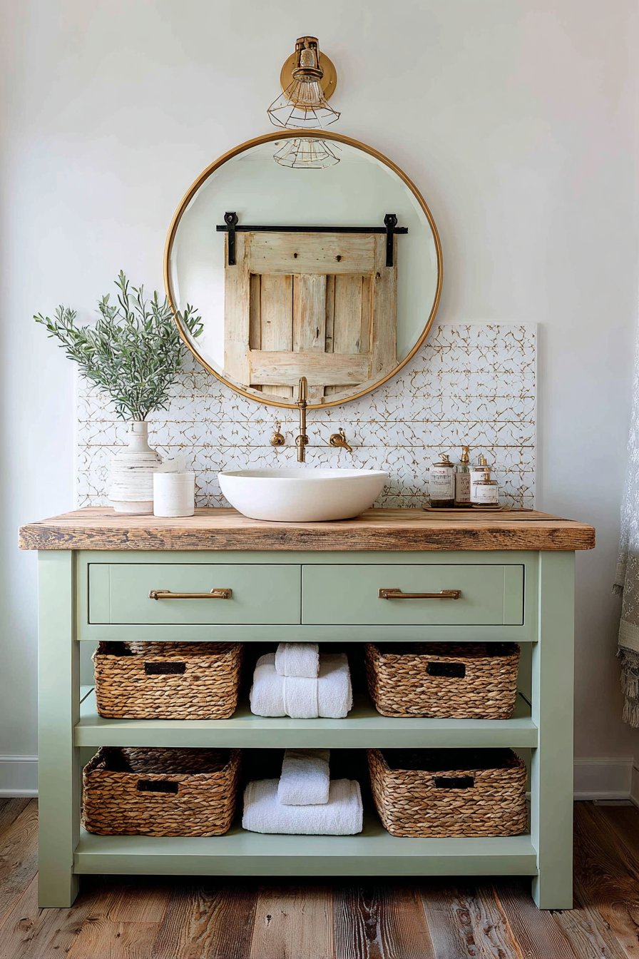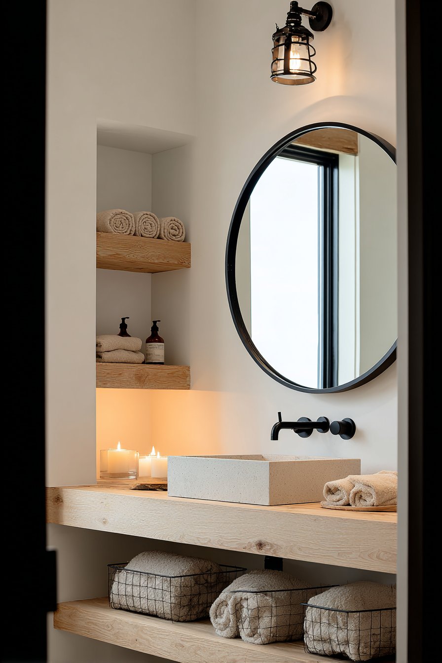 Edison bulb wall sconces flanking a round wooden mirror create symmetrical lighting that’s both practical and atmospheric, their exposed filaments adding industrial edge to the rustic foundation. The mirror’s natural wood frame echoes the vanity below, creating visual continuity that ties the composition together. Open shelving beneath the vanity displays woven baskets that conceal toiletries and cleaning supplies while contributing additional organic texture to the material palette.