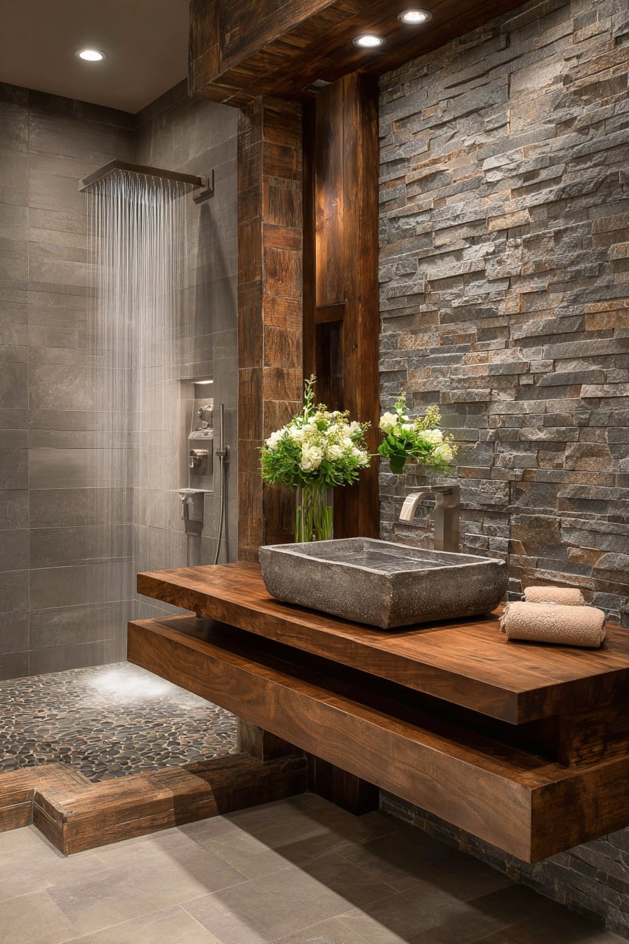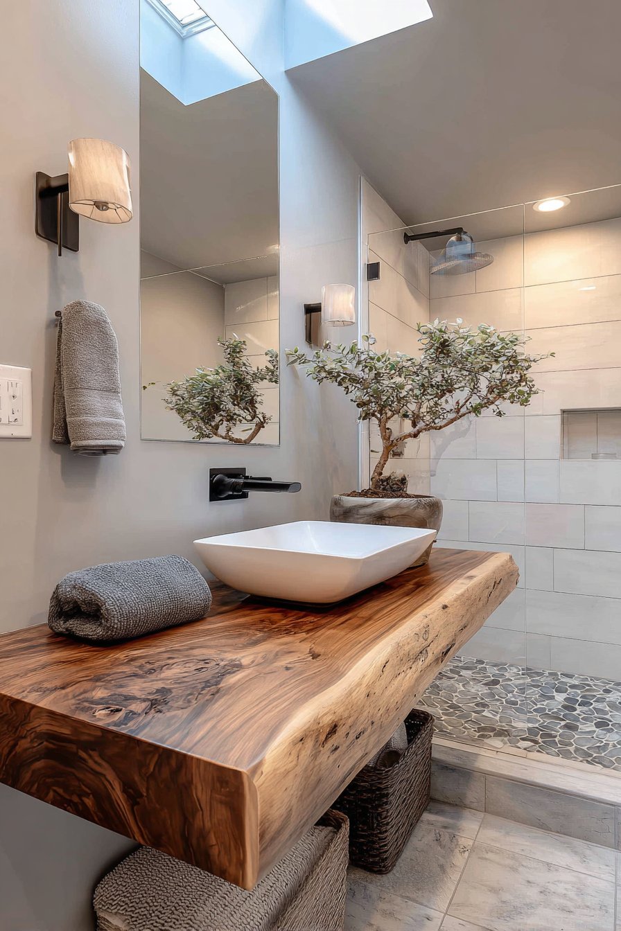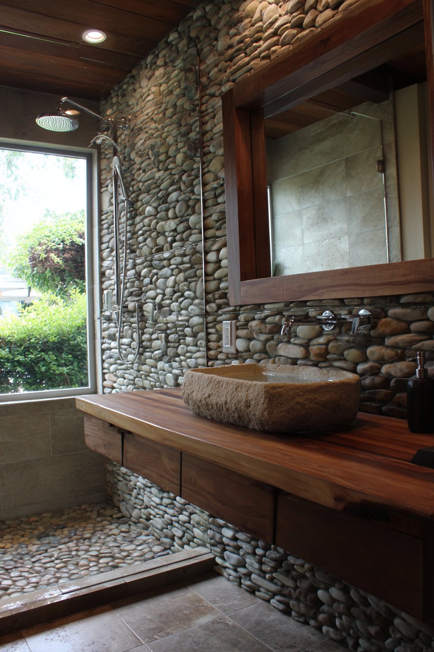 Pebble tile floor in the shower area continues the natural theme, the smooth stones providing pleasant texture underfoot while their appearance reinforces the connection to natural environments. This bathroom demonstrates the power of biophilic design—the integration of nature into built environments—to create spaces that improve mood, reduce stress, and connect occupants to living systems. Guests consistently report feeling refreshed and restored after spending time in this nature-inspired sanctuary.
