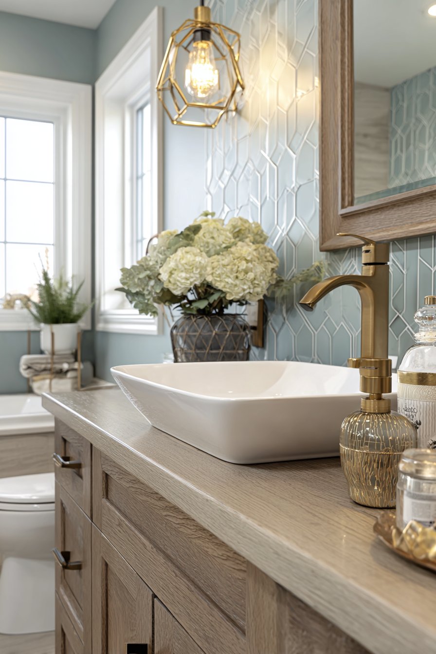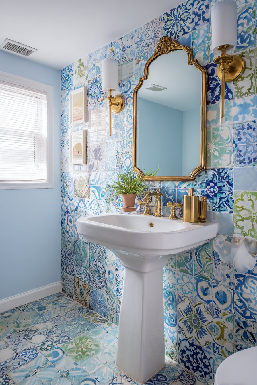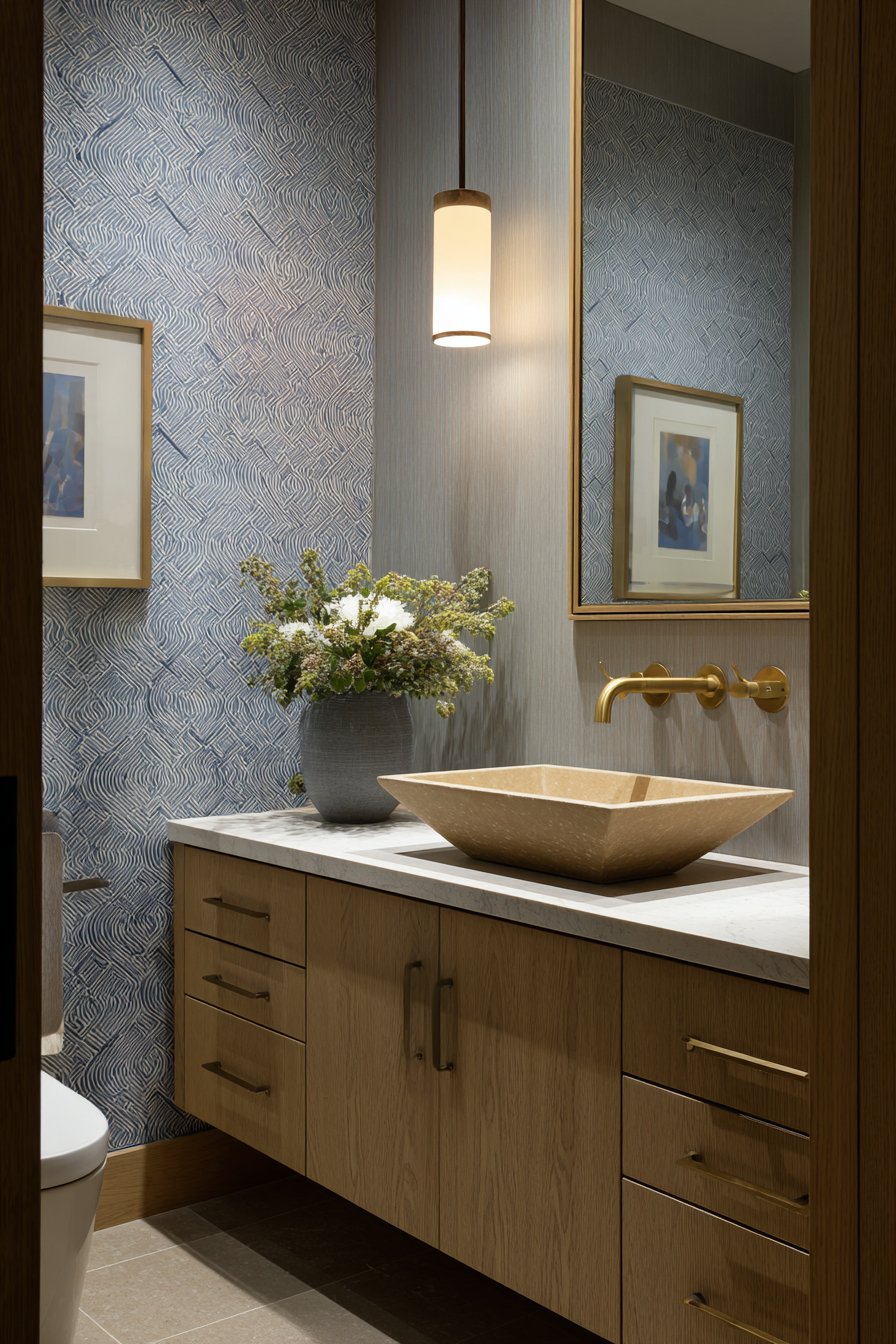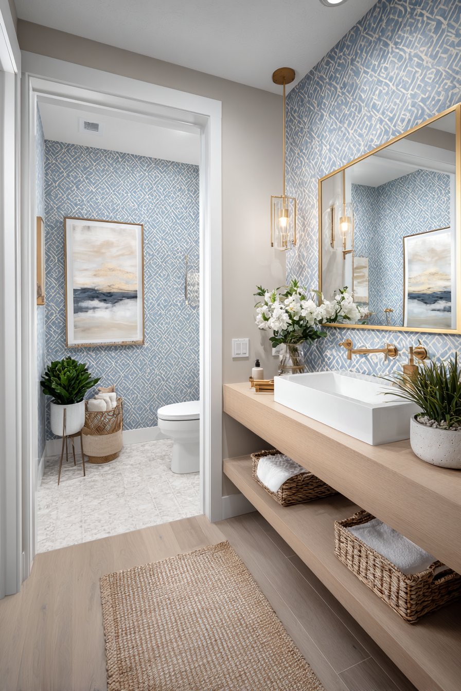 The accent wall behind the vanity showcases geometric tiles in a soft blue and white pattern, introducing just enough visual complexity to create a memorable focal point without overwhelming the compact space. These carefully chosen tiles transform what might be a forgettable powder room into a design statement that sparks conversation while maintaining versatility that won’t tire over time. The brushed gold hardware and fixtures thread throughout the space, their warm metallic finish creating cohesion between disparate elements while adding touches of understated luxury.