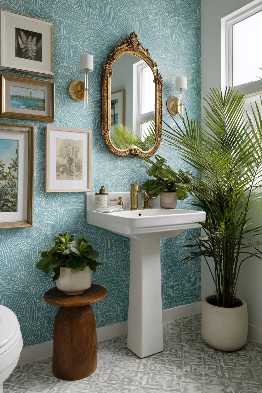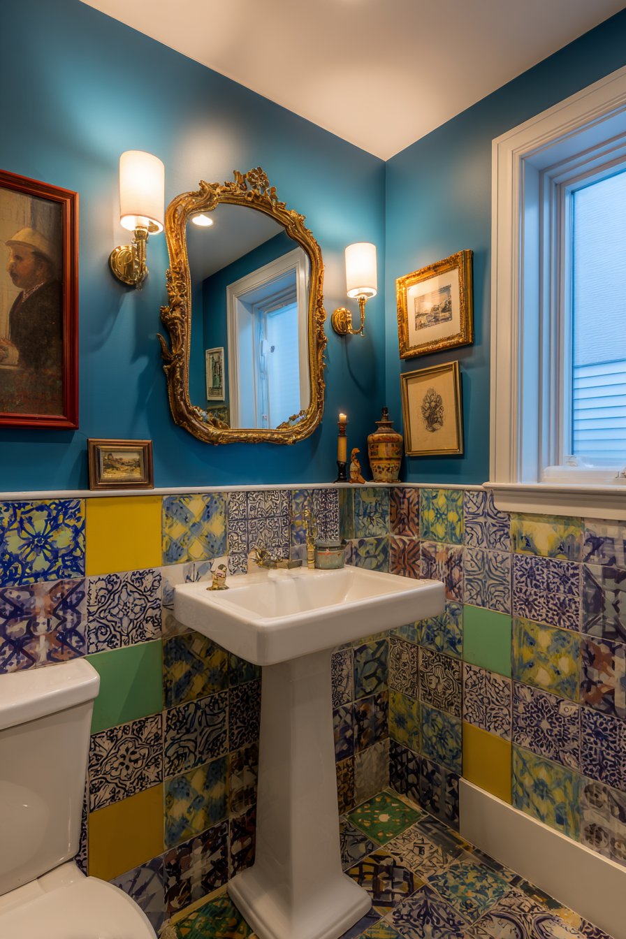 An ornate gold-framed mirror adds vintage charm and reflects the homeowner’s willingness to mix periods, styles, and approaches in service of personal expression. A gallery wall of artwork and decorative objects creates additional layers of interest, each piece chosen for its contribution to the overall composition rather than following rigid matching rules. This collected, curated approach gives the powder room genuine character that manufactured coordination could never achieve.