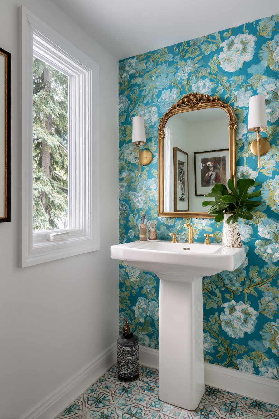 Personality bursts forth in this colorful eclectic powder room where bold patterned wallpaper in vibrant blues and greens creates an immediate mood of joy and confidence. The wallpaper becomes the room’s defining feature, transforming a small functional space into a memorable design moment that guests discuss and remember long after their visit. A white pedestal sink keeps the plumbing simple and classic, its straightforward form providing visual rest amidst the pattern while maintaining functionality.