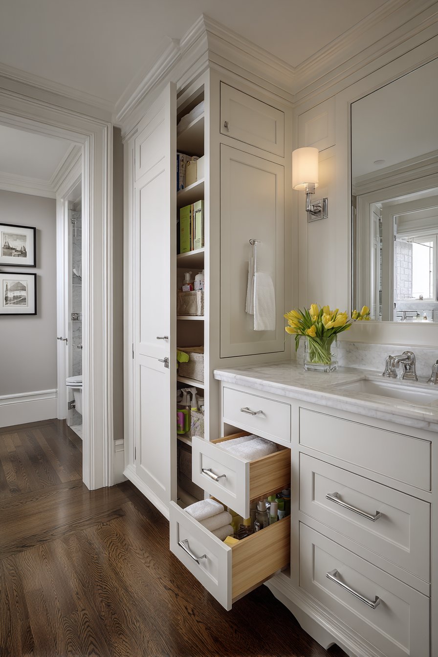 Organizational excellence defines this smart storage guest bathroom where floor-to-ceiling built-in cabinetry in white shaker style maximizes every inch of available space. The custom cabinetry proves that spare bathrooms can be as functional as primary baths when storage is planned thoughtfully from the beginning. A pocket door saves space in the tight layout, its sliding mechanism eliminating the floor space required for traditional swinging doors—a particularly valuable strategy in compact bathrooms.