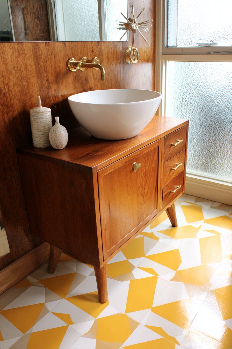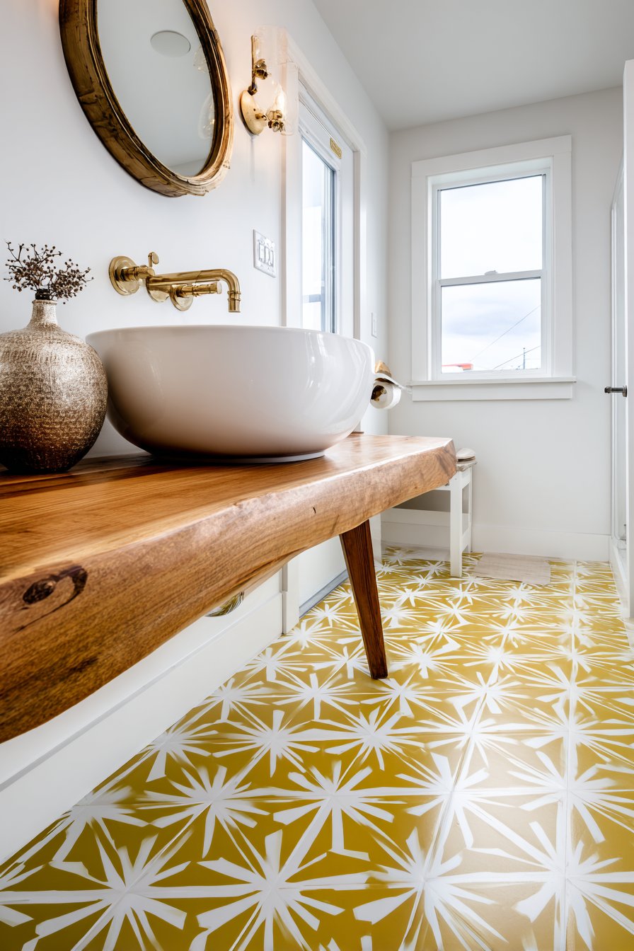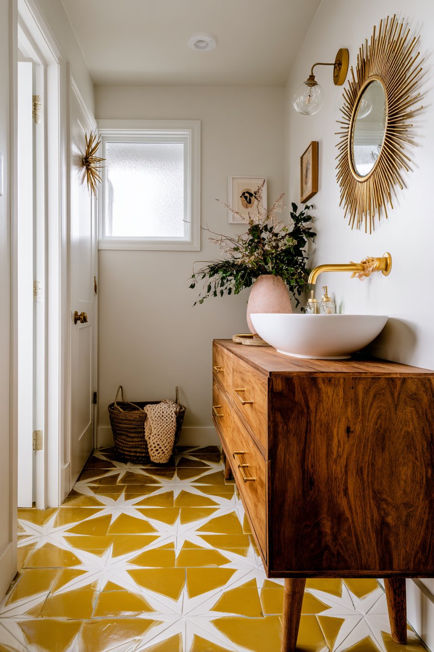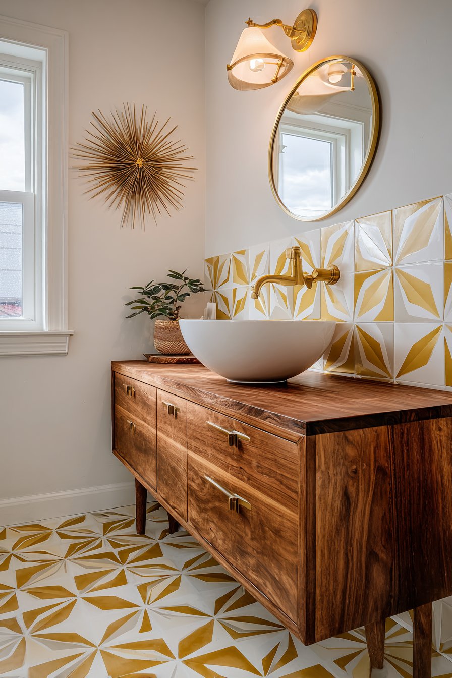 Brass faucet and cabinet pulls maintain period authenticity while their warm metallic finish complements the walnut’s rich tones perfectly. Geometric patterned floor tiles in mustard yellow and white add retro flair and period-appropriate color, their pattern scale and color choices directly referencing mid-century design sensibilities. A starburst mirror and atomic-inspired wall sconce complete the vintage aesthetic, their distinctive forms immediately recognizable as period pieces.