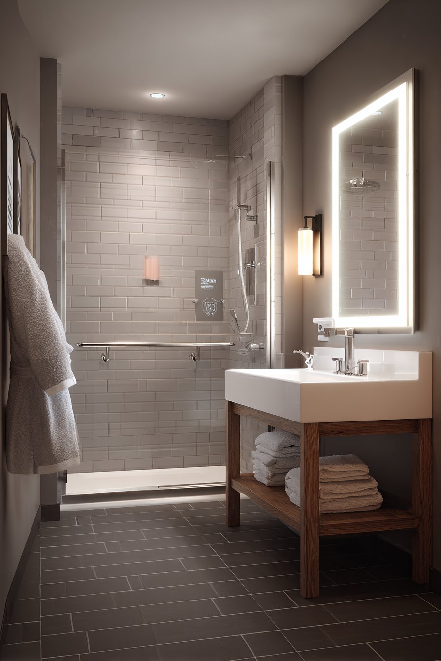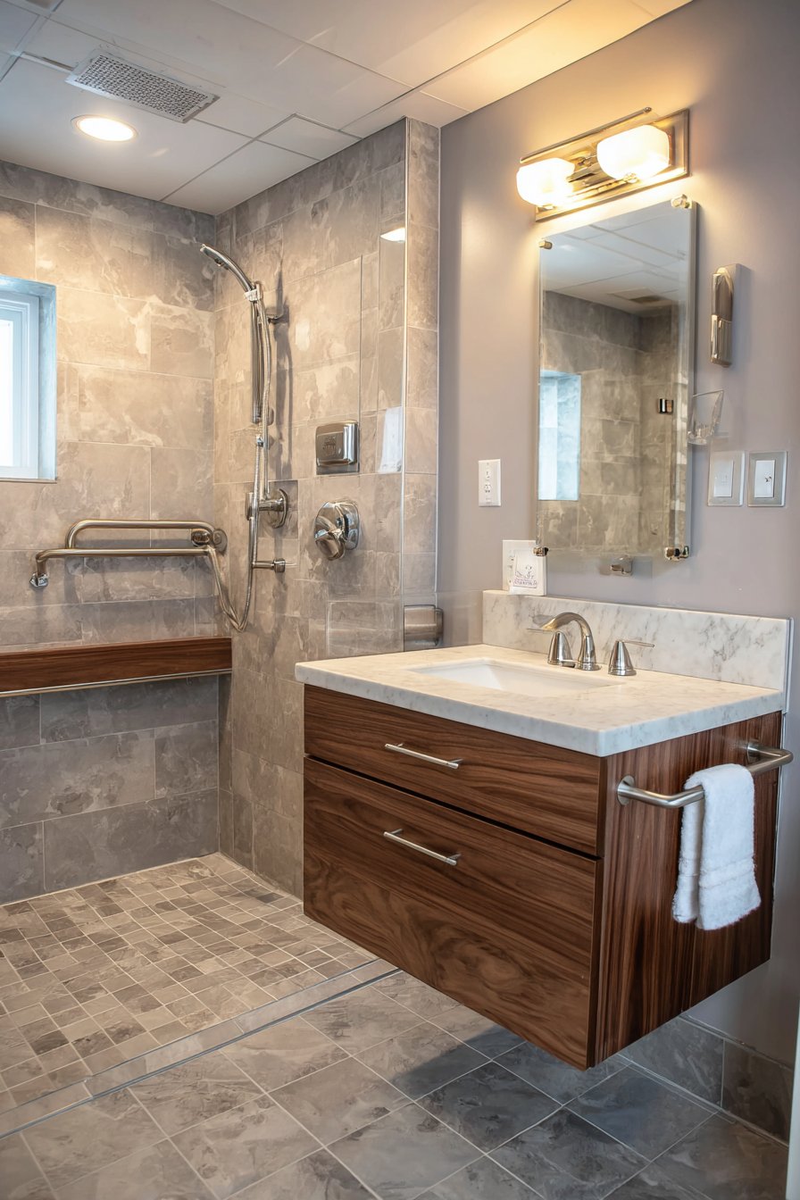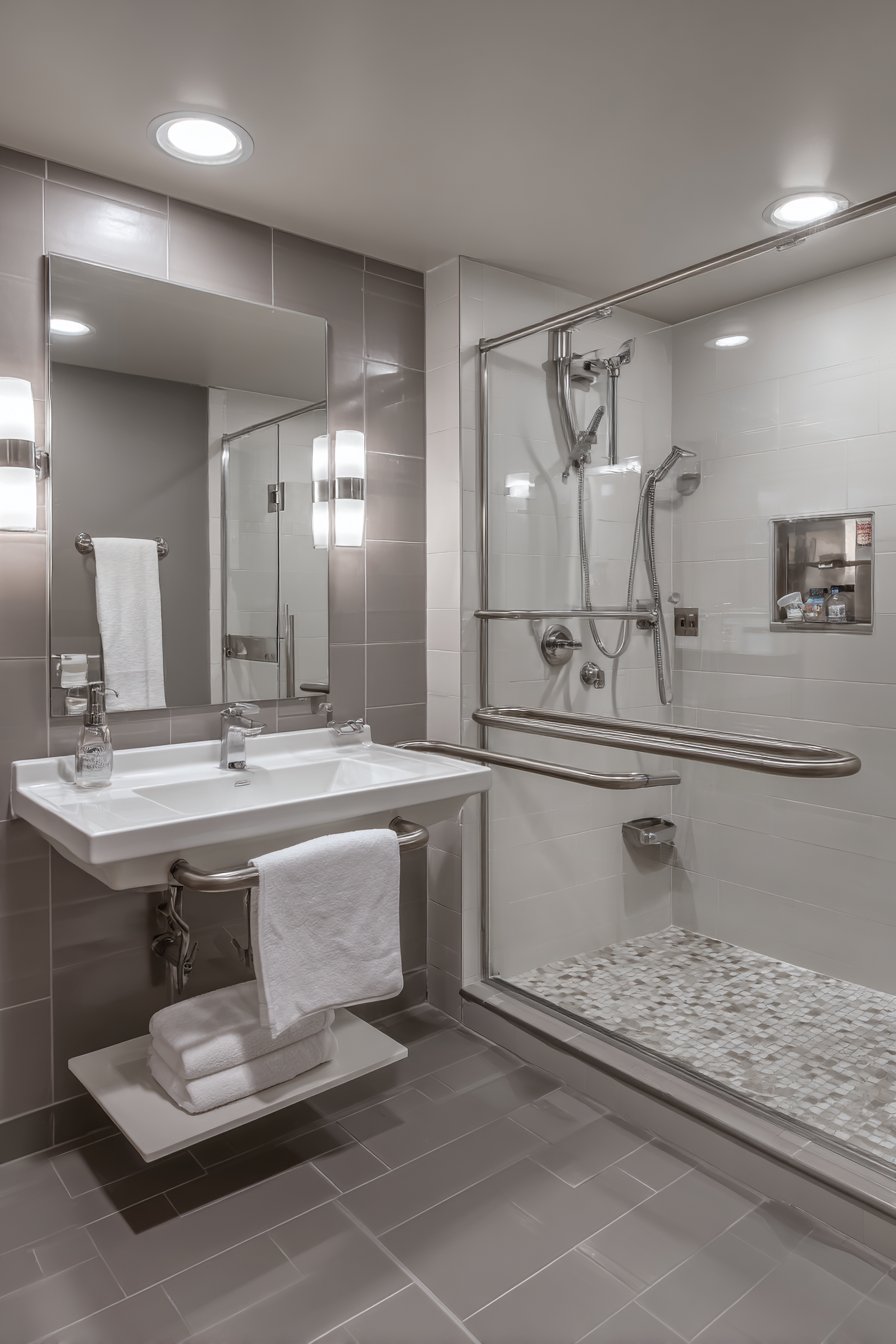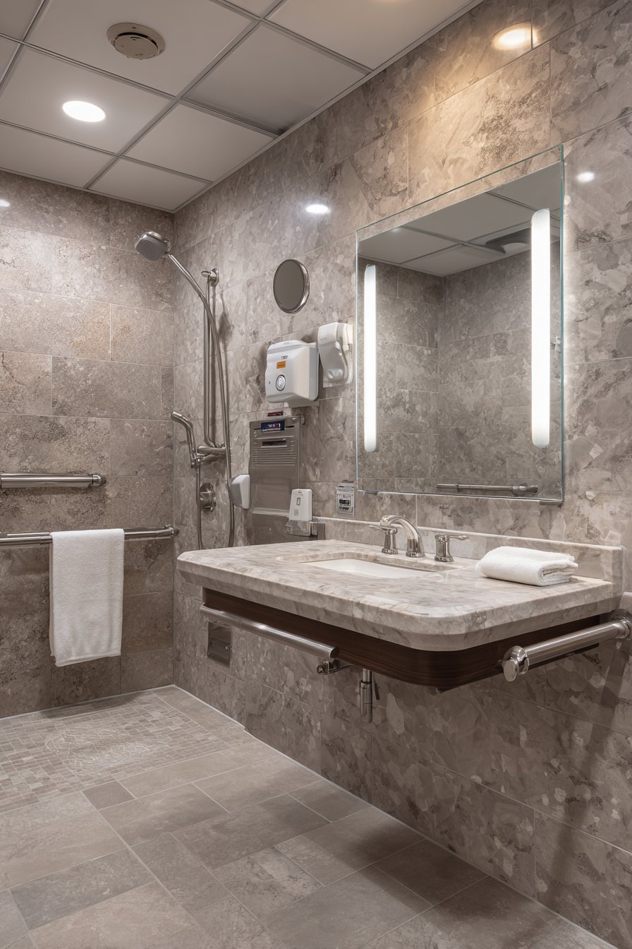 Bright LED lighting ensures excellent visibility, particularly important for users with vision challenges who require well-lit spaces to navigate safely. The neutral gray palette creates calm sophistication while the careful attention to proportion, material quality, and detail demonstrates that accessible design need not look clinical or institutional. This bathroom proves that universal design principles create spaces that work beautifully for all users while maintaining the aesthetic quality guests expect and deserve.