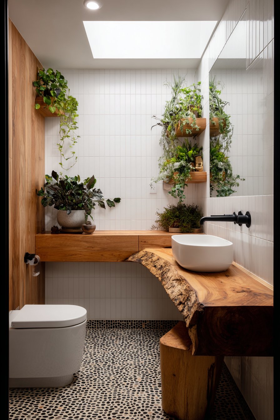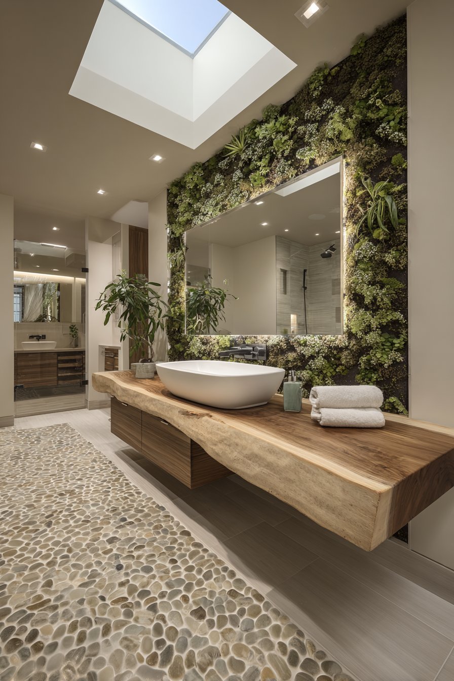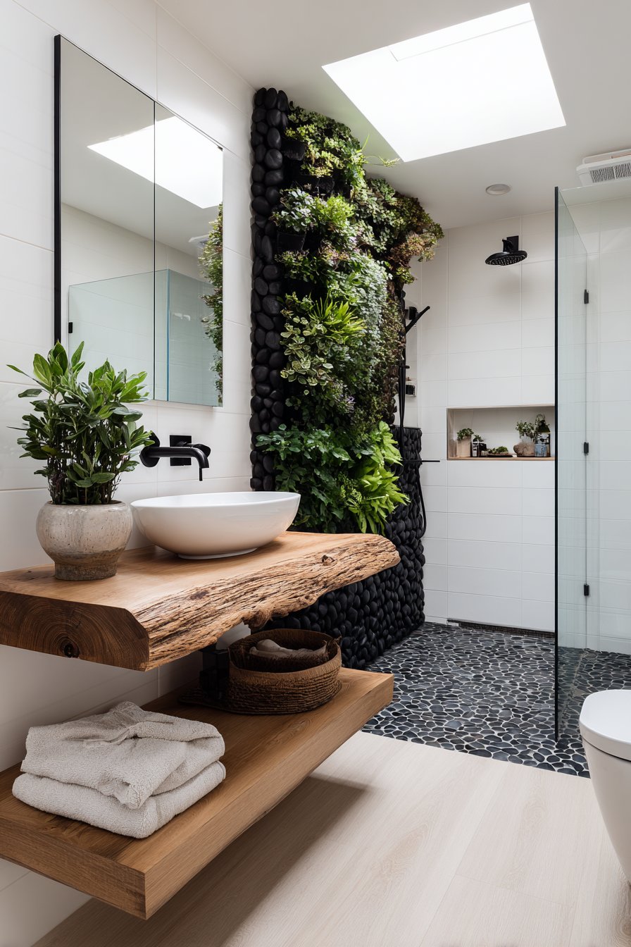 Biophilic design reaches its apex in this nature-inspired guest bathroom where a living plant wall becomes the dramatic focal point, transforming a functional space into a verdant sanctuary. The plant wall introduces living texture, natural air purification, and visual interest that changes over time as plants grow and evolve. A natural wood floating vanity with live-edge detail continues the organic theme, its irregular natural edge celebrating rather than concealing the wood’s origin as a living tree.