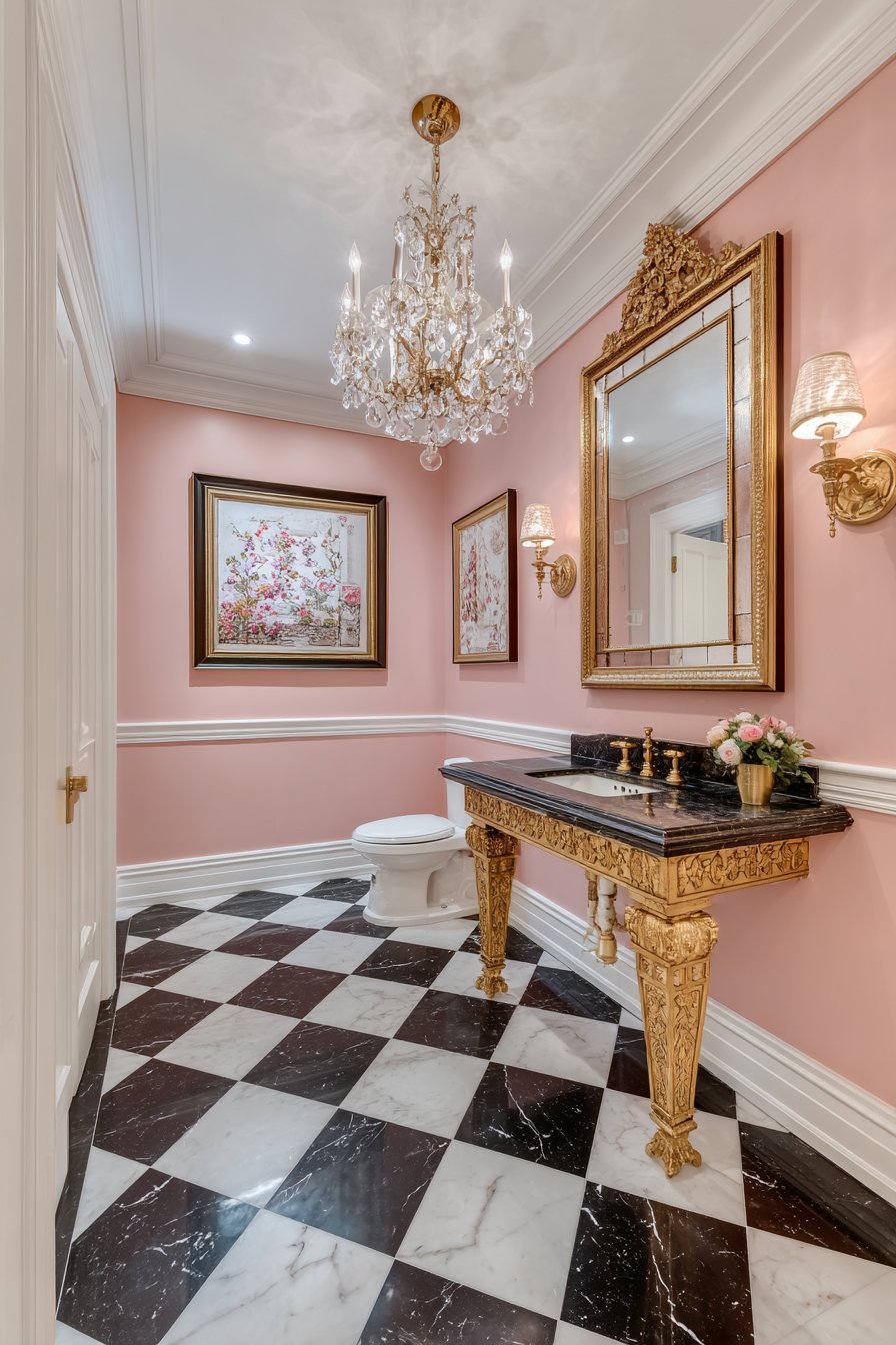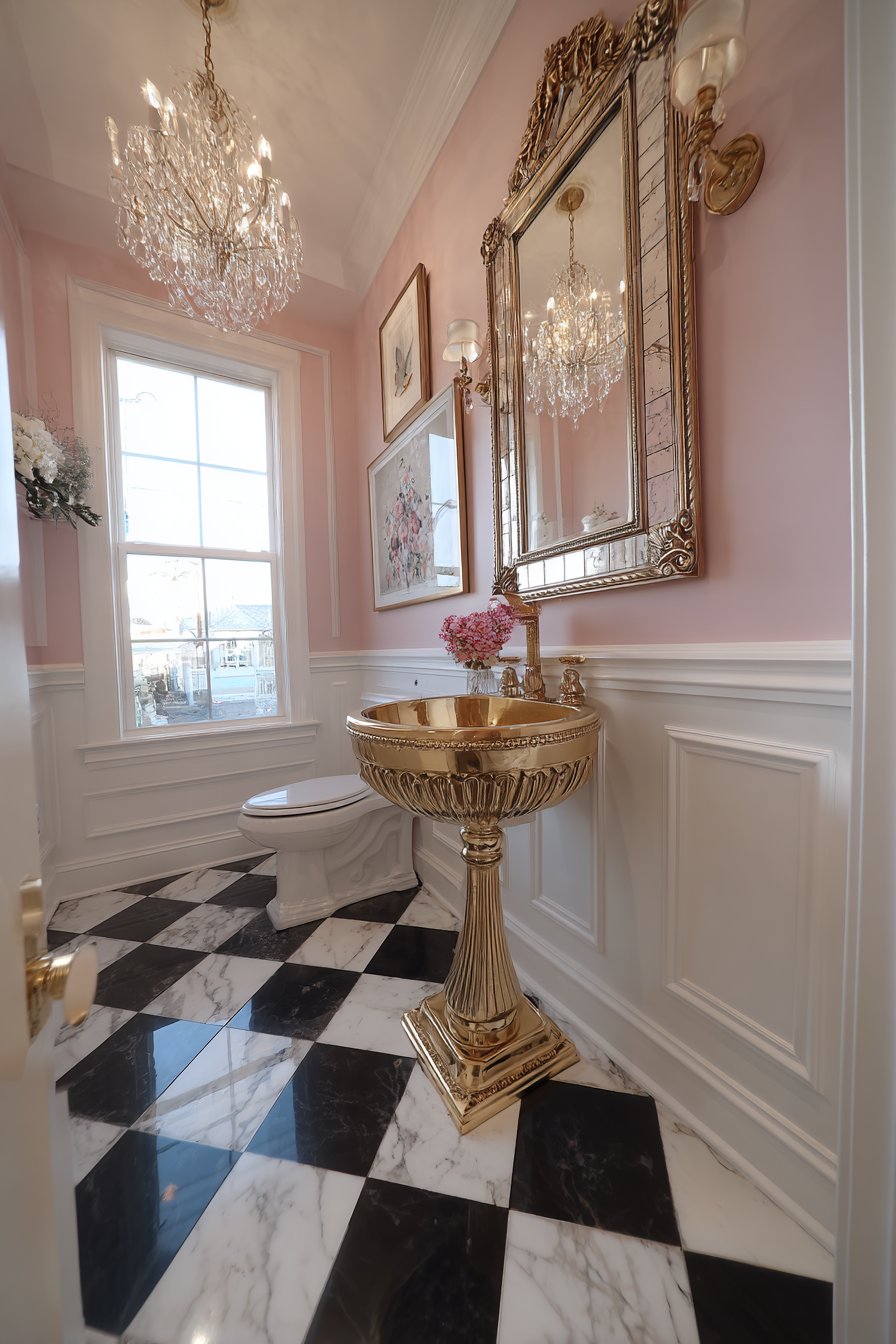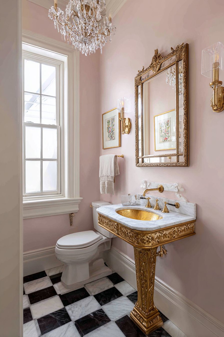 Soft pink walls provide a feminine backdrop that enhances the gold fixtures and crystal lighting while the wall-mounted gold faucets maintain the luxe aesthetic throughout. Natural light from a window combined with the chandelier’s glow creates warm, flattering illumination that makes everyone look their best—a key consideration in powder rooms where guests check their appearance. This design demonstrates how historical styles can be reinterpreted for contemporary homes when approached with restraint and attention to authentic details.