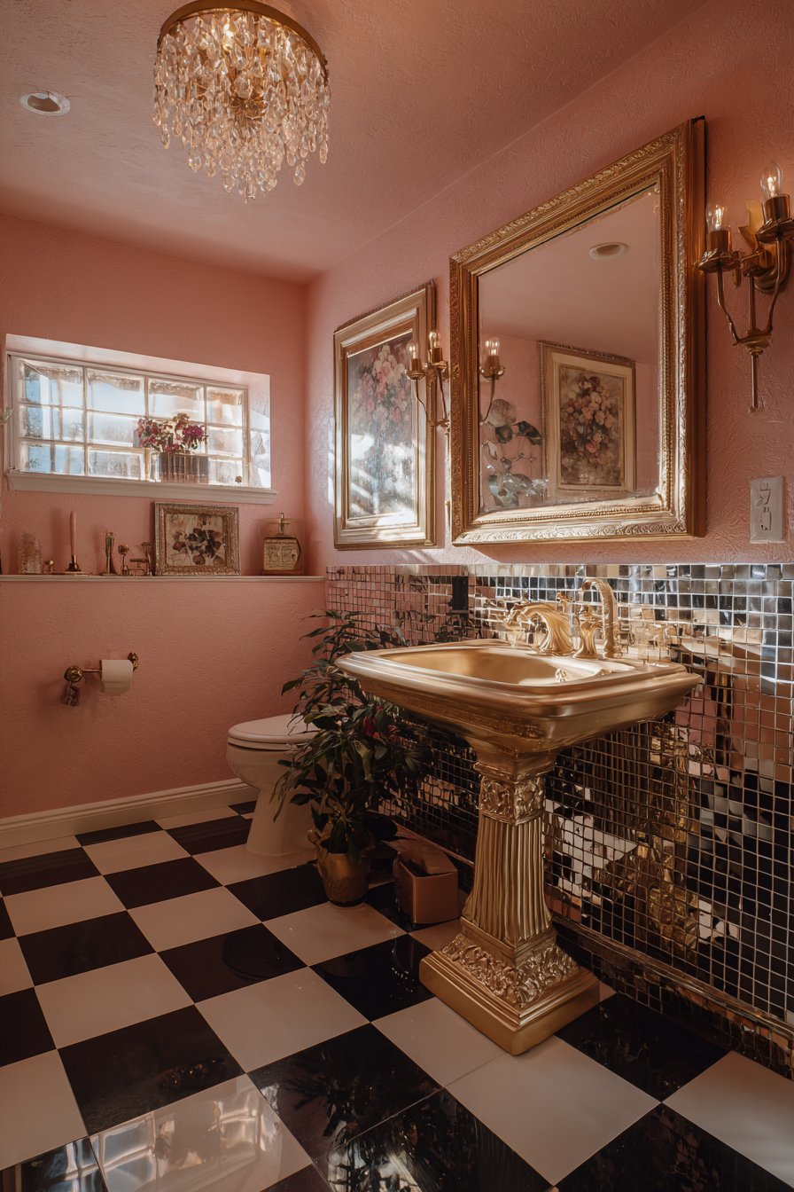 Vintage Hollywood glamour comes alive in this art deco inspired powder room where black and white checkered floor tiles create a classic foundation that immediately establishes the period aesthetic. The bold geometric floor pattern provides graphic impact while remaining timeless—a hallmark of art deco design’s enduring appeal. A gold pedestal sink with ornate details serves as the room’s statement piece, its luxe finish and decorative elements directly referencing the opulence of the art deco era.