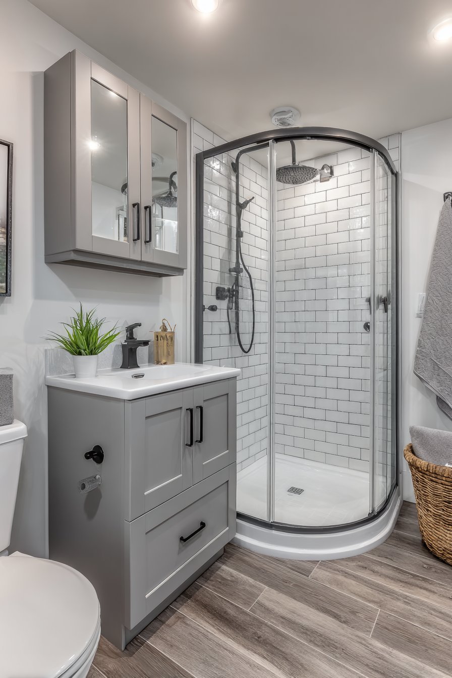 Space efficiency reaches new heights in this compact ensuite bathroom where thoughtful planning maximizes every square inch. The corner shower features a curved glass enclosure that saves space while adding visual softness—the curve eliminates sharp corners that would make the tight space feel even smaller. White subway tiles with dark gray grout add subtle detail and visual interest without overwhelming the modest dimensions, the darker grout preventing the all-white look from feeling sterile while remaining easy to maintain.