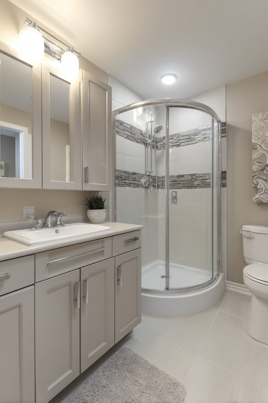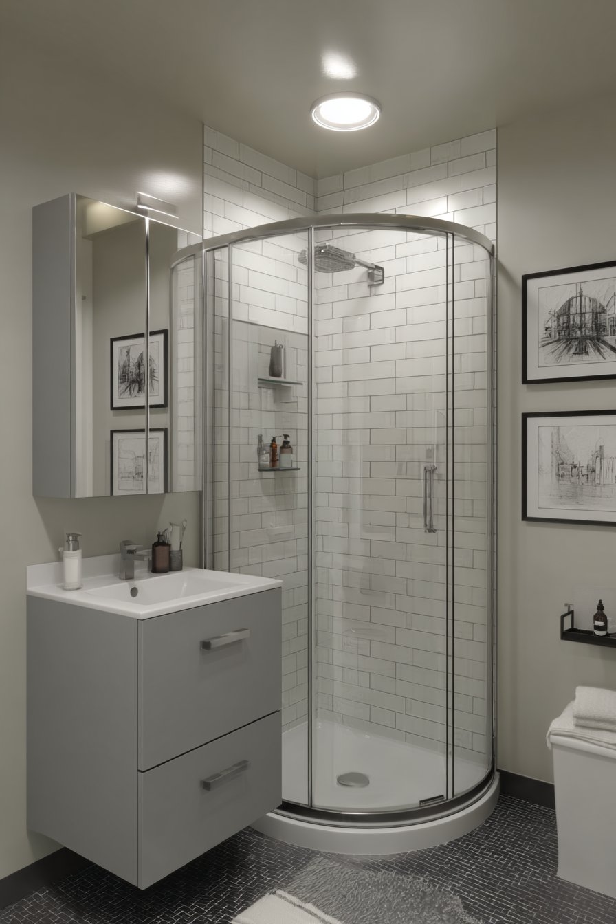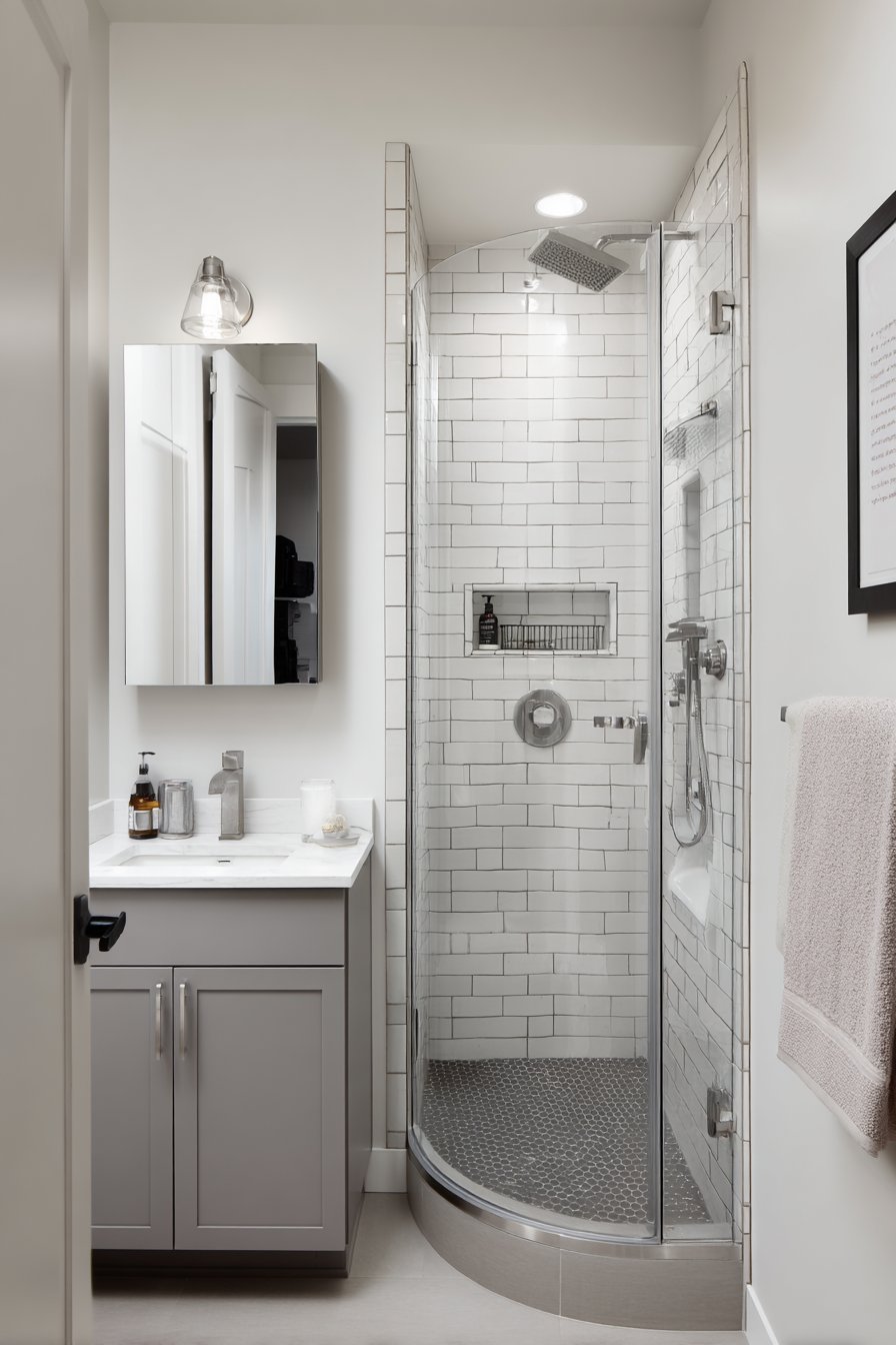 - Use corner showers with curved glass to maximize space and add softness