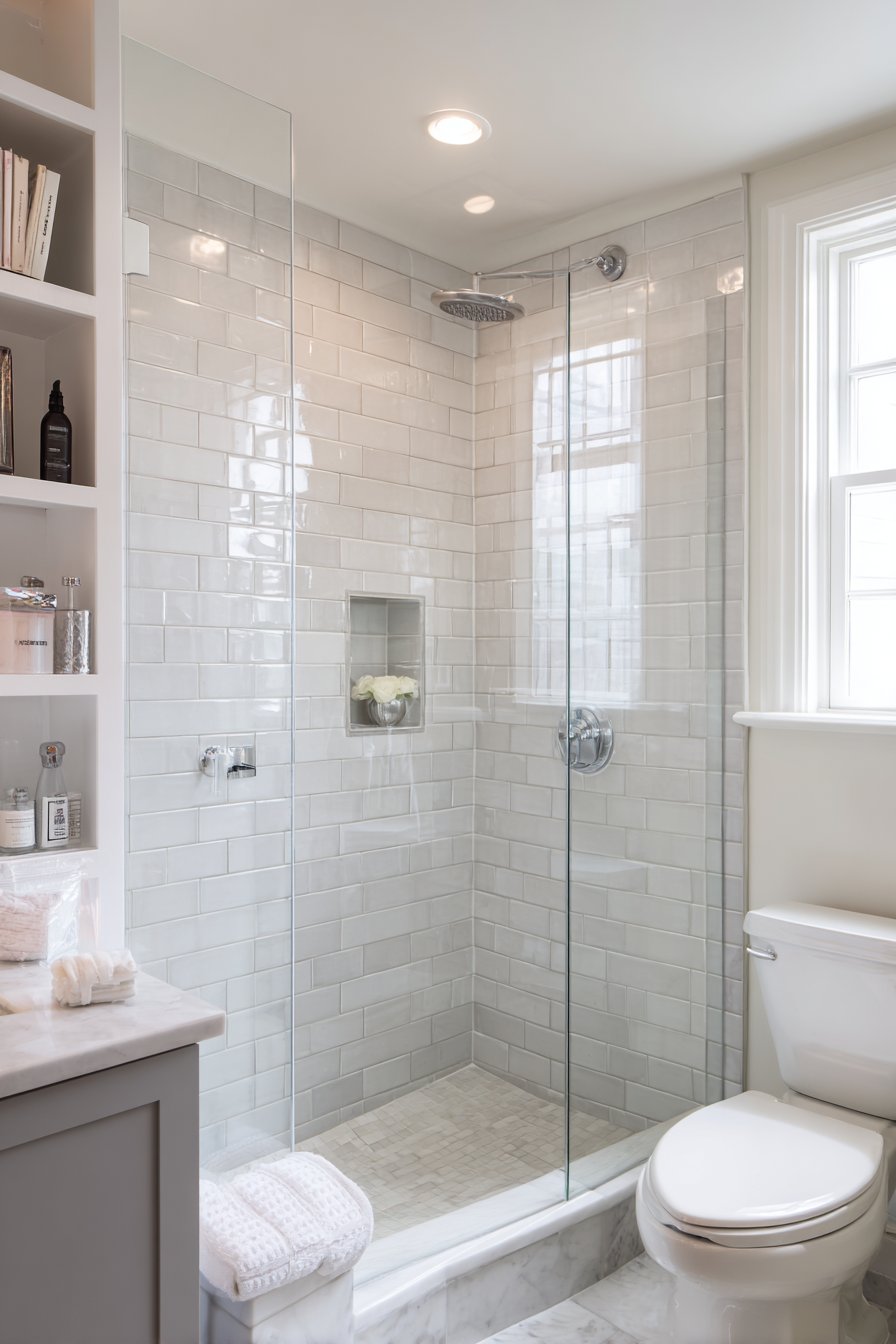 - Choose a frameless glass shower enclosure to maintain visual continuity and make the room feel larger