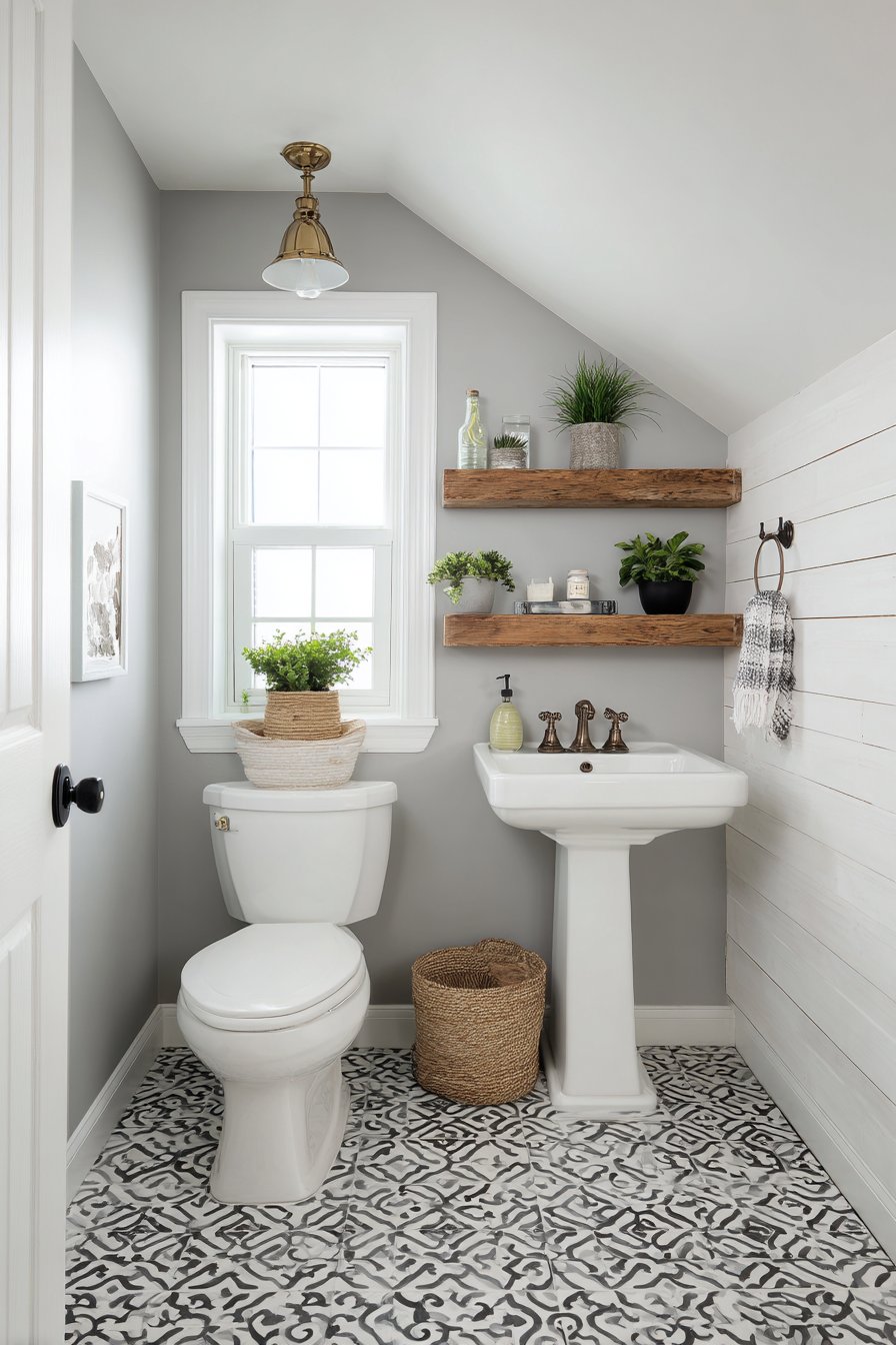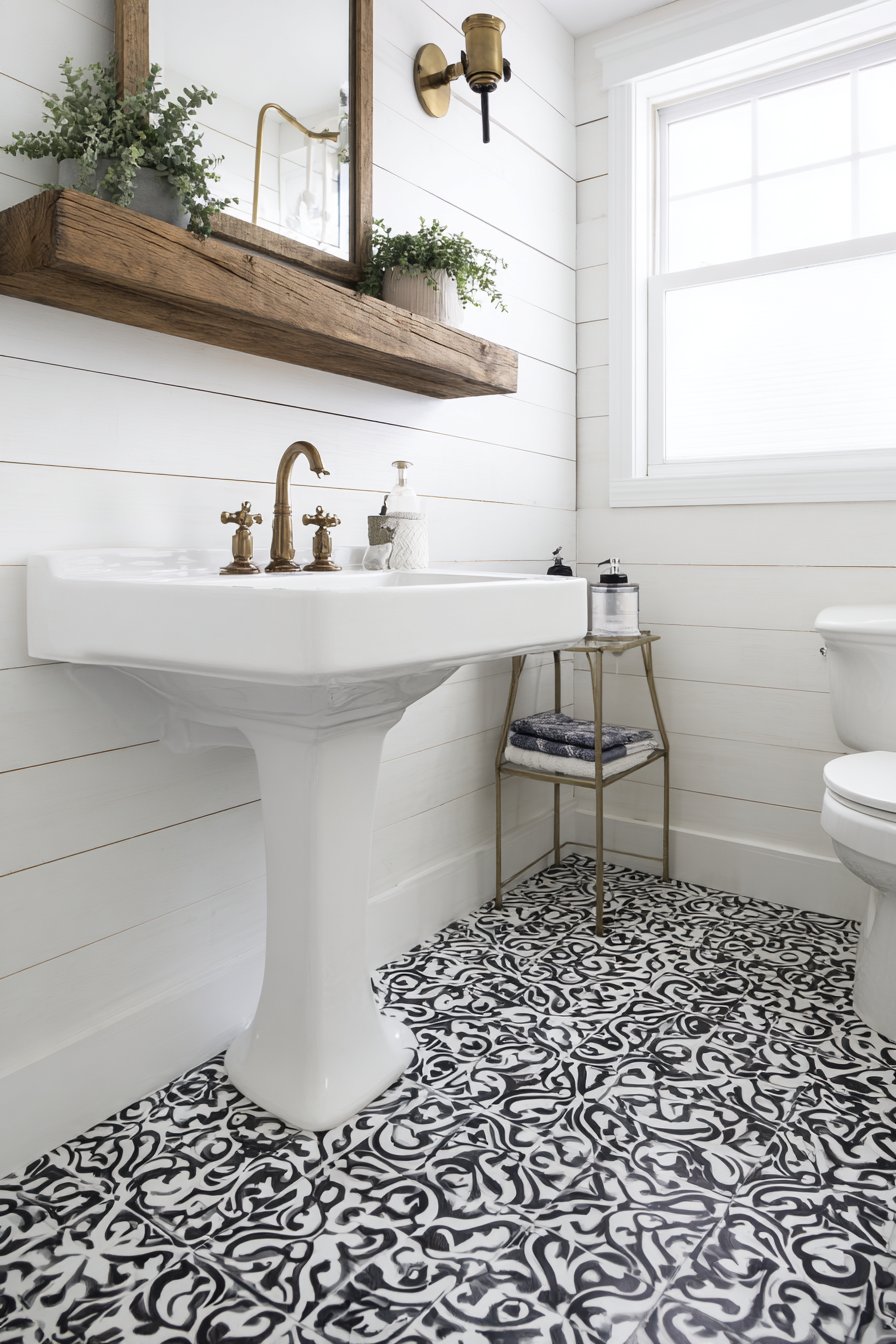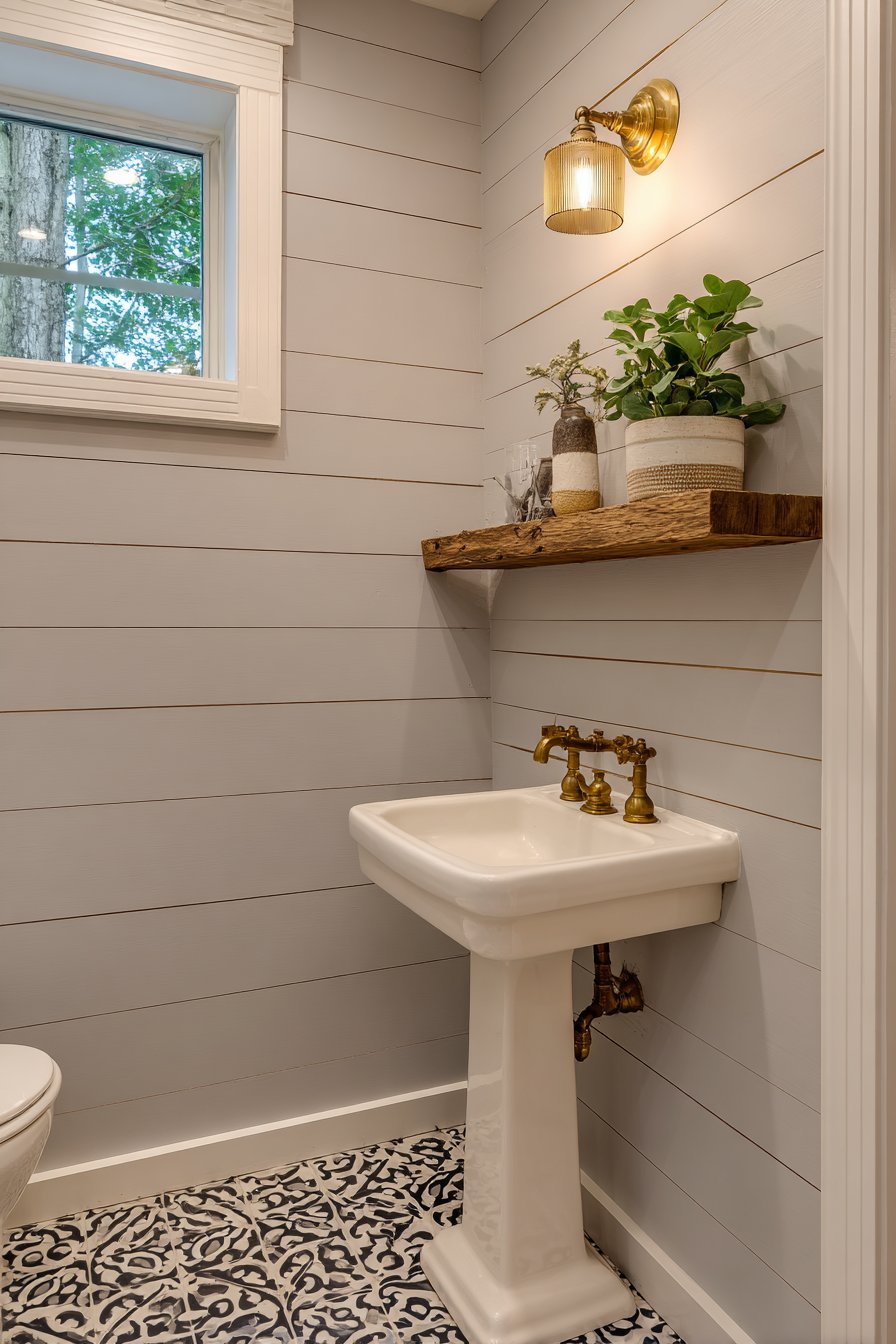 The white pedestal sink with vintage-style cross-handle faucet anchors the space with timeless elegance, its traditional form creating pleasing contrast with the floor’s contemporary geometry. Shiplap walls painted soft gray provide texture and visual interest without competing with the bold flooring, while also introducing the farmhouse-inspired character that makes this space feel warm and inviting rather than coldly modern. The horizontal lines of the shiplap subtly widen the perceived space, a particularly valuable trick in narrow half-baths.