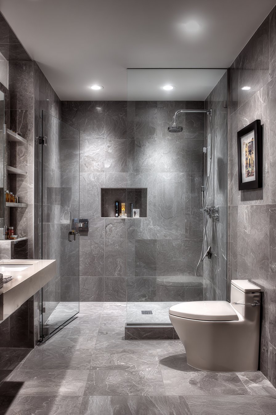 The wall niche carved into the shower area provides practical storage for toiletries without introducing additional fixtures or accessories that would clutter the clean lines. This built-in solution demonstrates how thoughtful planning during construction or renovation can eliminate the need for hanging caddies or corner shelves that compromise the minimalist aesthetic. The floating vanity in matte gray continues the streamlined approach, its integrated sink eliminating the joint between countertop and basin where grime typically accumulates, making maintenance remarkably simple.