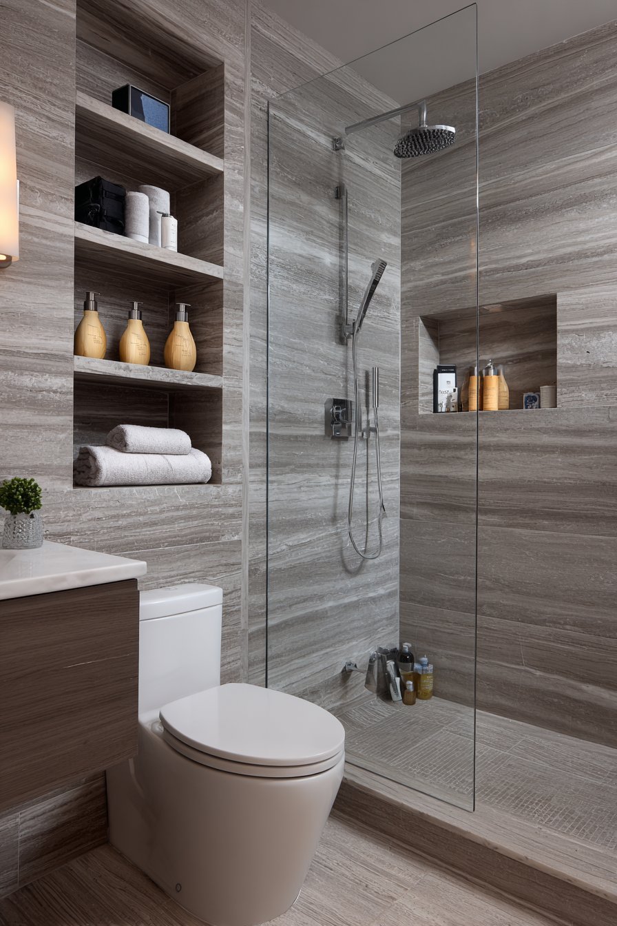 - Build recessed shelving into shower walls during construction for seamless storage