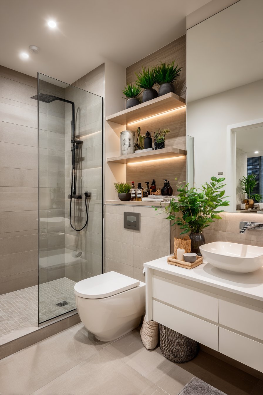 The glass-enclosed shower becomes a focal point rather than an afterthought, featuring a rainfall showerhead that transforms the daily routine into a moment of indulgence. Open shelving displays neatly rolled towels in hotel-style presentation, combining practicality with visual appeal while ensuring guests never need to search for essentials. The neutral palette of soft whites and warm grays creates a serene foundation that appeals universally, avoiding bold color choices that might date quickly or clash with adjacent spaces.