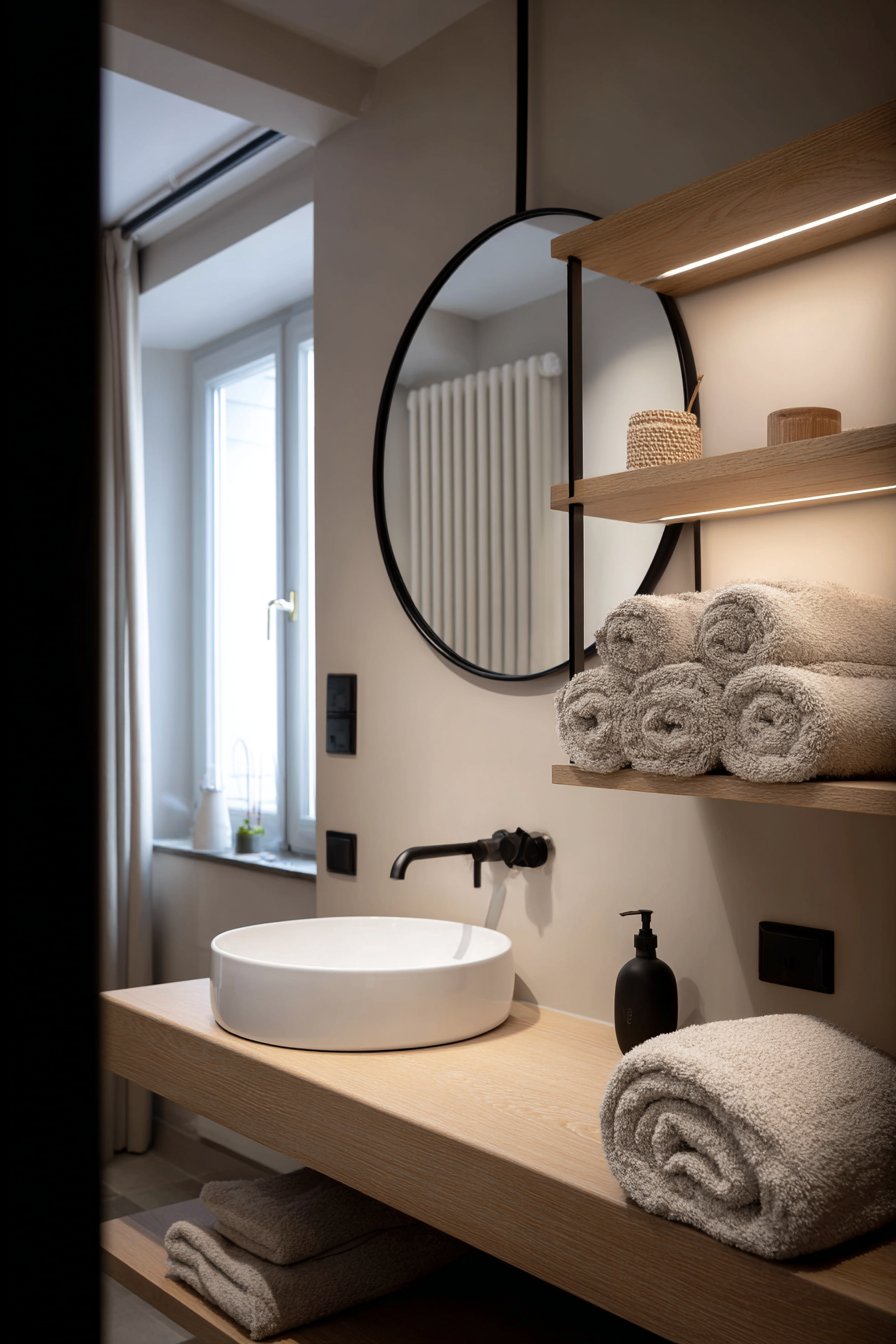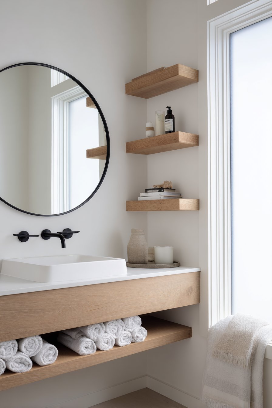Scandinavian design philosophy permeates this spare bathroom where clean white walls create a gallery-like backdrop for the light wood floating vanity that introduces essential warmth and organic texture. The round mirror with black metal frame provides the perfect counterpoint to the vanity’s rectangular form while the black finish creates visual weight that grounds the otherwise airy space. This careful balance between light and dark, warm and cool, represents the hallmark of Scandinavian design—functional minimalism that remains inviting and human-scaled.