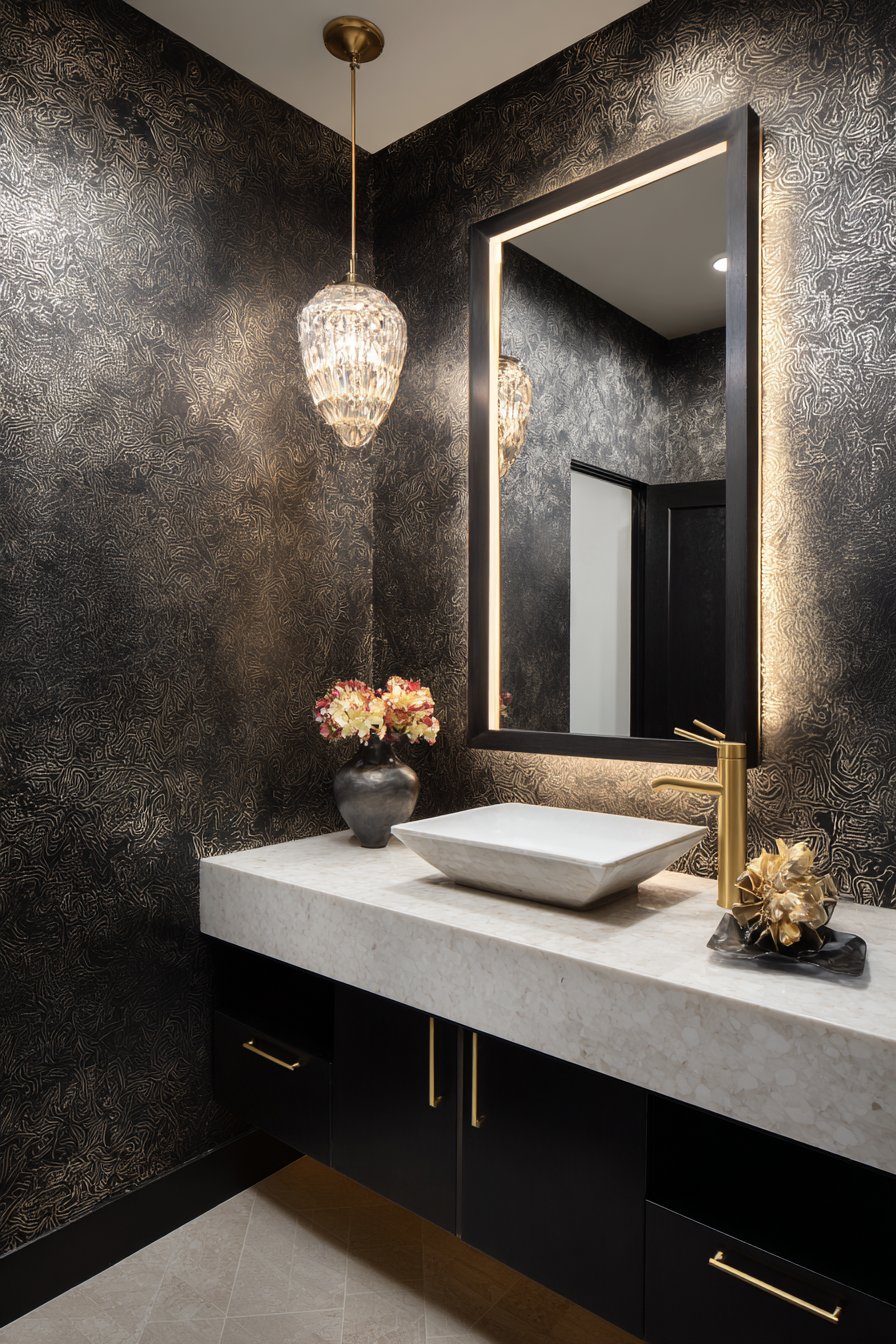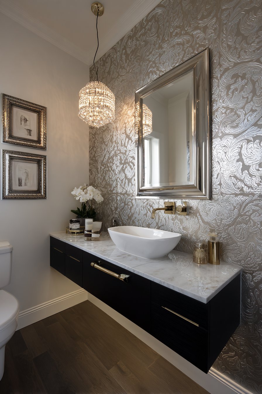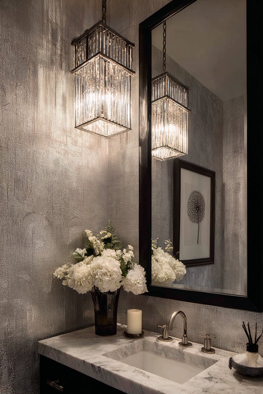 Beveled mirror tiles create a glamorous accent wall, their faceted surfaces catching and multiplying light while adding dimensional texture that flat mirrors cannot achieve. The vintage technique of using multiple small mirrors creates visual complexity and luxury while the beveled edges add sparkle and refraction. A crystal chandelier introduces unexpected elegance to the powder room, its faceted crystals casting prismatic light patterns across surfaces and creating the kind of glamorous atmosphere associated with luxury hotels and vintage cinema palaces.