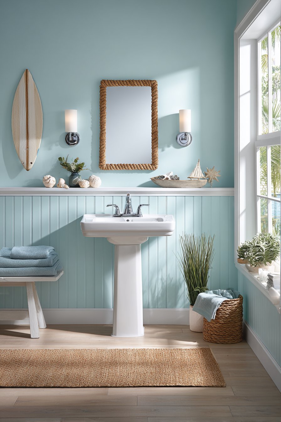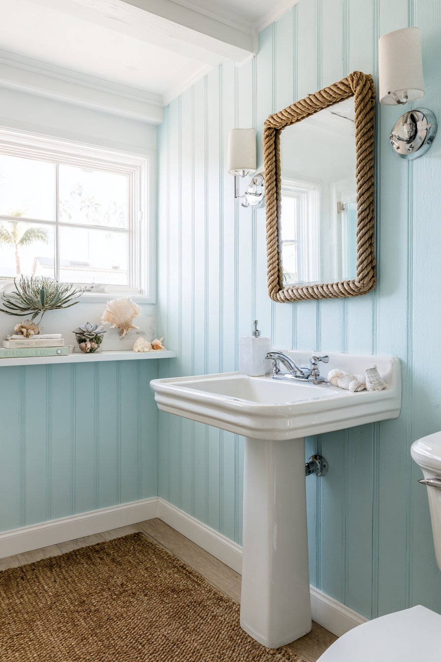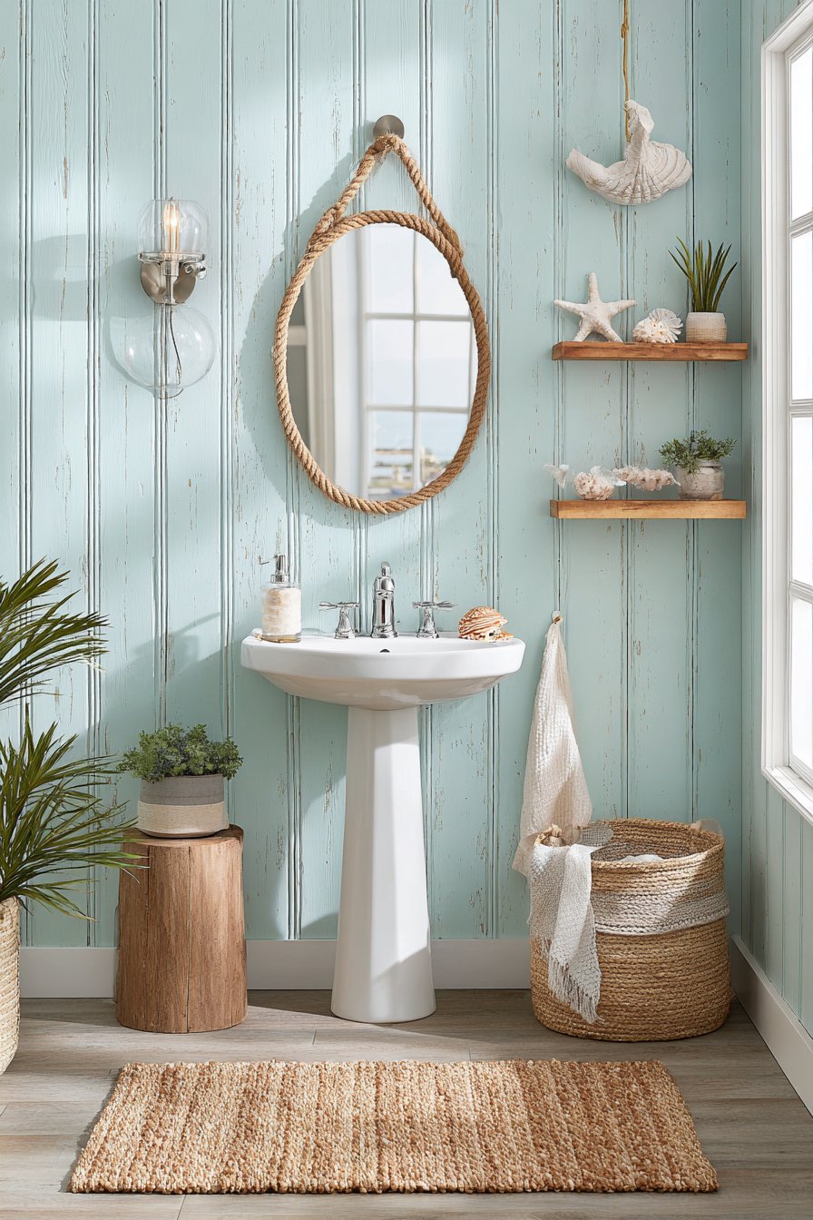 - Use rope or driftwood-framed mirrors for subtle nautical reference