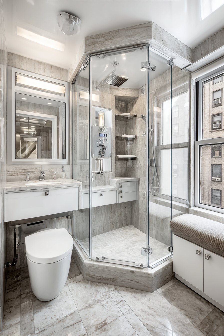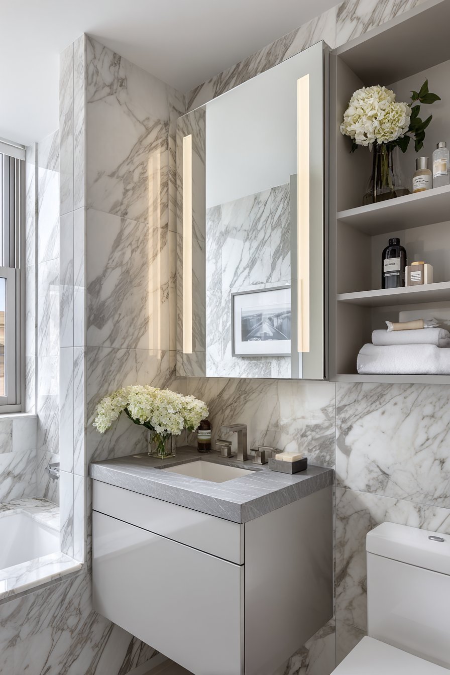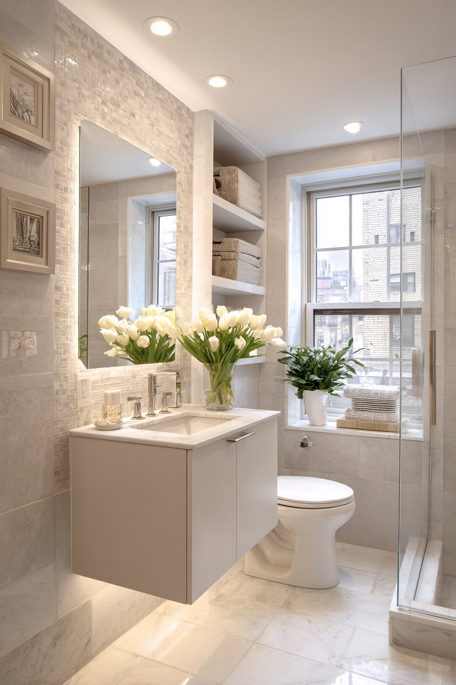 Lighting strategy emerges as a critical element that separates exceptional tiny bathrooms from merely adequate ones, with the best designs incorporating multiple light sources, natural illumination, and careful attention to how light interacts with materials and surfaces. The layered lighting approaches, strategic window placement, and thoughtful fixture selection visible throughout these examples demonstrate that adequate illumination isn’t just about brightness—it’s about creating depth, eliminating shadows, and enhancing the spatial qualities that make tiny bathrooms feel comfortable rather than cramped. Backlit mirrors, under-vanity lighting, recessed ceiling fixtures, and natural light all work together to create bathrooms that feel open and inviting regardless of their compact dimensions.