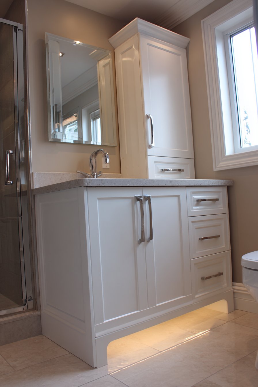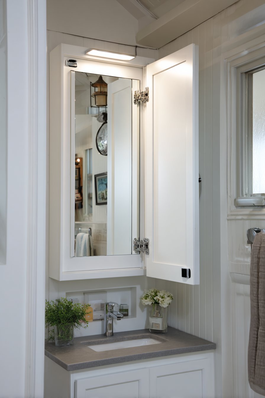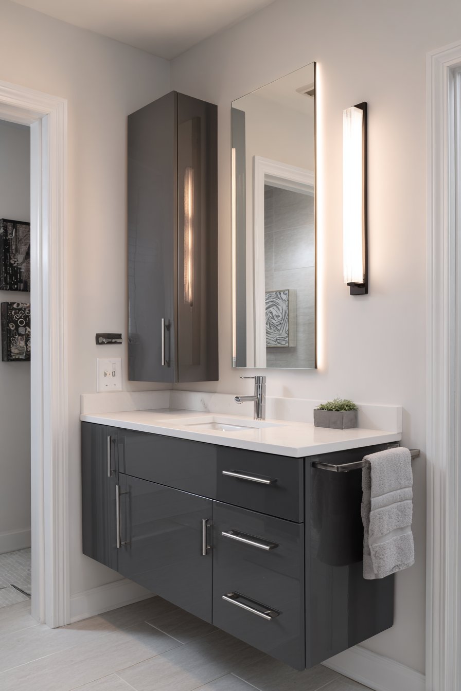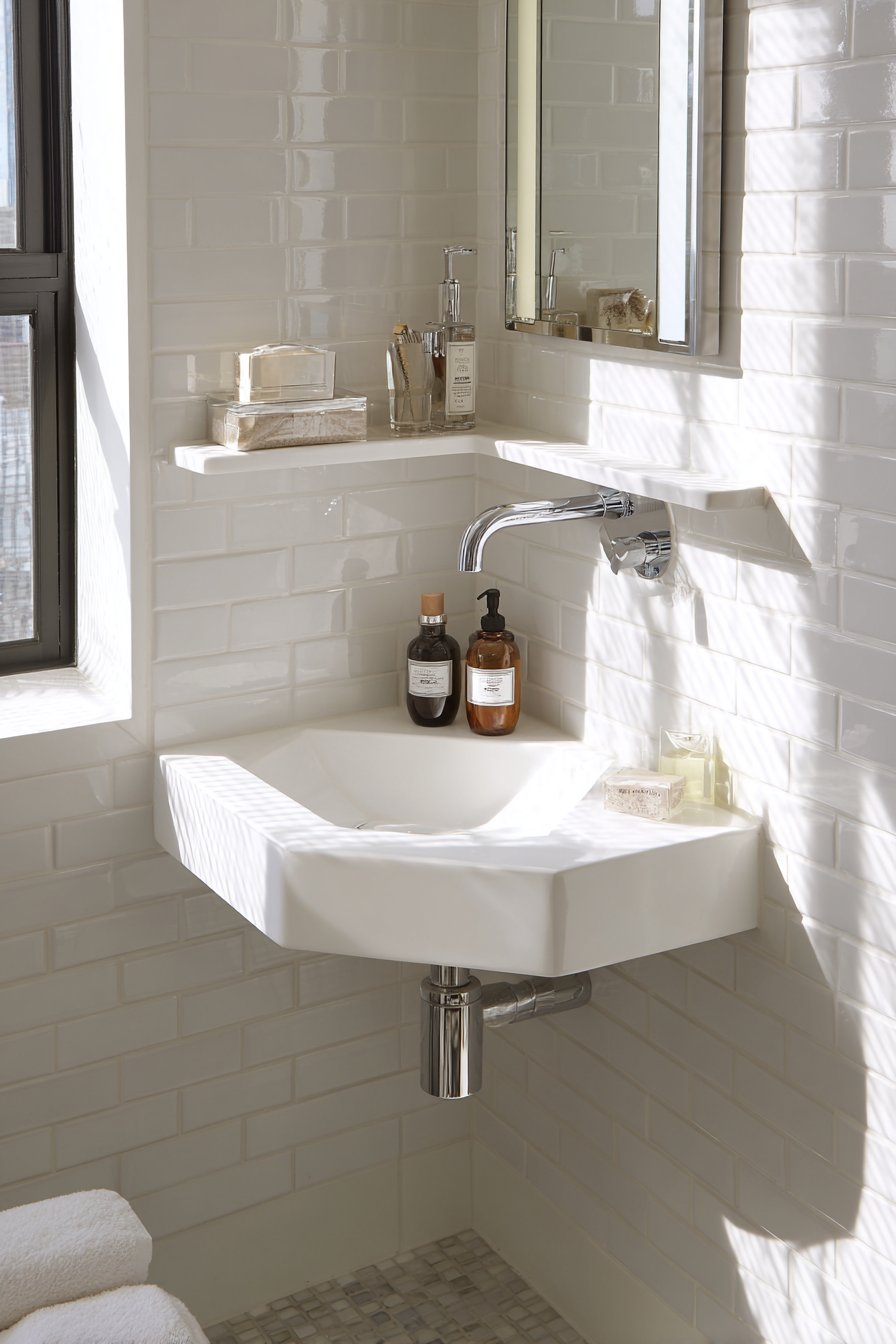 • Choose vanities specifically designed for small spaces rather than simply using short-depth standard models