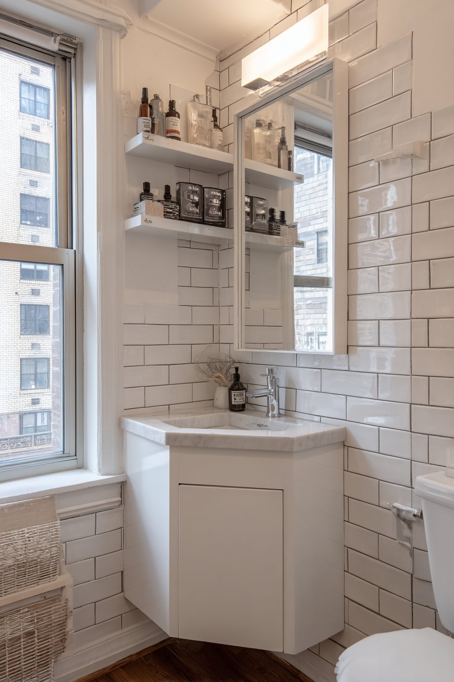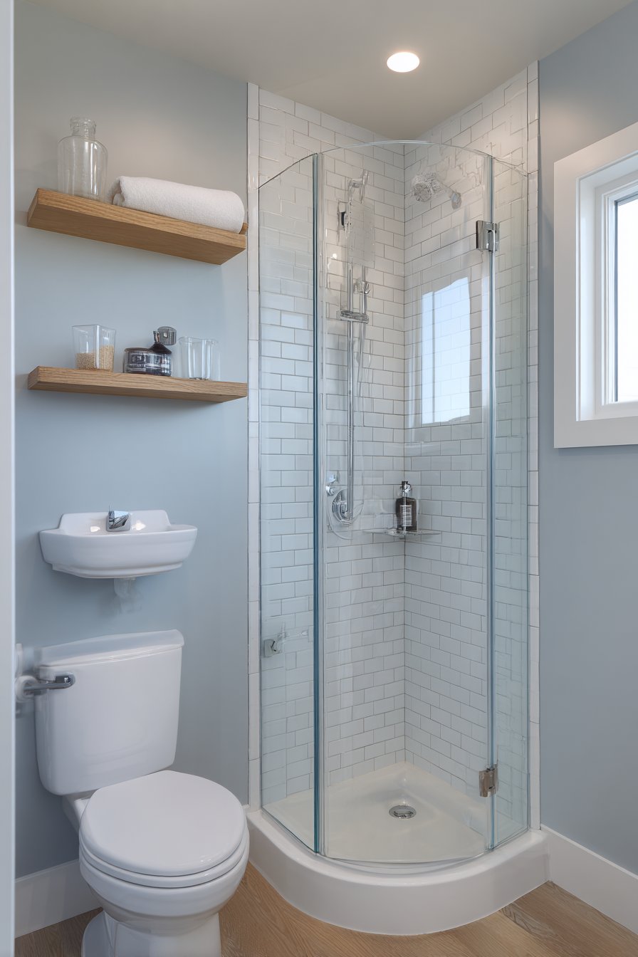 Recessed ceiling lights provide bright, even illumination throughout the space, eliminating shadows in corners where wall-mounted sconces might create dark spots or visually fragment the limited wall space. Wide-angle interior design photography demonstrates the efficient corner utilization and light-reflecting white surfaces that work together to make this tiny bathroom feel considerably more spacious than its square footage suggests. The neo-angle design’s distinctive shape becomes a design feature in itself, adding visual interest to what might otherwise be a purely functional corner shower.