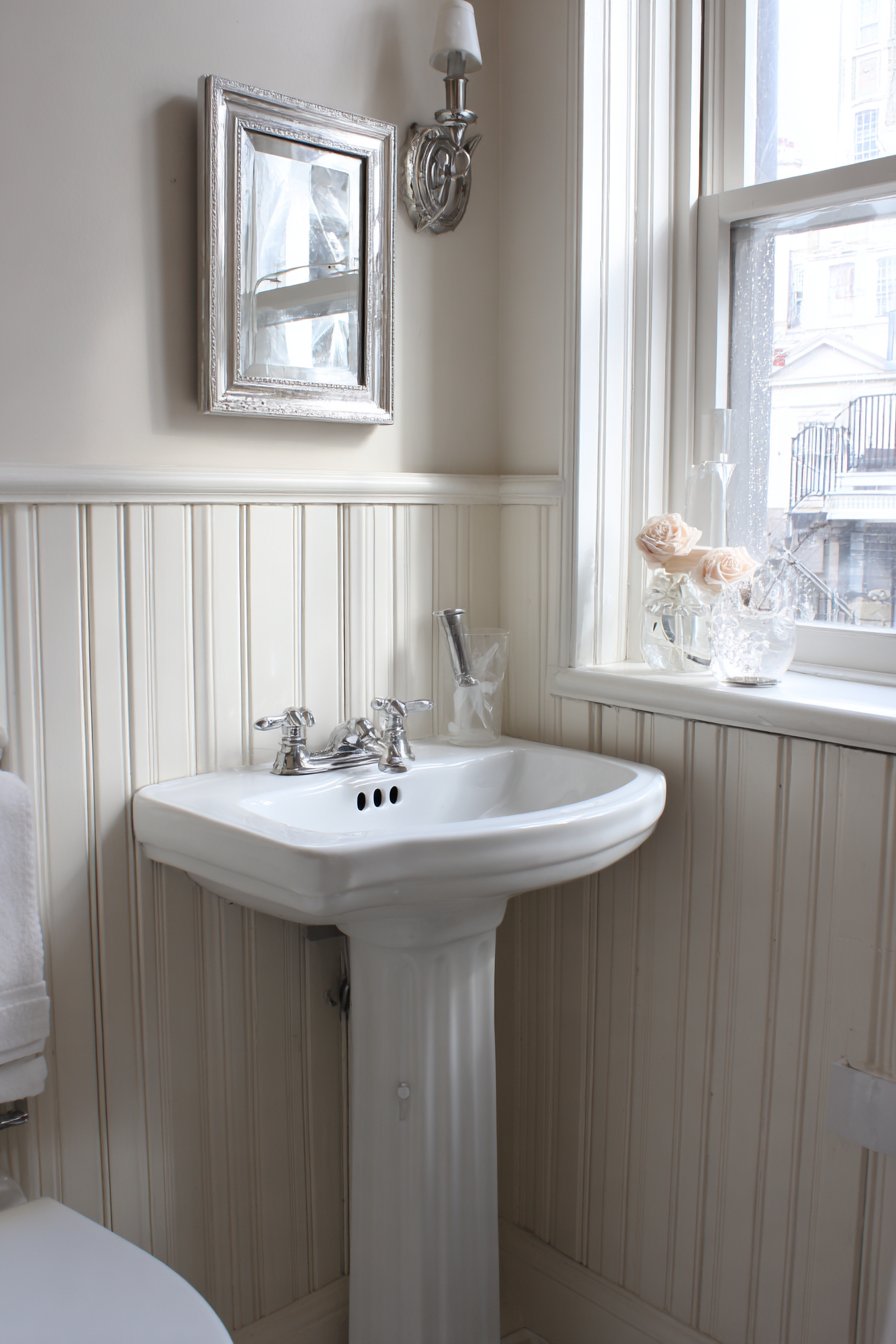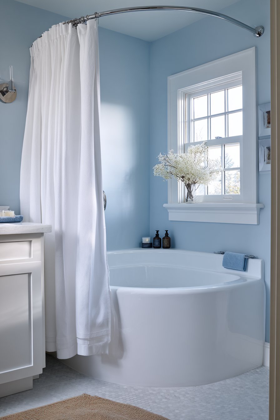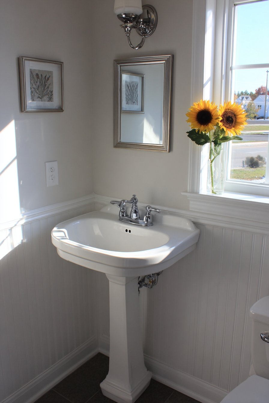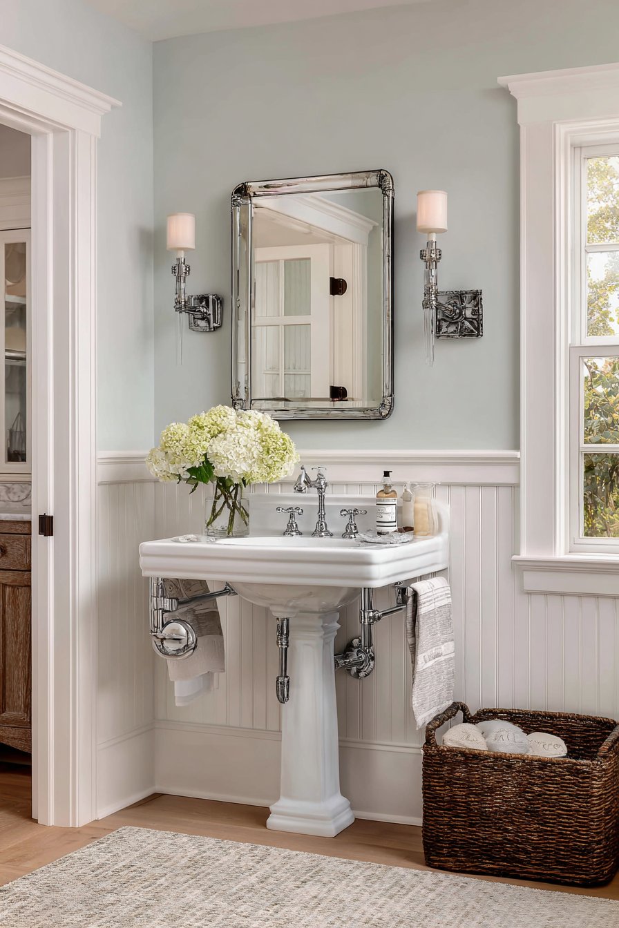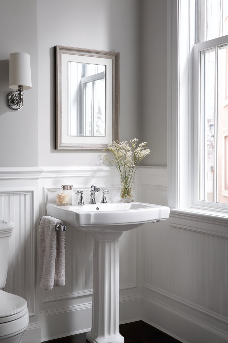 Professional interior photography with balanced exposure shows how the two-tone approach adds depth while maintaining brightness in the compact space, demonstrating that color strategy deserves careful consideration in tiny bathrooms where every visual element affects spatial perception. The chair rail dividing the two colors doesn’t need to be elaborate or pronounced—a simple horizontal line created with painter’s tape during application can provide sufficient division between the two tones.