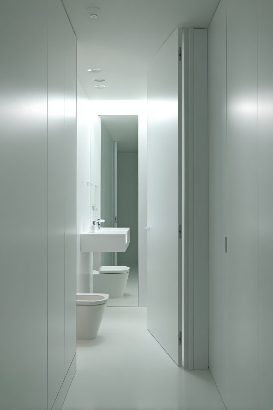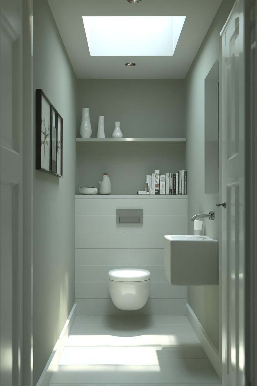Natural light from a skylight bathes the compact space in illumination from above, an often-overlooked strategy in tiny bathrooms where wall space for windows may be limited or non-existent. This overhead lighting creates even distribution throughout the day, eliminating the dark corners that can make small bathrooms feel cave-like and uninviting. The interior photography style emphasizes the floating elements and unobstructed floor view that fundamentally changes how we perceive the bathroom’s size.