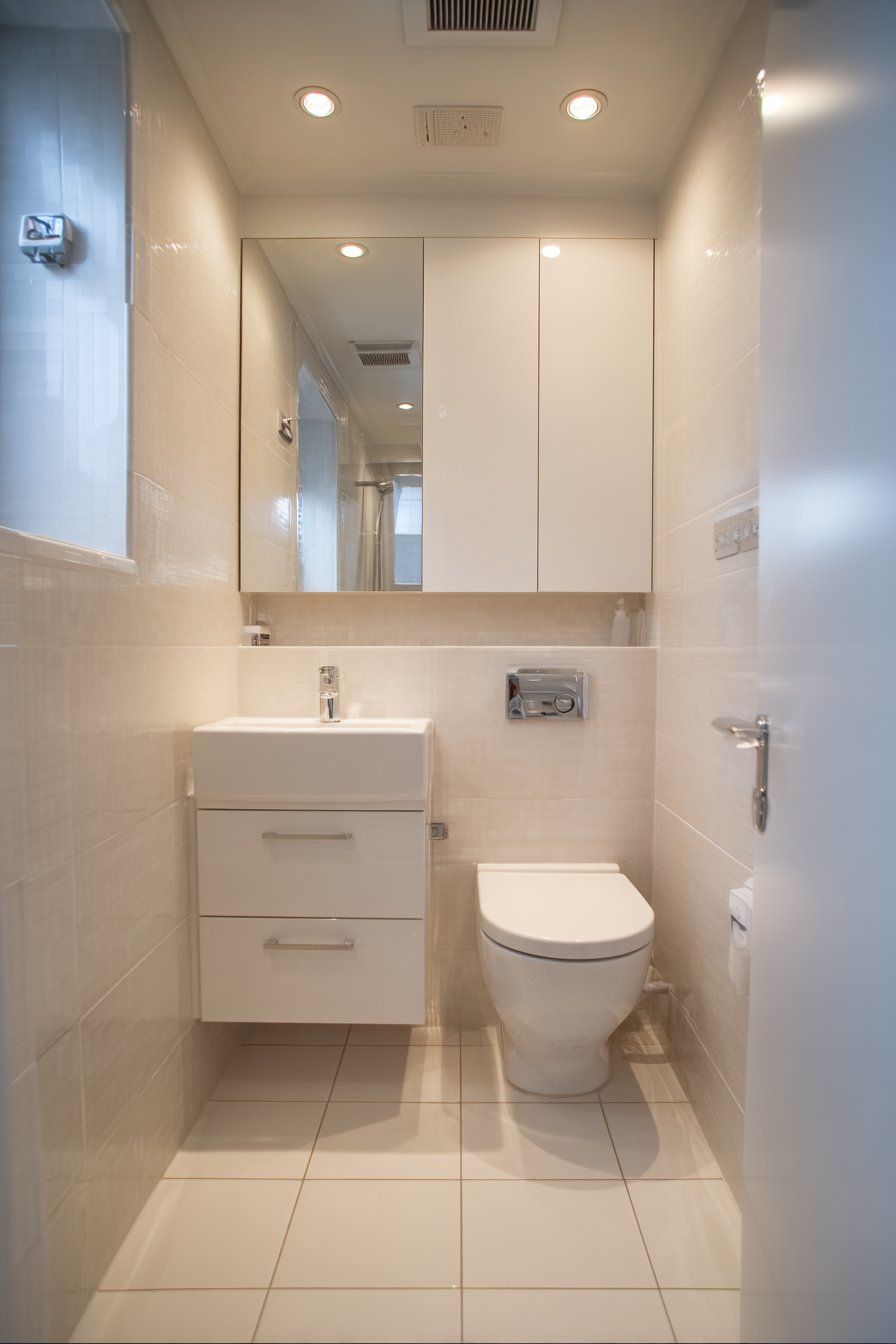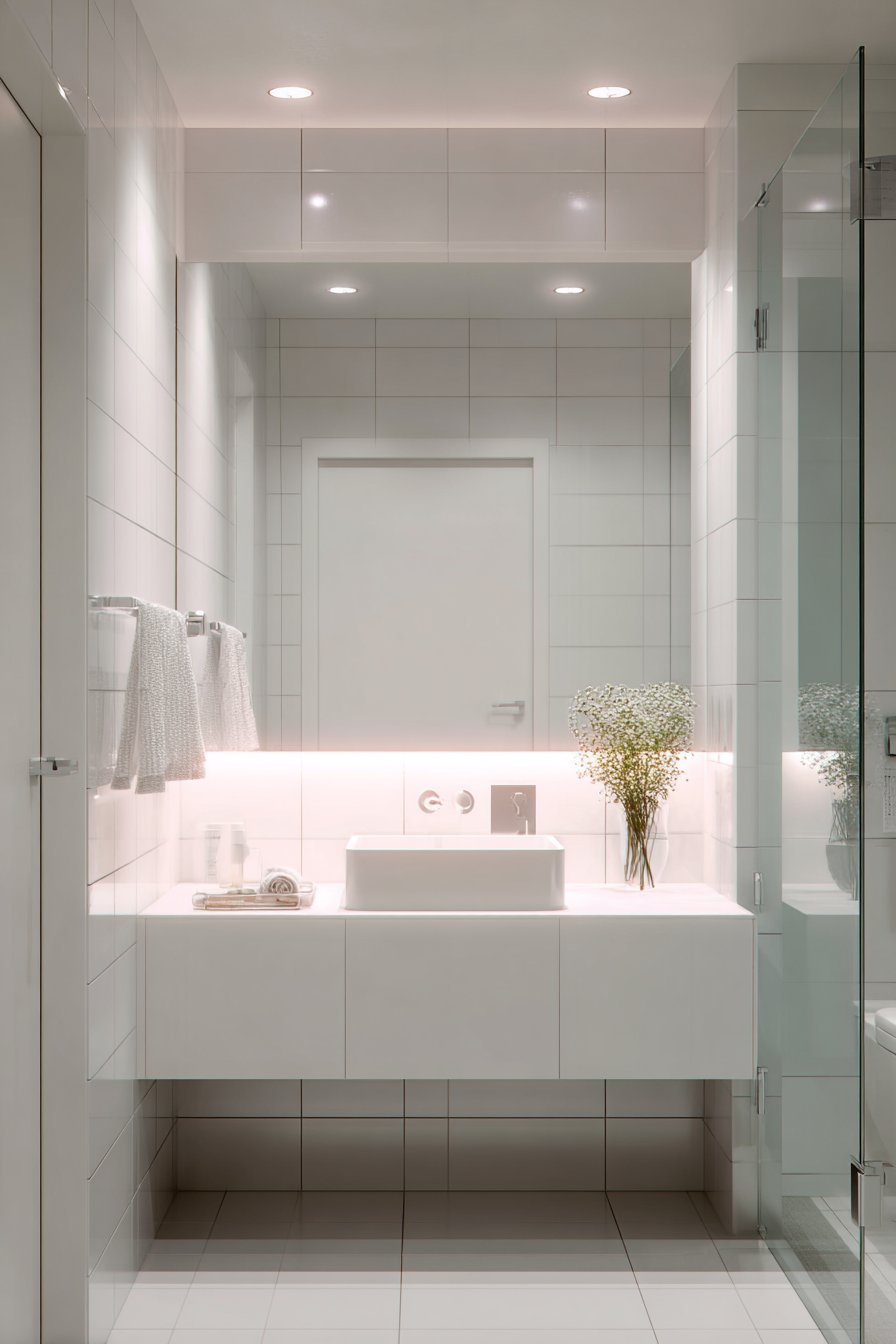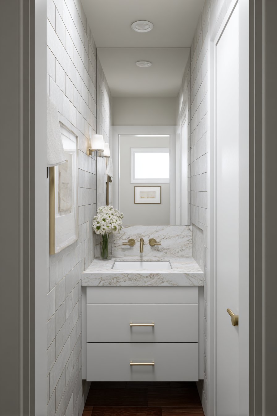 Professional interior photography focuses on the slim profile and reflective surfaces, two key elements that work synergistically to make this narrow bathroom function effectively. The rectangular undermount sink maximizes usable counter space compared to vessel sinks or drop-in models, while the wall-to-wall mirror eliminates the visual interruption that a framed mirror would create, maintaining continuous reflection across the entire width of the vanity.