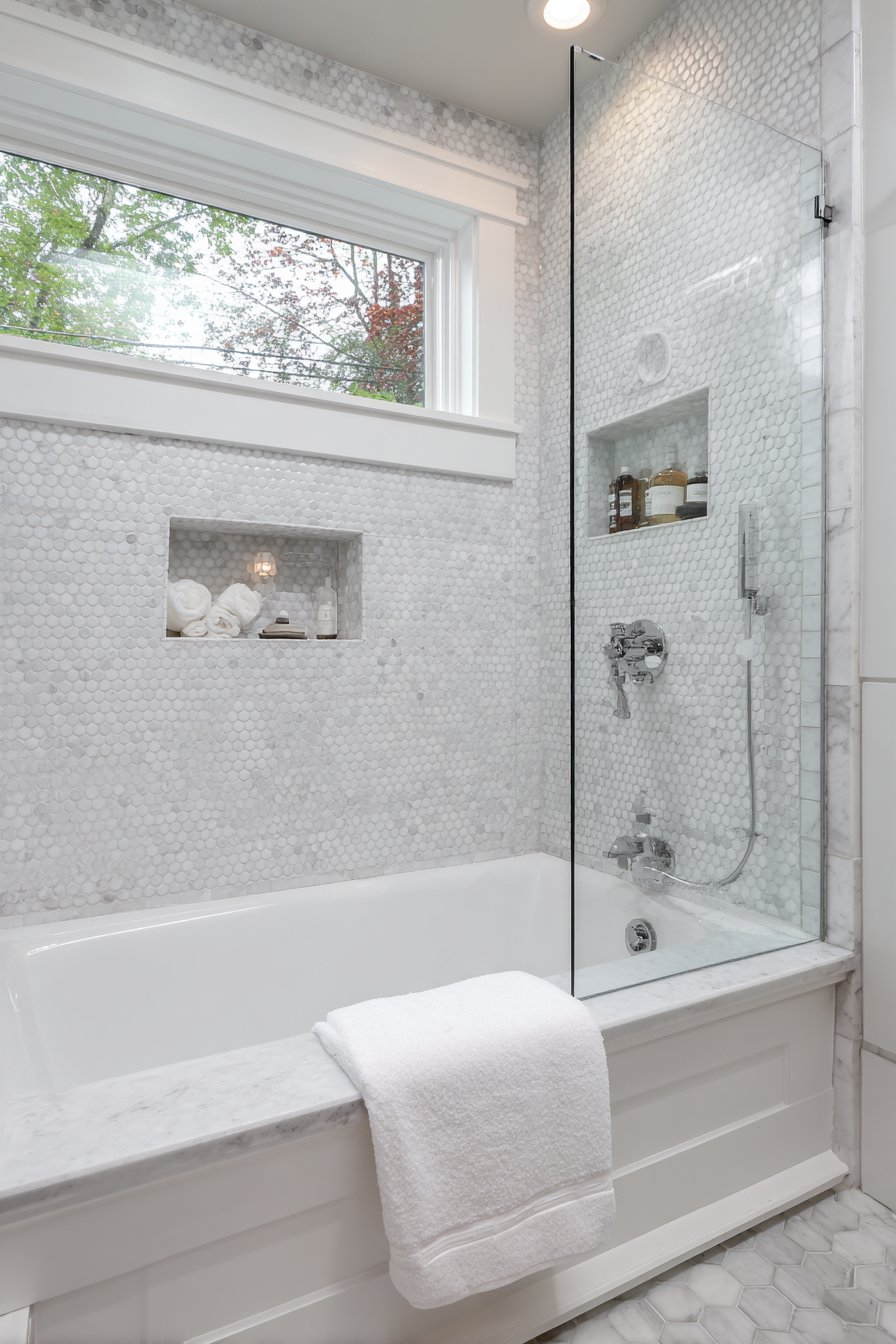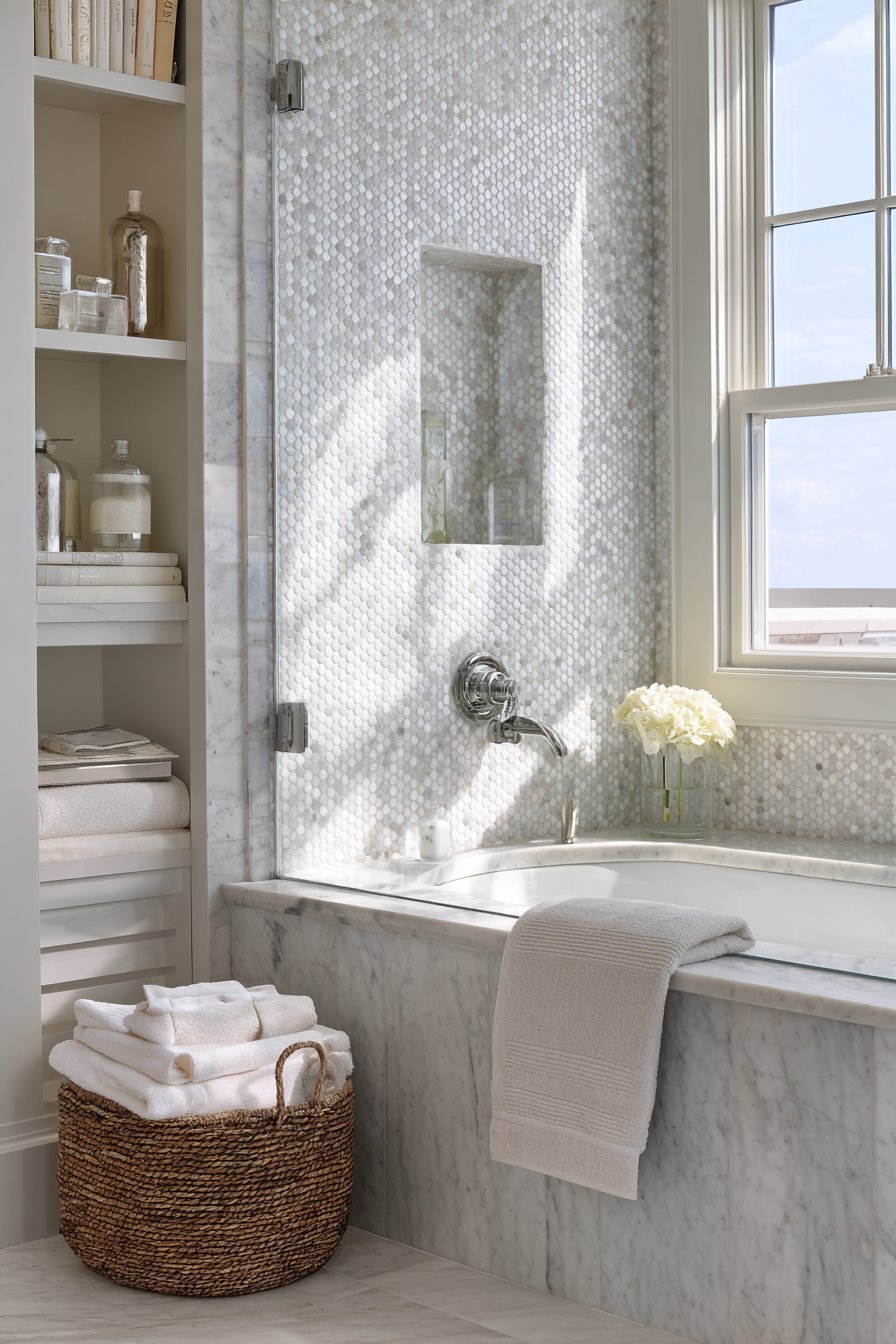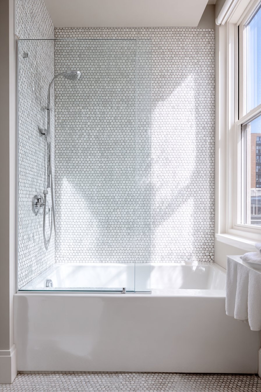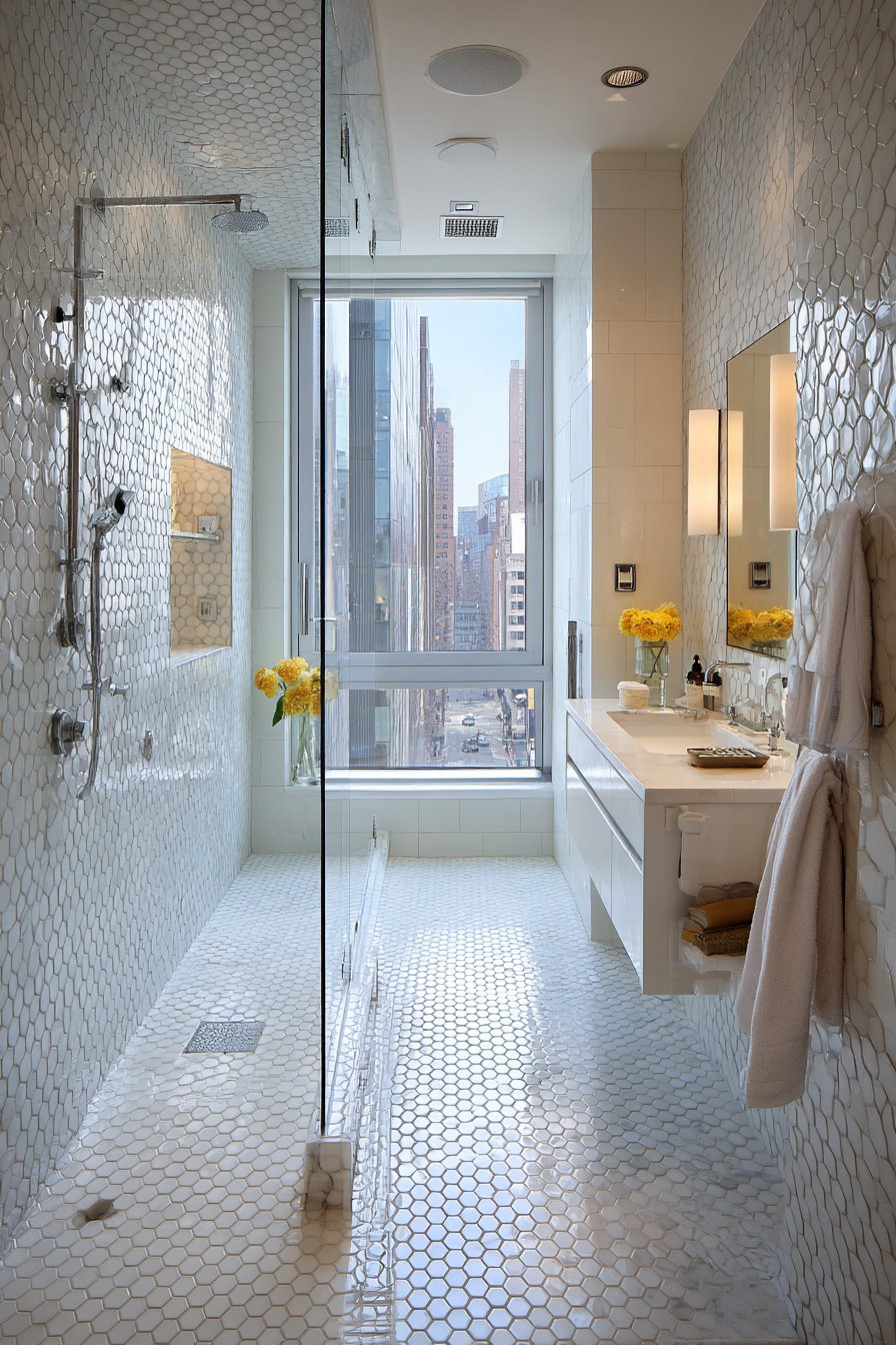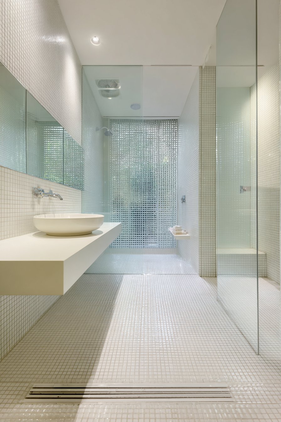 • Use large white tiles to create continuity and reduce visual busy-ness