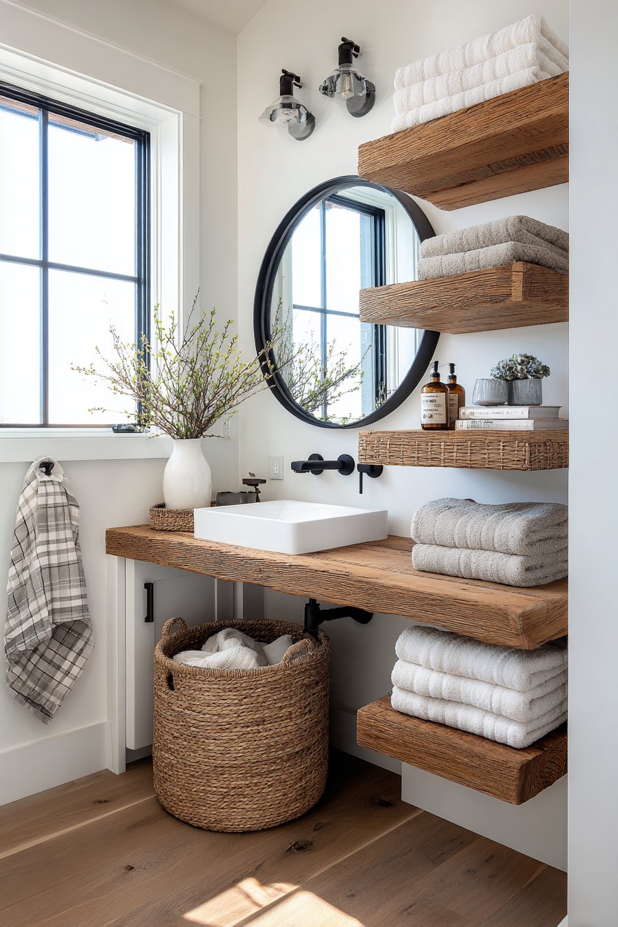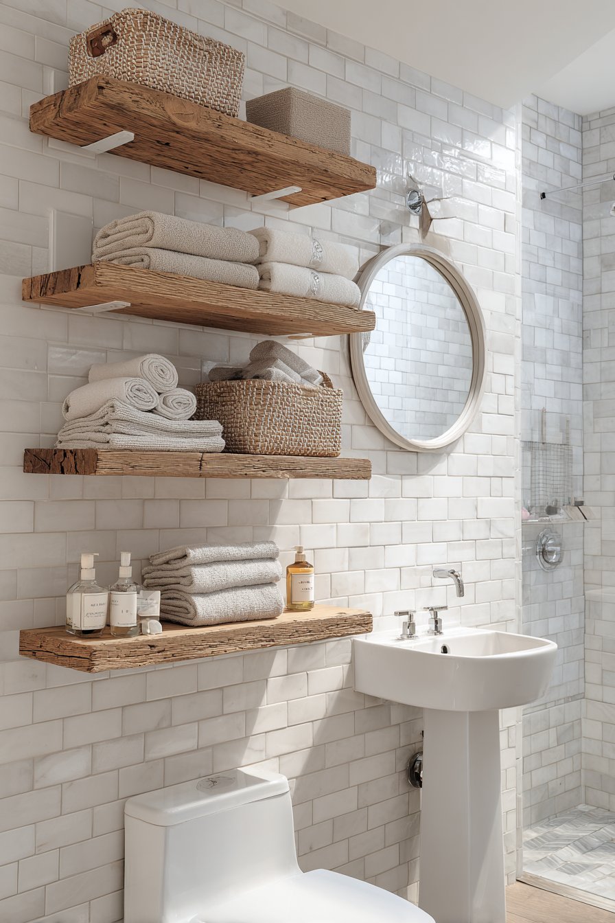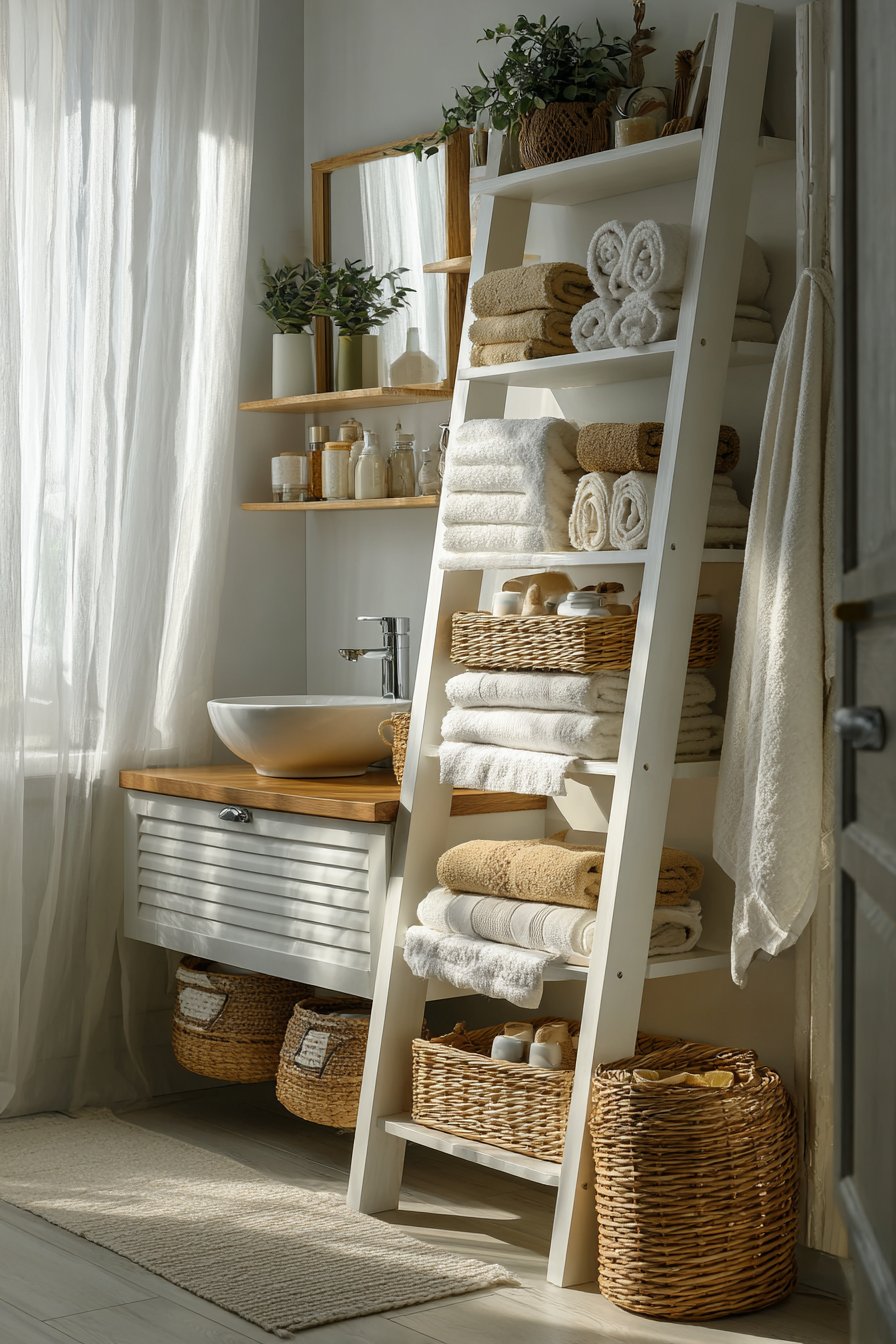 The strategic arrangement of items on ladder shelving represents an art form in itself—rolled towels create cylindrical forms that fit efficiently on narrow shelves, while woven baskets contain smaller items that might otherwise create visual clutter. Small plants introduce life and color to the bathroom environment, improving air quality while adding organic shapes that soften the hard edges of typical bathroom fixtures and tilework. Light wood flooring adds warmth to the predominantly white palette, preventing the sterile institutional feeling that all-white bathrooms can sometimes project.