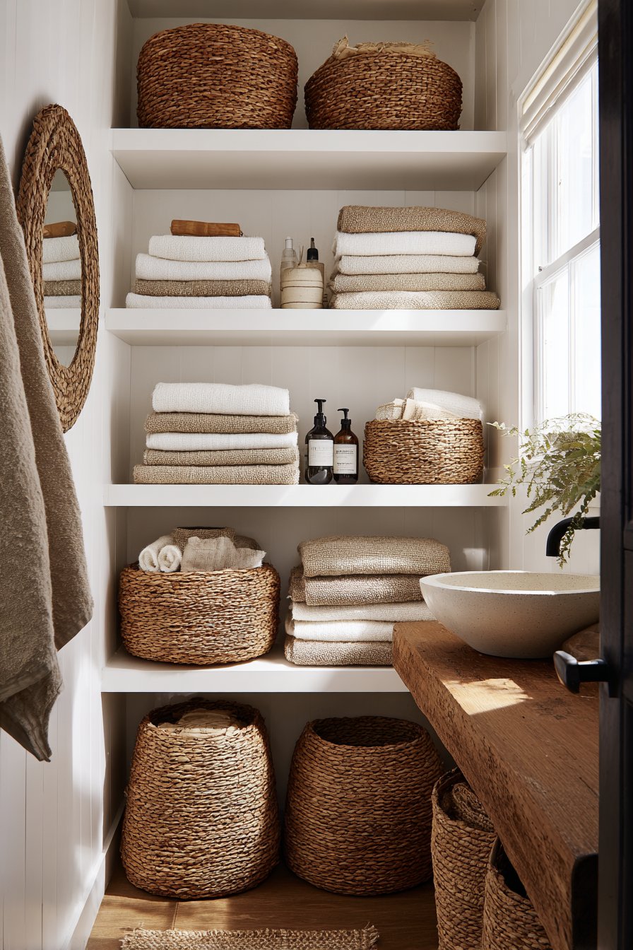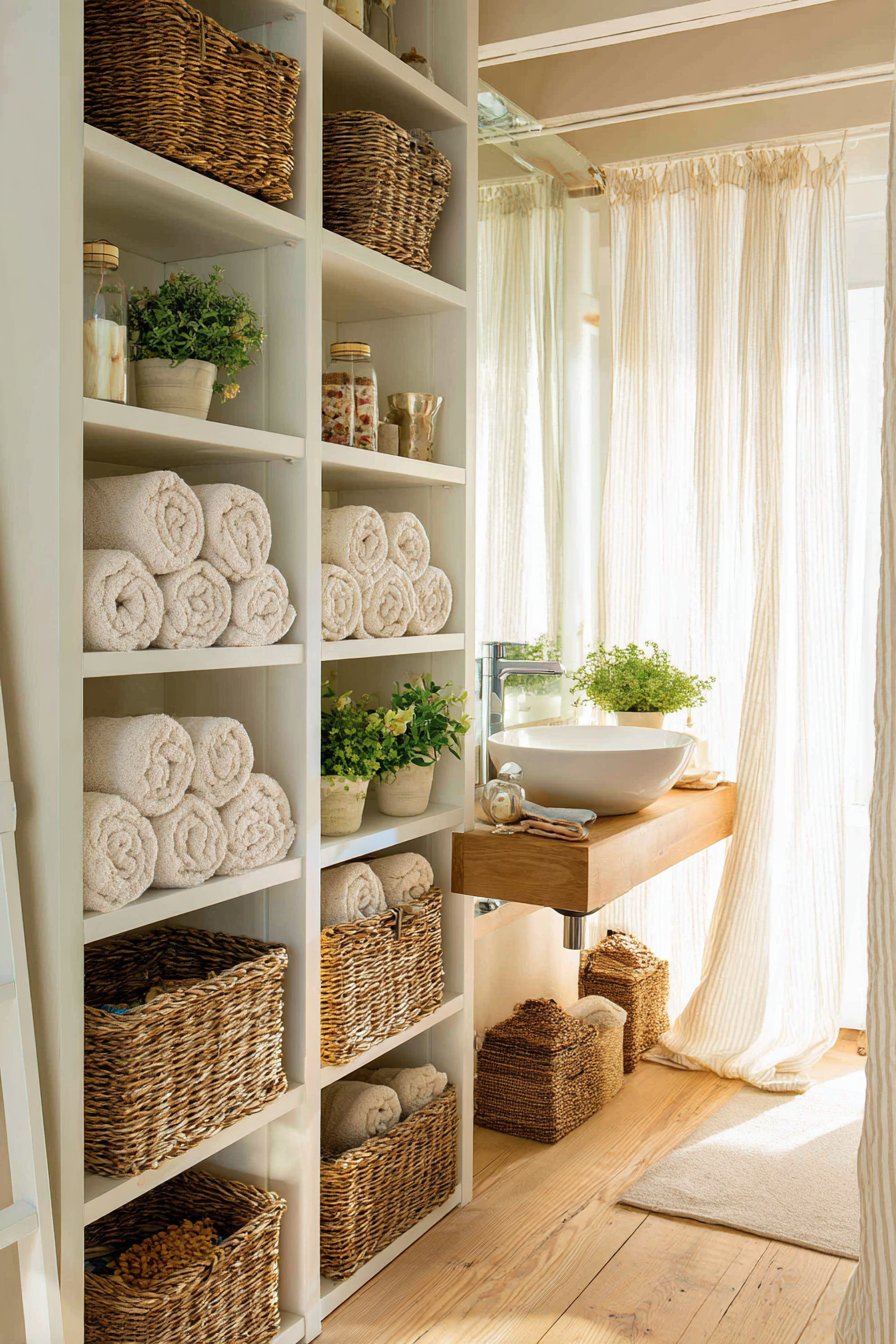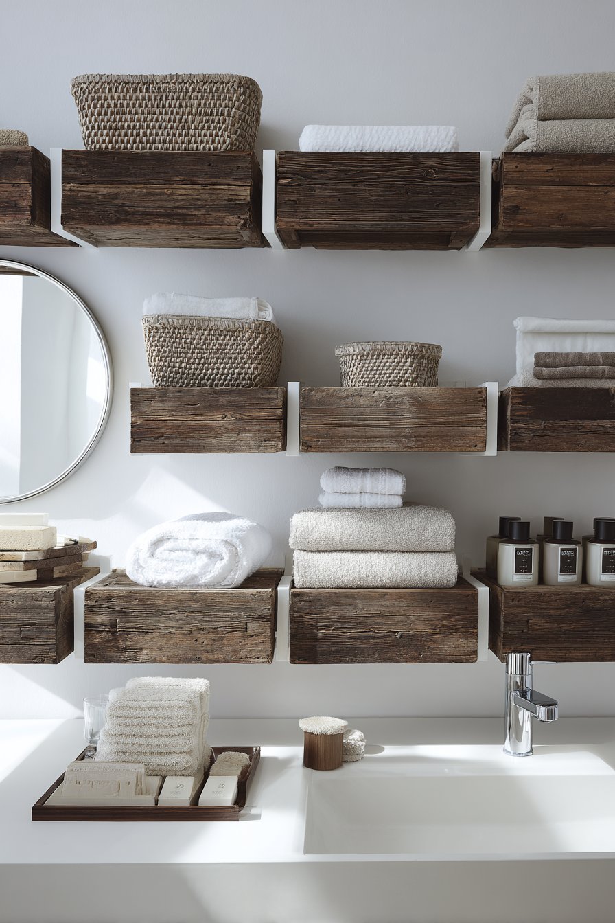 • Incorporate storage for bath accessories like wooden buckets or loofahs