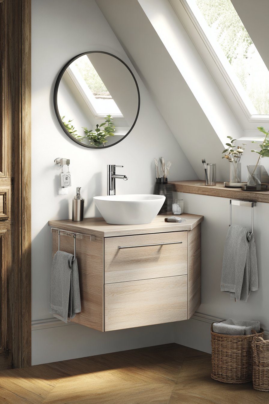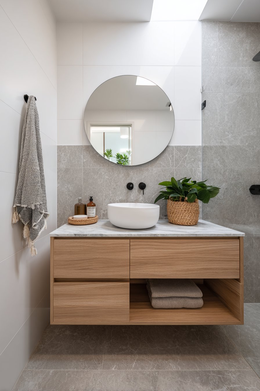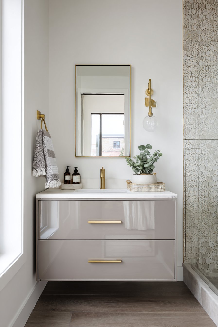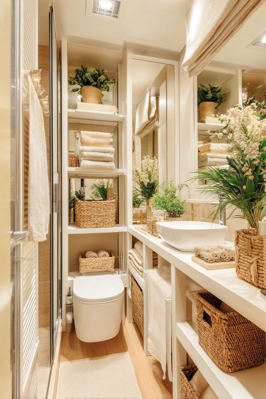 • Incorporate small plants that thrive in bathroom humidity like pothos or ferns