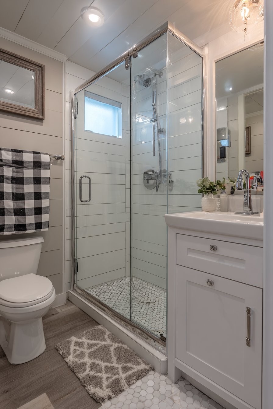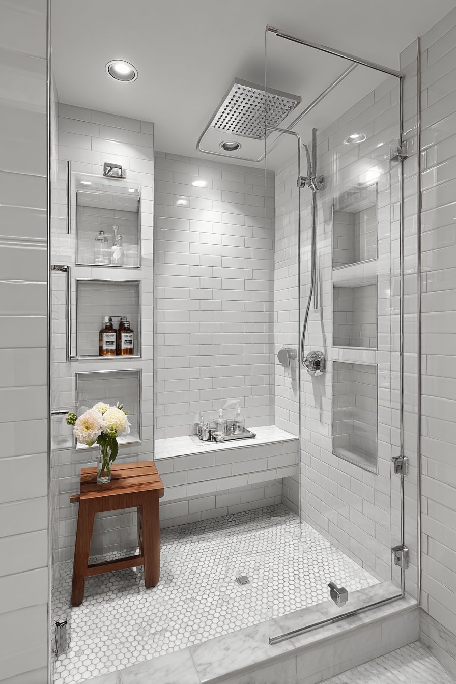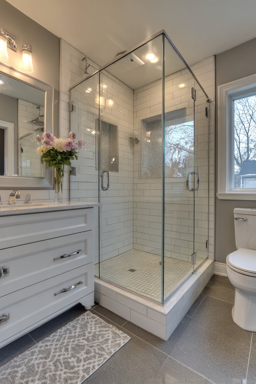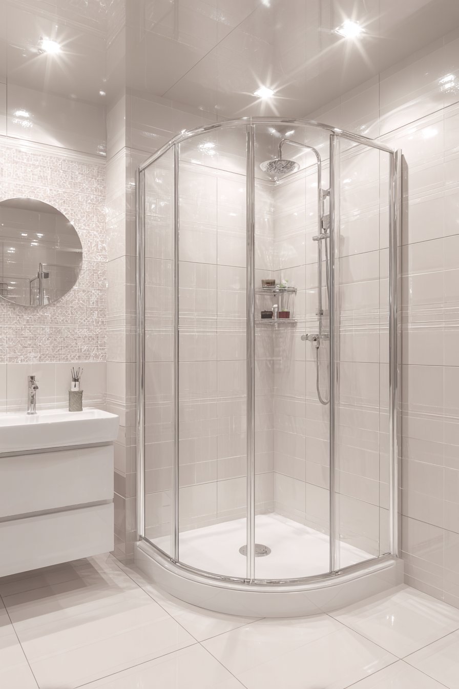 Surrounding white large-format tiles with minimal grout lines create continuity across the shower surfaces, their expansive planes preventing the visual fragmentation that numerous small tiles would create in the compact space. Chrome fixtures and a rainfall showerhead add style and luxury touches that elevate the shower beyond purely functional status. Recessed ceiling light provides illumination without protruding into the limited overhead space where a surface-mounted fixture would create visual clutter and potential head-strike hazards.