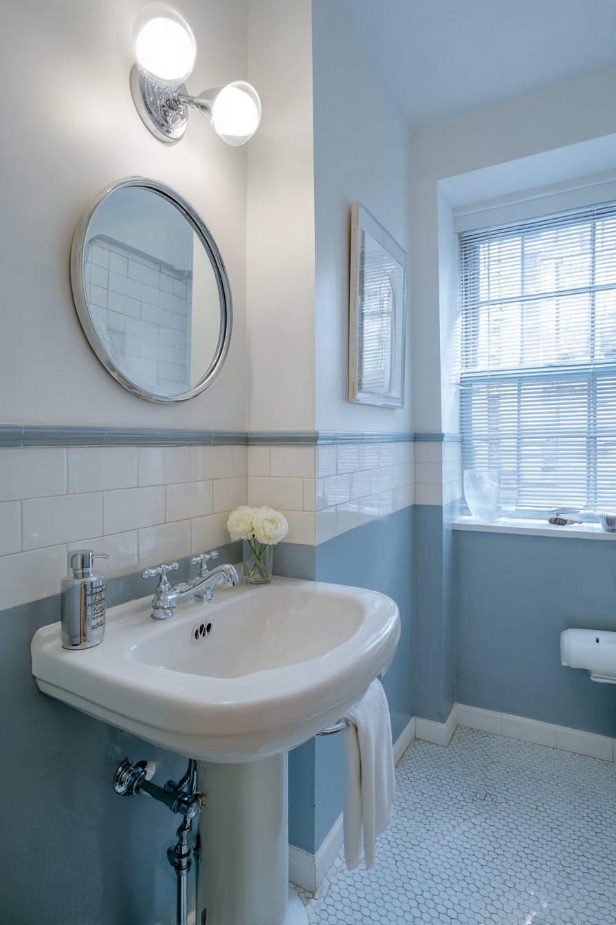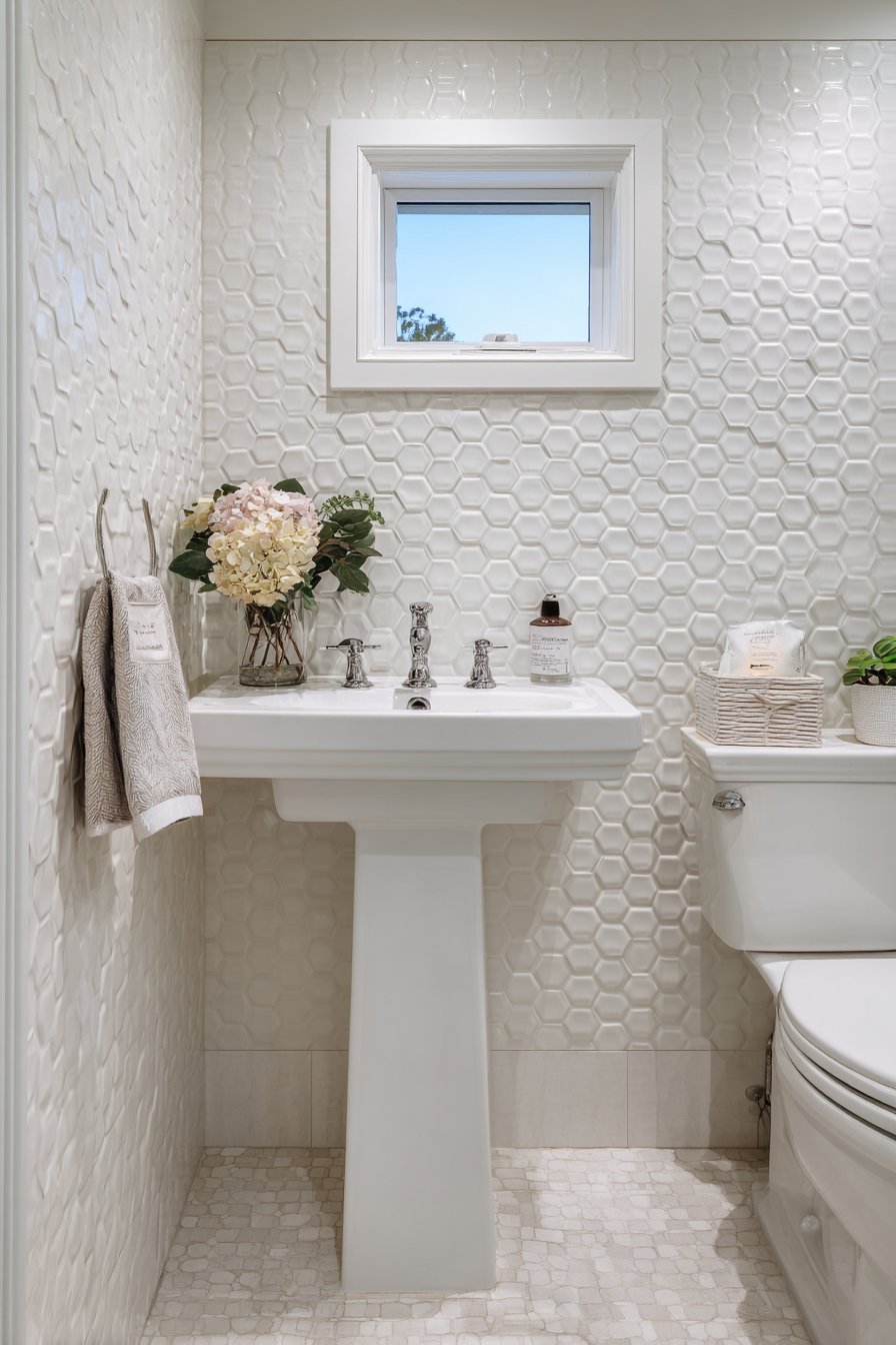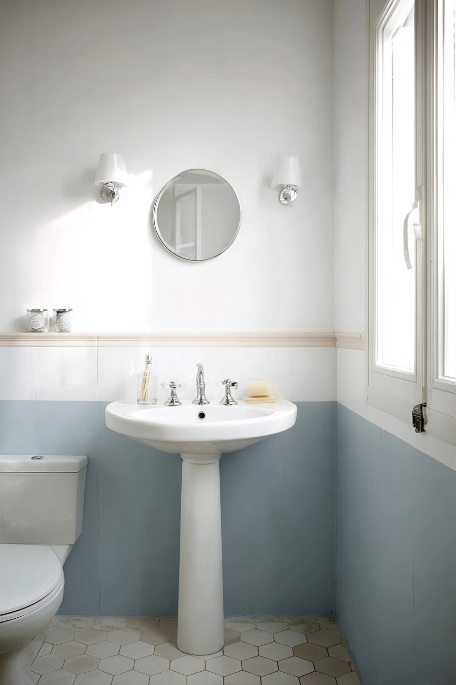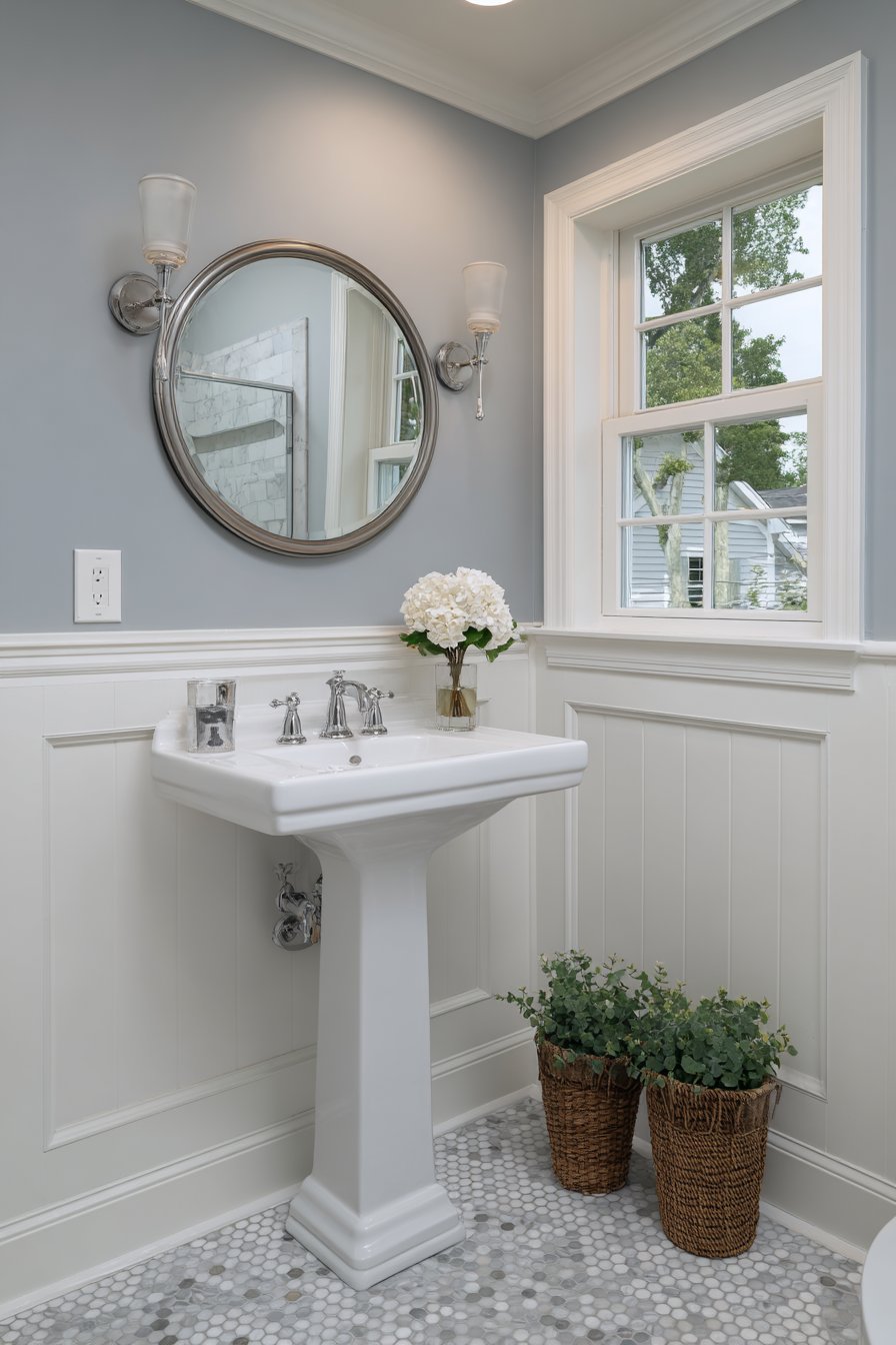 A white pedestal sink, chrome fixtures, and a compact round mirror maintain simplicity, allowing the wall treatment to provide the visual interest rather than competing with elaborate fixtures or multiple design elements. White hexagonal floor tiles add subtle pattern at foot level without overwhelming the vertical surfaces with competing visual information. Natural light through a privacy window enhances the color division, creating subtle variations in how each paint color appears throughout the day as light conditions change.