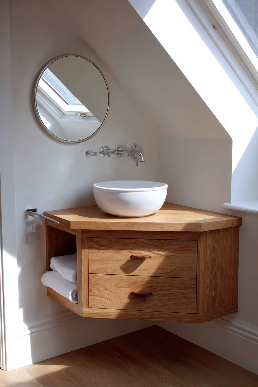 The strategic use of corner spaces represents one of the most effective approaches to tiny bathroom design, particularly when working with extremely limited floor plans of 40 square feet or less. A corner-mounted sink with a triangular vanity capitalizes on what is often underutilized space, creating a functional washing area without encroaching on the central floor area that’s essential for movement and accessibility. This configuration works exceptionally well in powder rooms or basement bathrooms where every square inch matters.