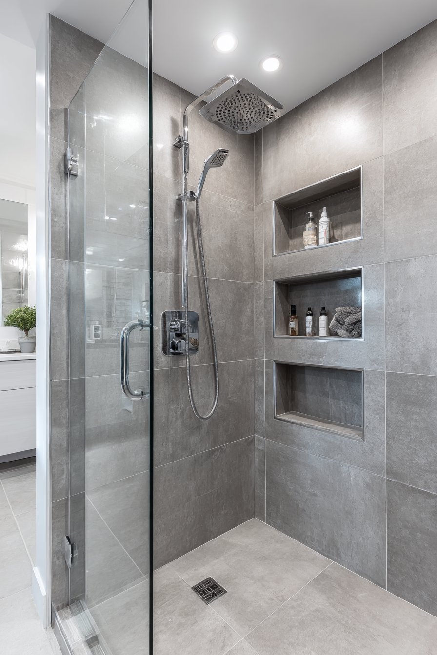 Built-in tile niches deserve special attention in tiny bathrooms because they provide essential storage without sacrificing any floor space or protruding into the shower area where every inch of elbow room counts. These recessed compartments can be incorporated during the tile installation process, creating seamless storage solutions that hold shampoo bottles, soap, and other shower essentials without requiring caddies or corner shelves that would make the shower feel more cramped. The choice of light grey porcelain tiles with minimal grout lines creates visual continuity across surfaces, an important consideration when you want to avoid the choppy, busy look that can make small spaces feel even smaller.