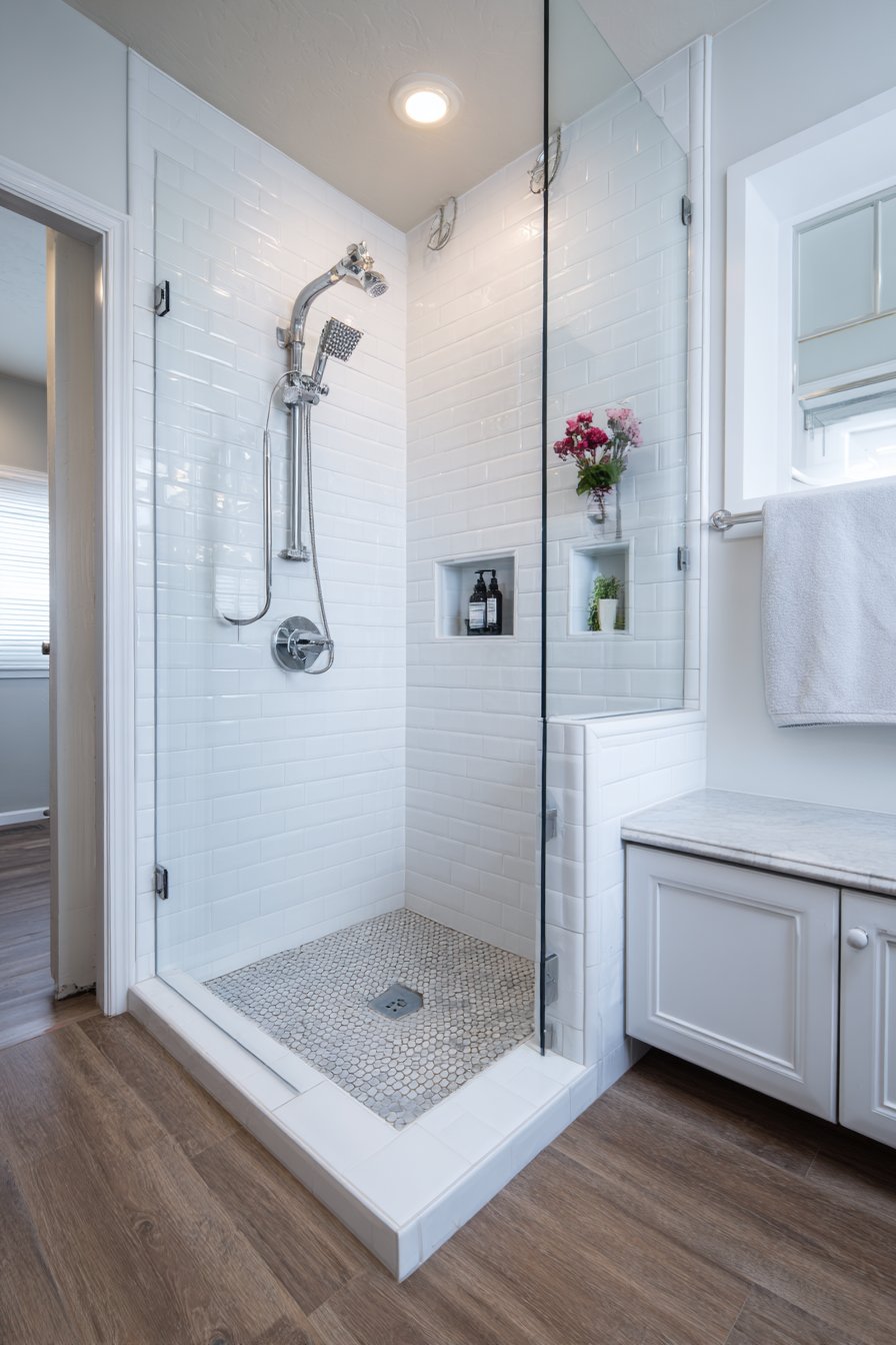 • Use consistent tile throughout the shower and bathroom floor for maximum continuity