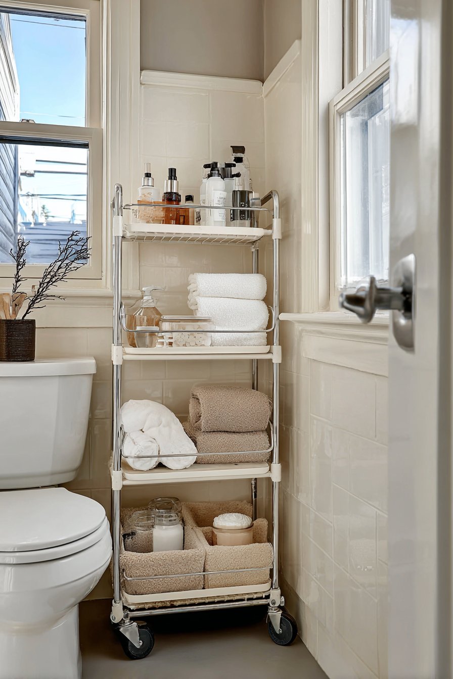 When horizontal space is limited, the only direction to build is up, making vertical storage solutions essential in tiny bathroom design. Floor-to-ceiling white ladder shelving creates a striking visual element that draws the eye upward, effectively making the ceiling feel higher while providing ample storage for rolled towels, small plants, woven baskets, and other bathroom essentials. This open shelving approach avoids the closed-in feeling that traditional cabinetry can create in narrow bathrooms, maintaining visual lightness while still addressing practical storage needs.