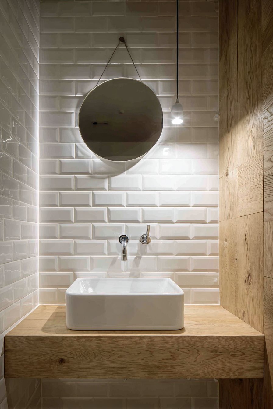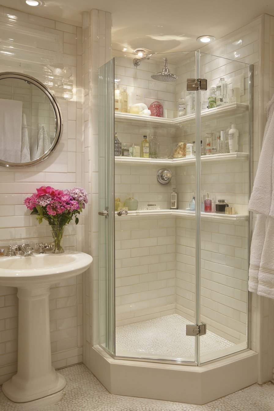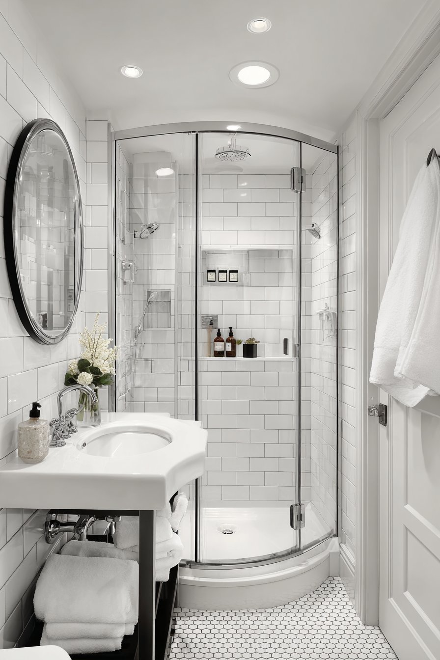 White beveled subway tiles create visual interest without overwhelming the compact space, their three-dimensional surface catching light and creating subtle shadows that add depth to what could otherwise be flat, uninteresting walls. Built-in corner shelves hold shower essentials without requiring hanging caddies or suction-cup organizers that can make small showers feel cluttered and temporary. A compact round mirror and small floating sink complete the efficient layout, each element carefully scaled to provide functionality without dominating the limited available wall space.