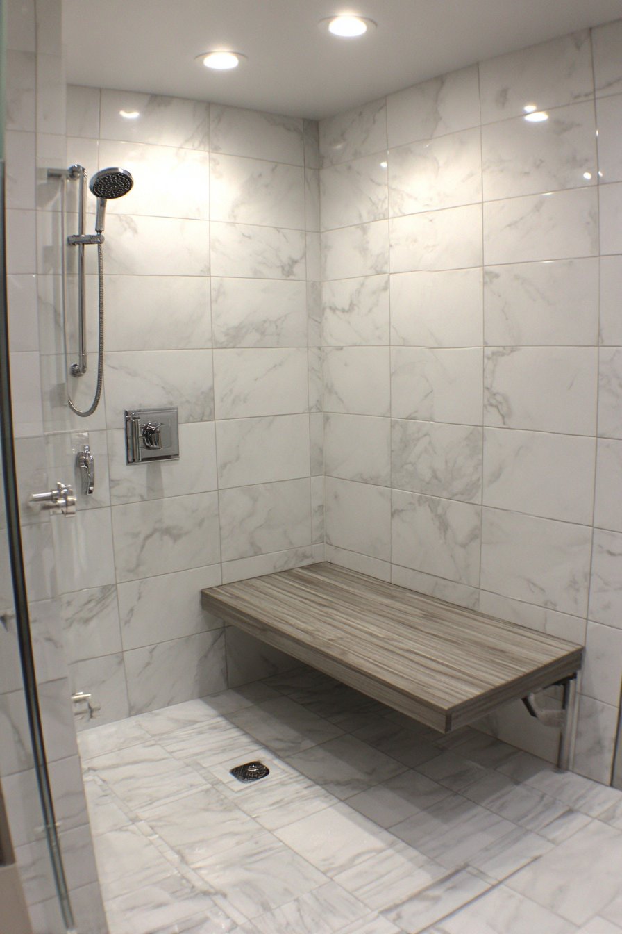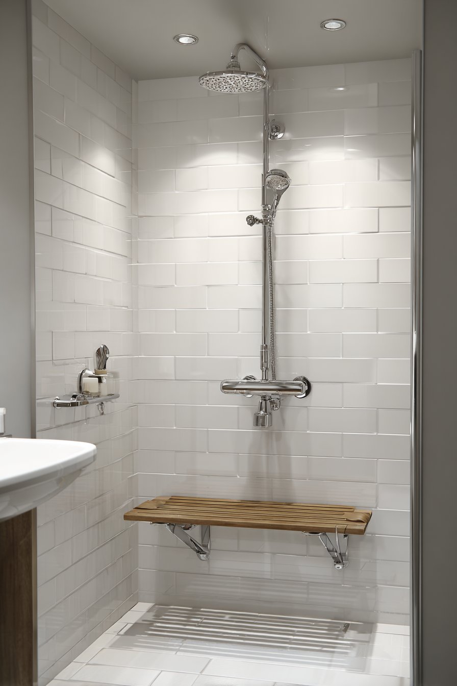 Interior photography captures the clever fold-away seating solution and practical design with attention to hardware details and tile work, showing how the seat mechanism operates smoothly while maintaining a low profile when folded against the wall. The installation requires proper backing within the wall structure to support both the mounting hardware and the weight of users, making this a renovation element best planned during construction or major remodeling when wall interiors are accessible.