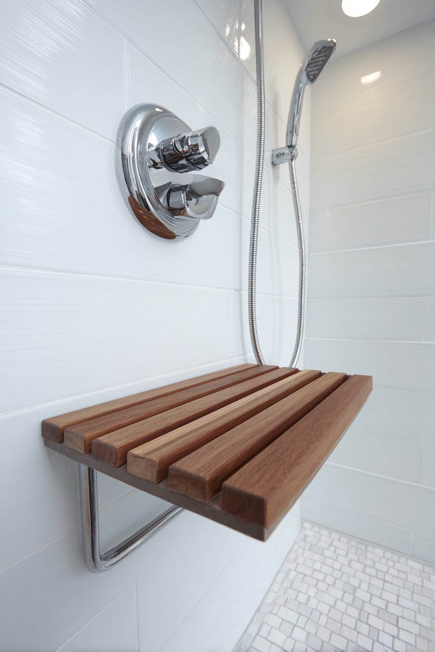 Accessibility features in bathrooms need not announce themselves as medical equipment, and modern fold-down shower seats demonstrate how universal design principles can integrate seamlessly into contemporary aesthetics. A wall-mounted shower seat with white teak wood slats provides seating during showering while folding away when not needed, maintaining the open feeling essential in a 4×4 foot shower. The white teak material matches the modern aesthetic while offering water resistance and the warm organic quality of wood.